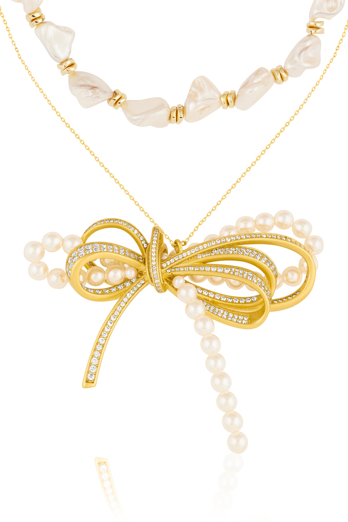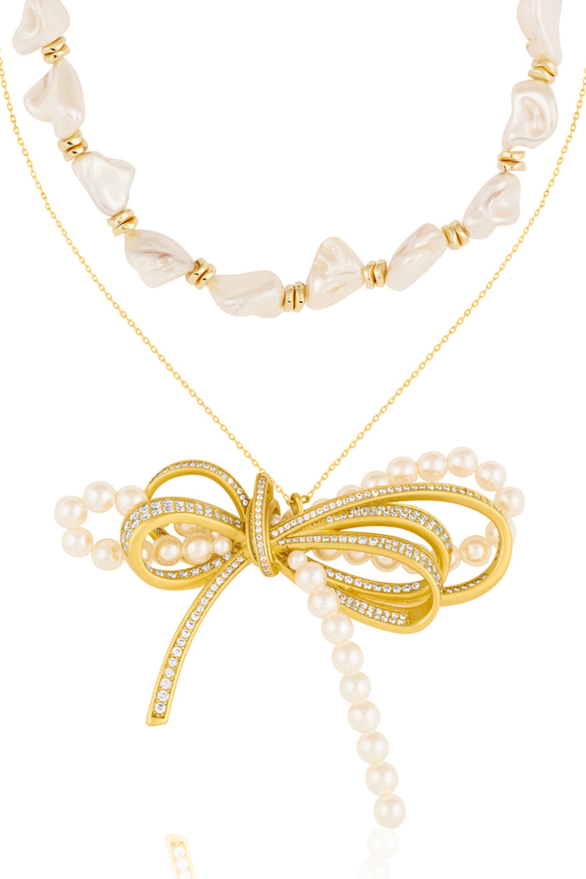 This vintage-inspired demure bow layered necklace is crafted in brass and plated with 18k gold. It features exquisite pearls and a cute bow pendant in double-layered chains to take the stress out of stacking. Style it with everything from heirloom sarees to cocktail dresses for every celebration.