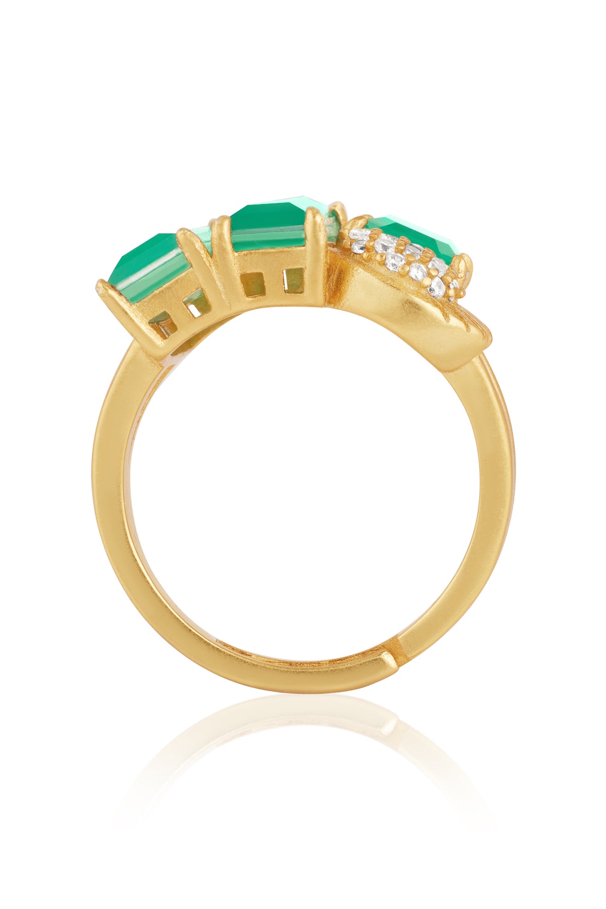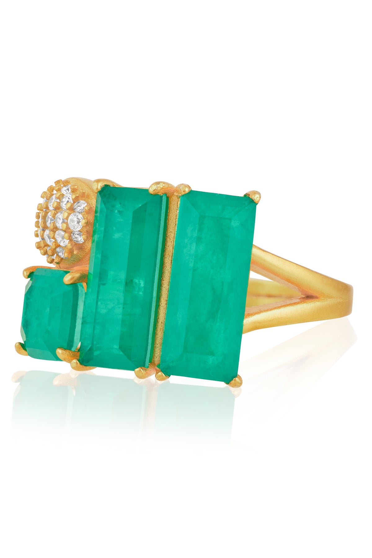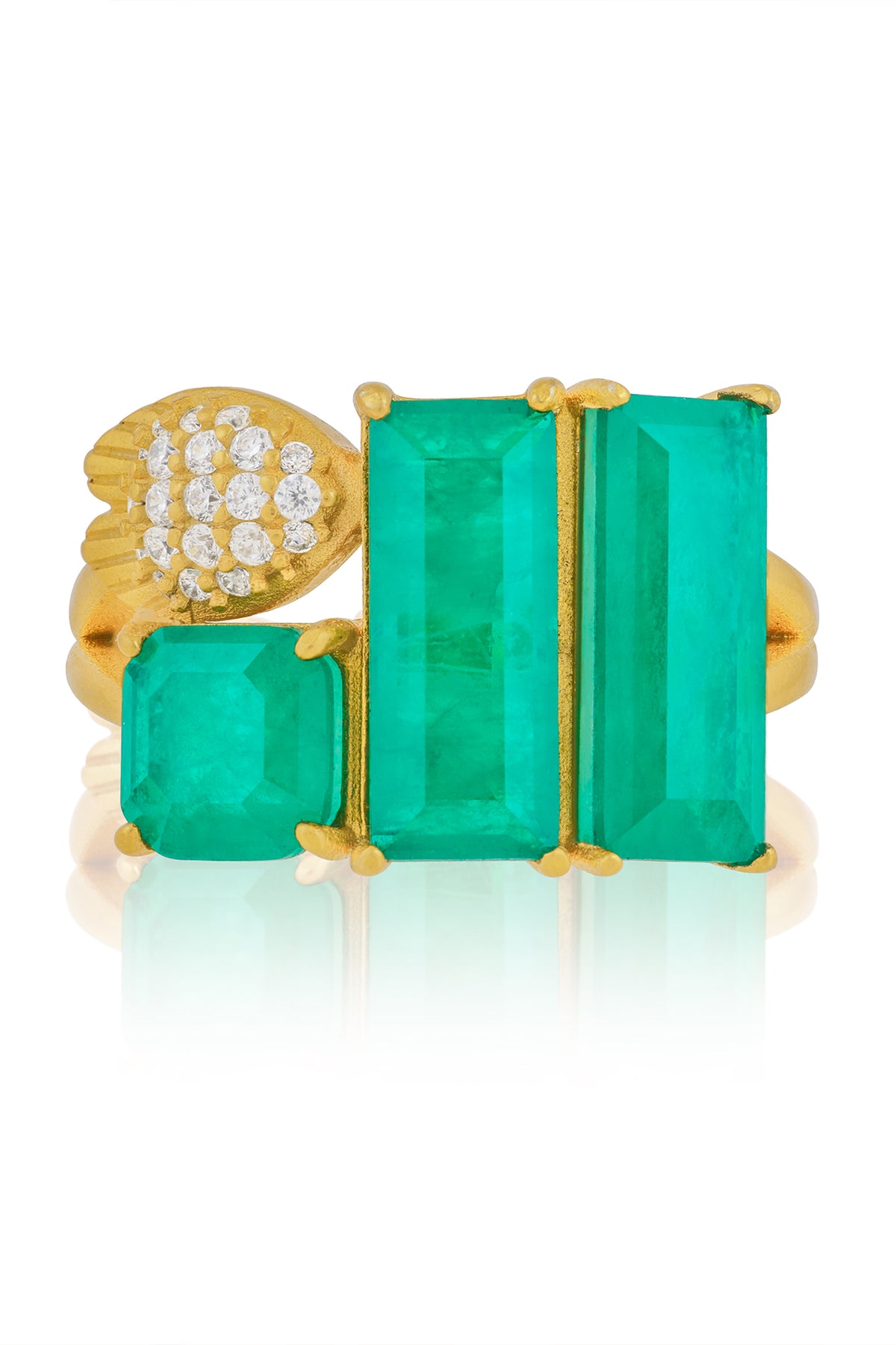 This vintage-inspired emerald dreams cocktail ring is crafted in brass and plated with 18k gold. It features exquisite green doublet stones in geometric settings and a supersized silhouette. Style it with everything from heirloom sarees to cocktail dresses for every celebration.