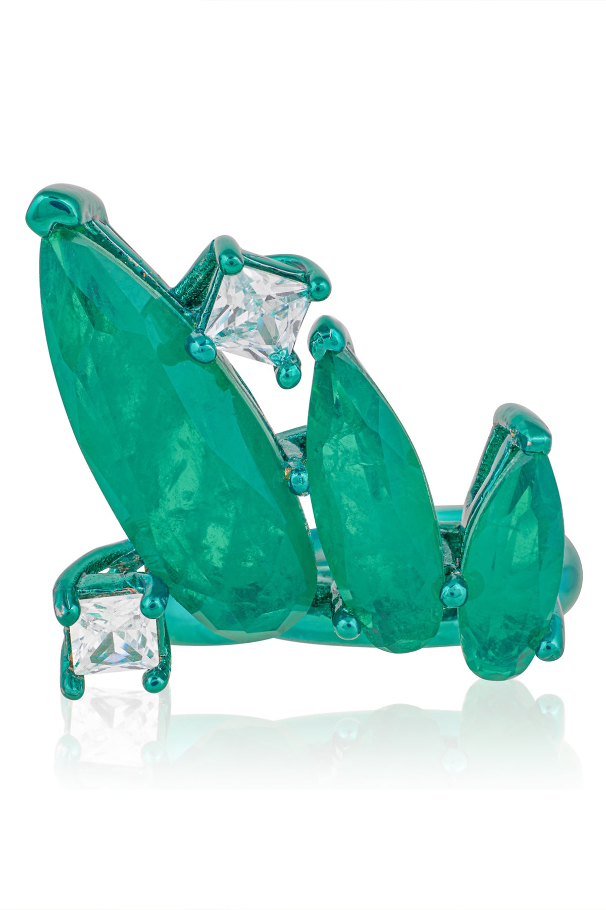 This vintage-inspired emerald flame cocktail ring is crafted in brass and plated with 18k gold. It features exquisite green doublet stones and a supersized silhouette. Style it with everything from heirloom sarees to cocktail dresses for every celebration.
