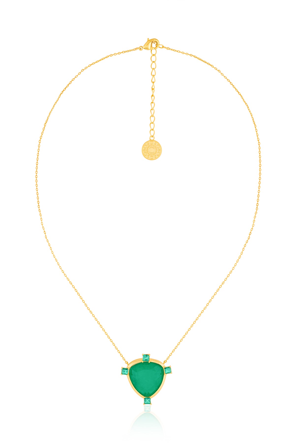 This vintage-inspired emerald mirros layered necklace is crafted in brass and plated with 18k gold. It features exquisite green doublet and mirror-work pendants with double-layered chains to take the stress out of stacking. Style it with everything from heirloom sarees to cocktail dresses for every celebration..