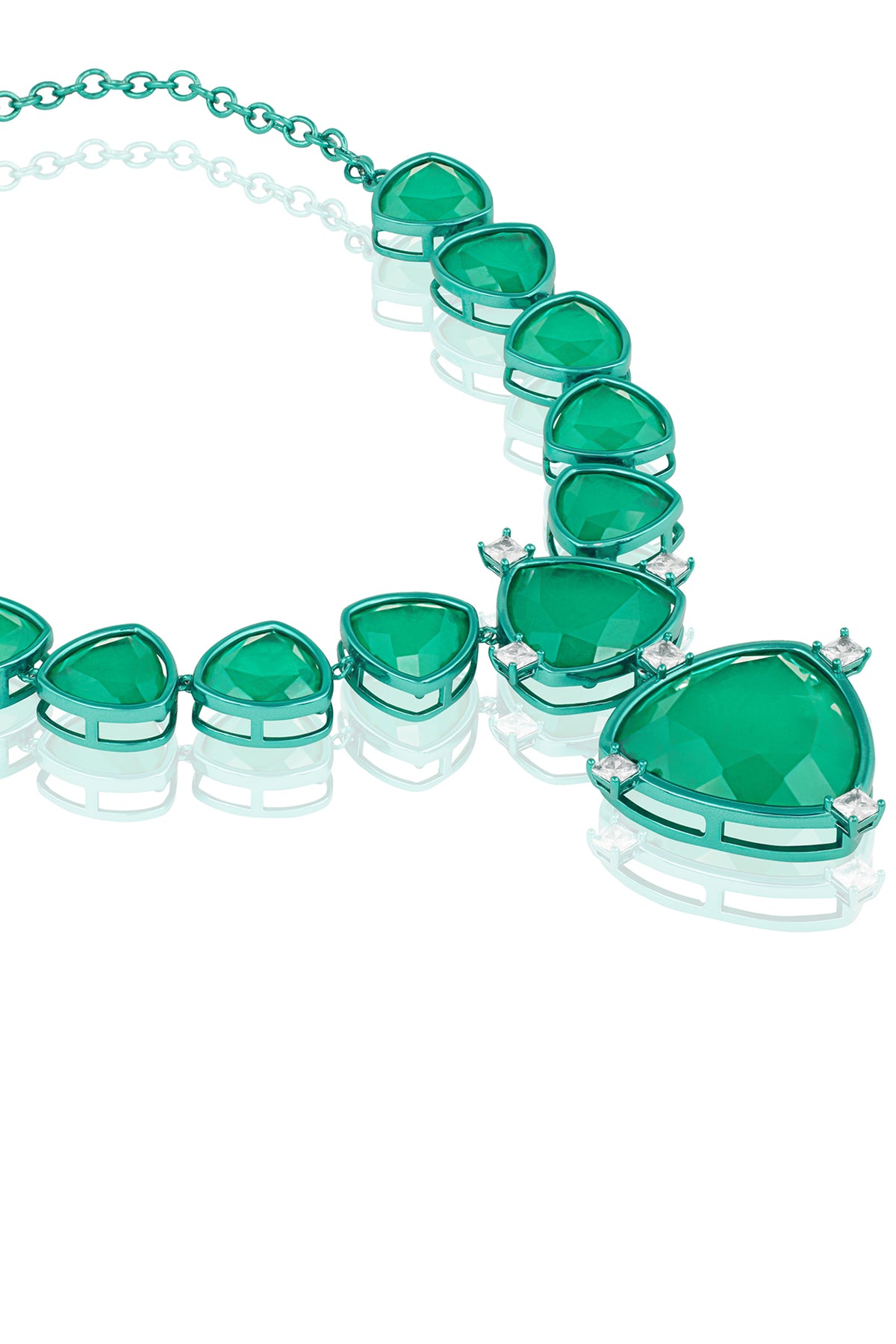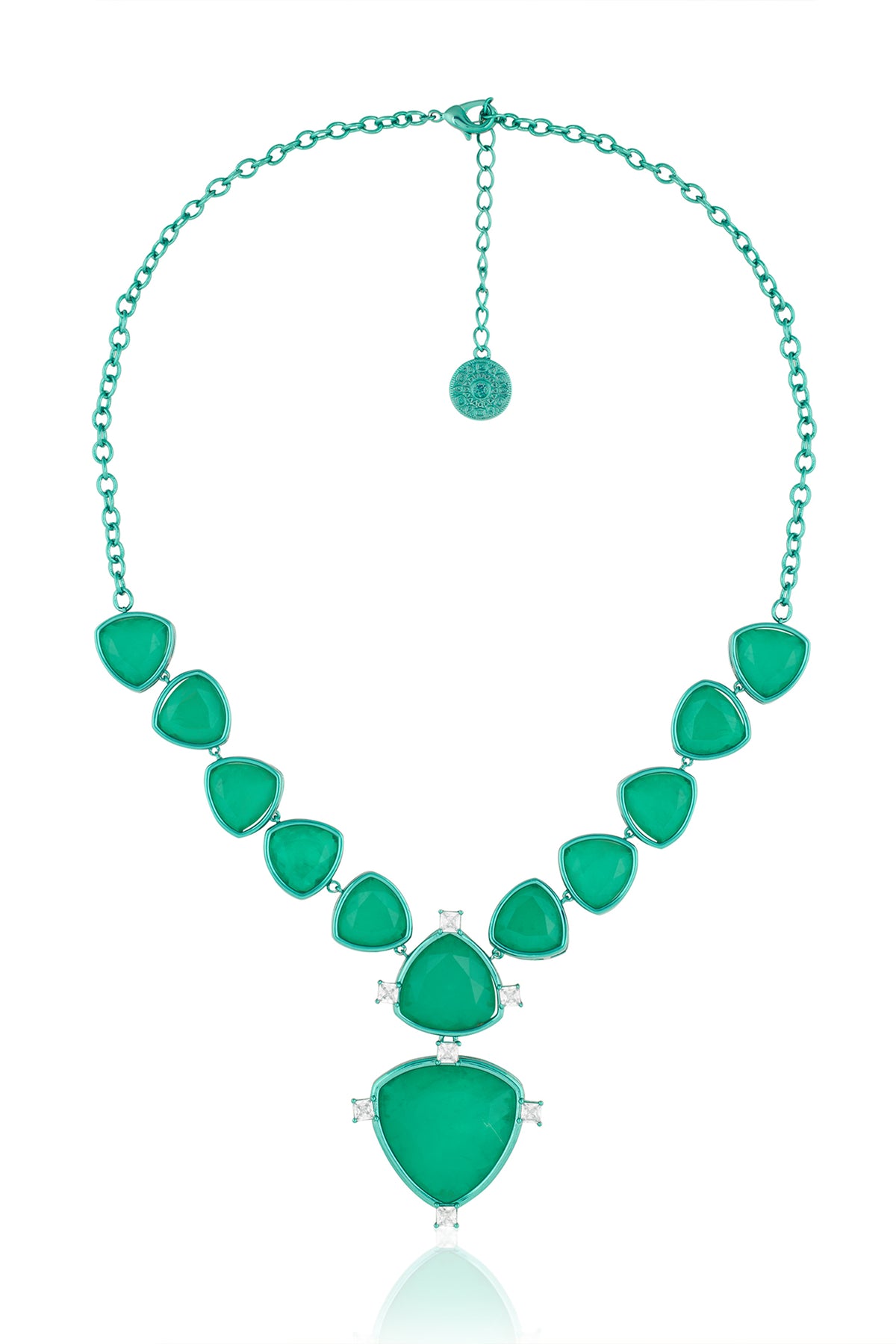 This vintage-inspired emerald flame choker necklace is crafted in brass and plated with 18k gold. It features exquisite green doublet stones in statement geometric settings. Style it with everything from heirloom sarees to cocktail dresses for every celebration.
