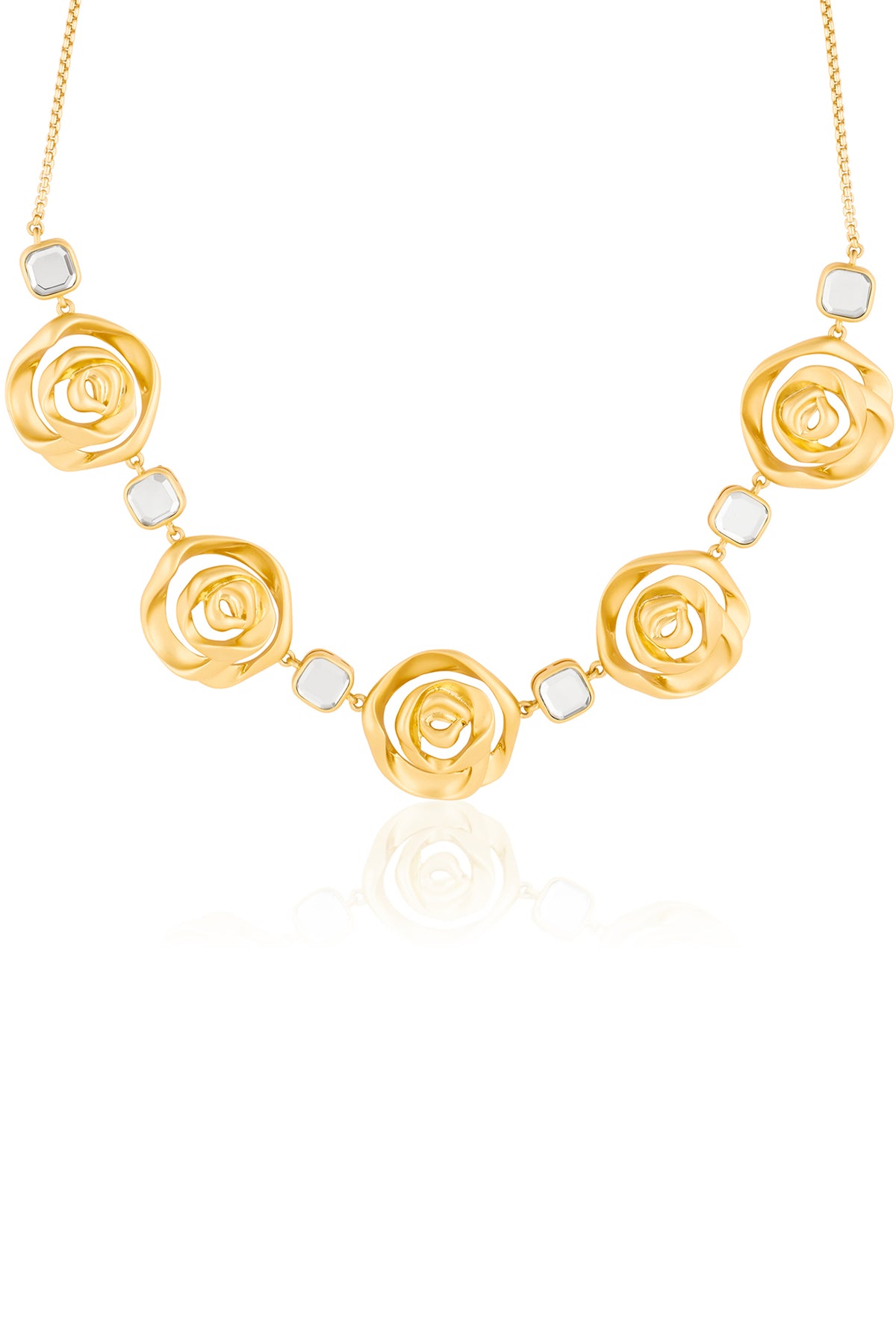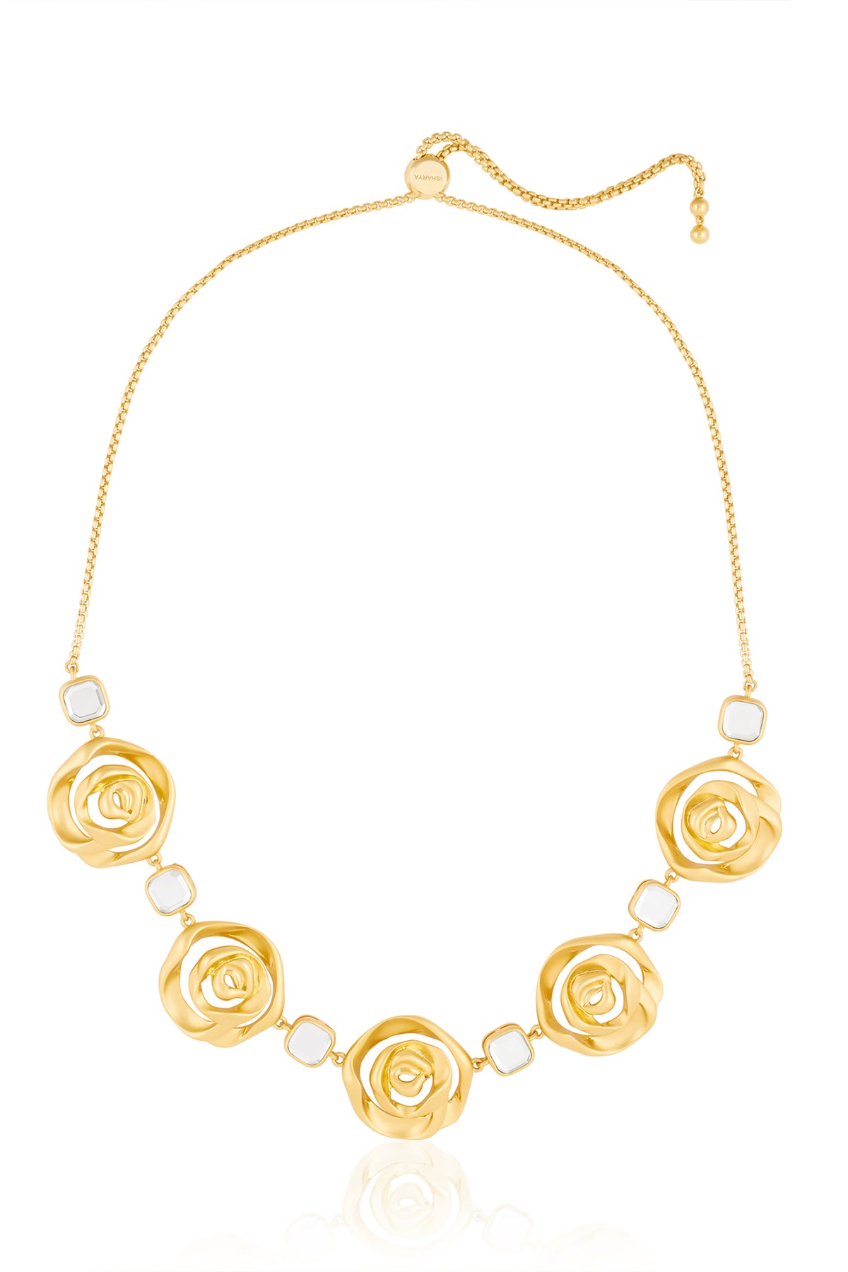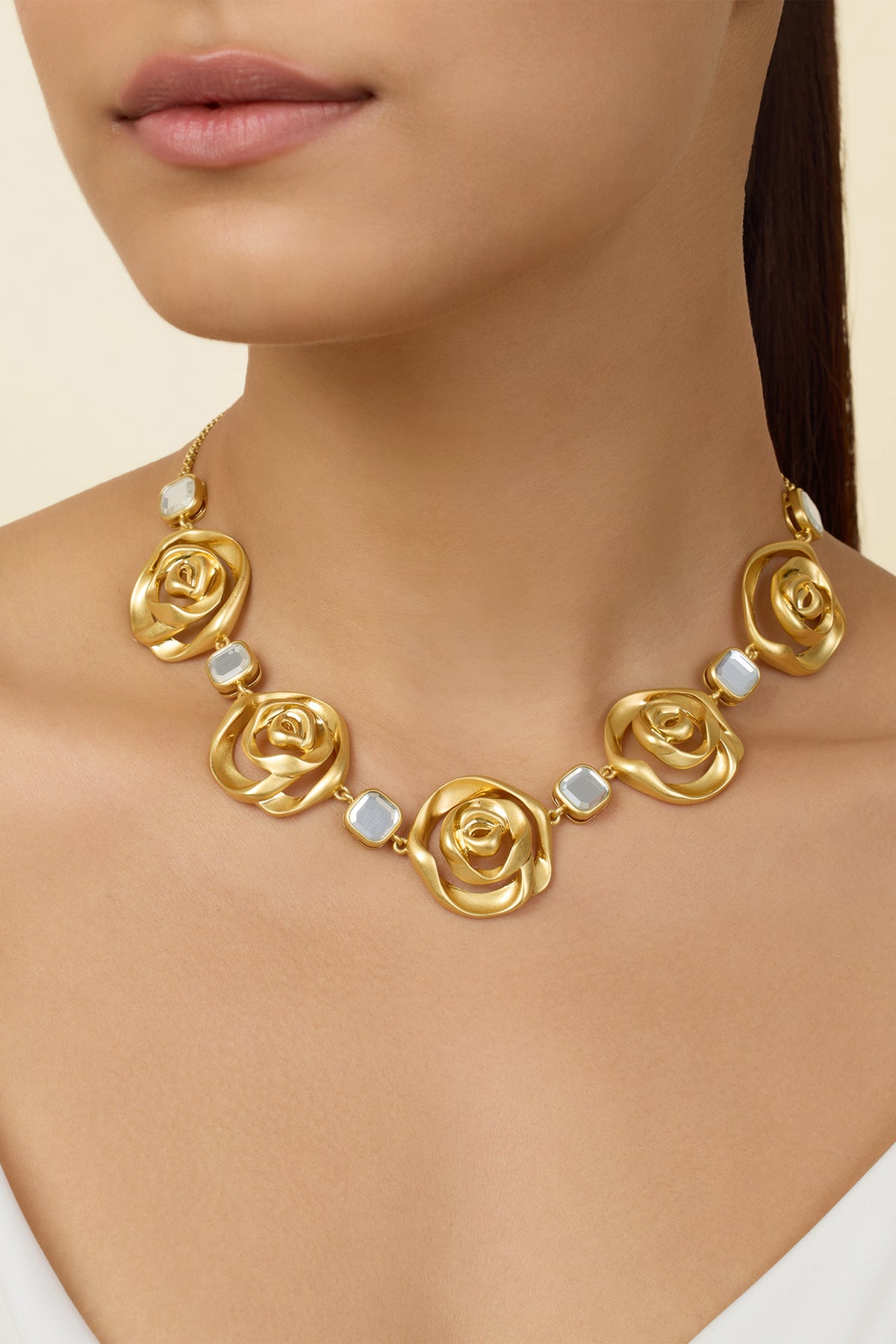 This vintage-inspired festive rosé collar necklace is crafted in brass and plated with 18k gold. It features exquisite mirror work and statement rose accents. Style it with everything from heirloom sarees to cocktail dresses for every celebration.