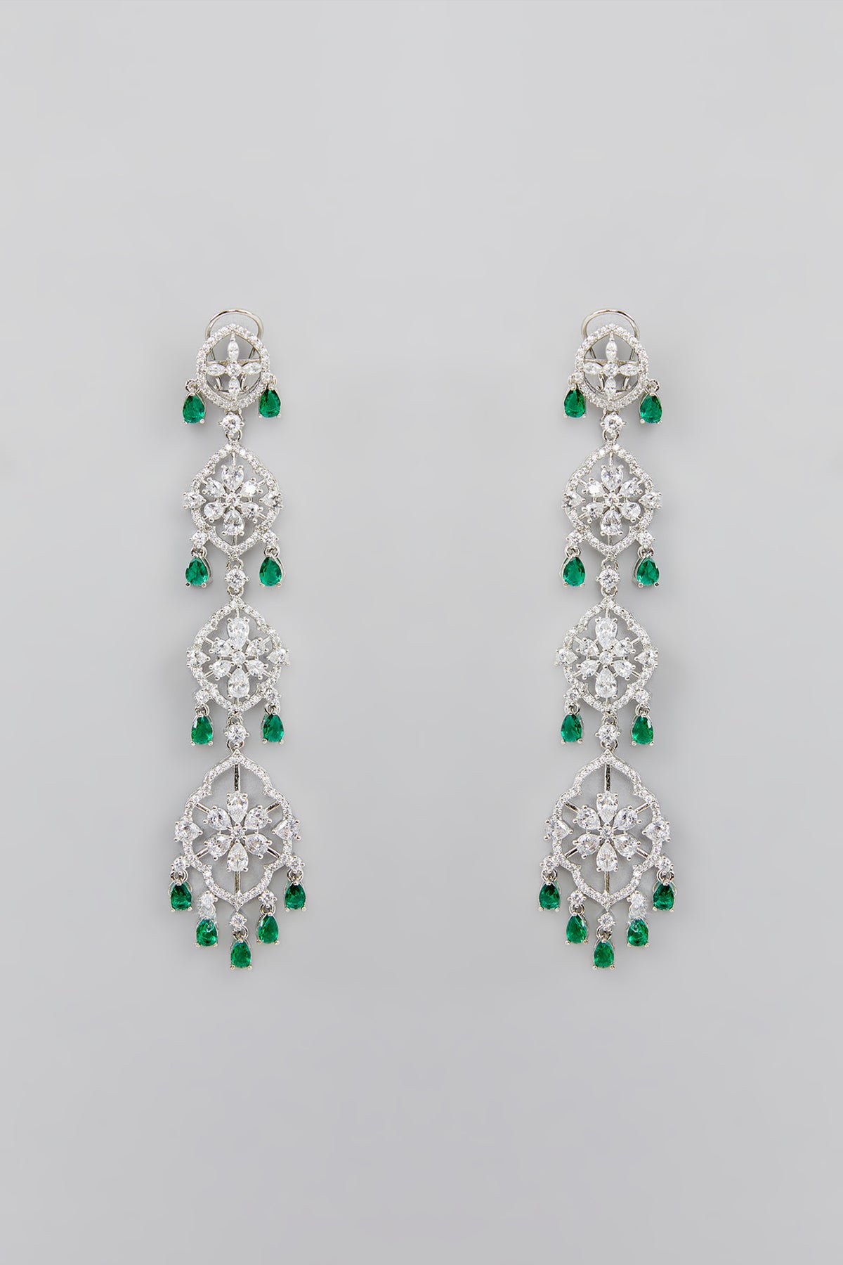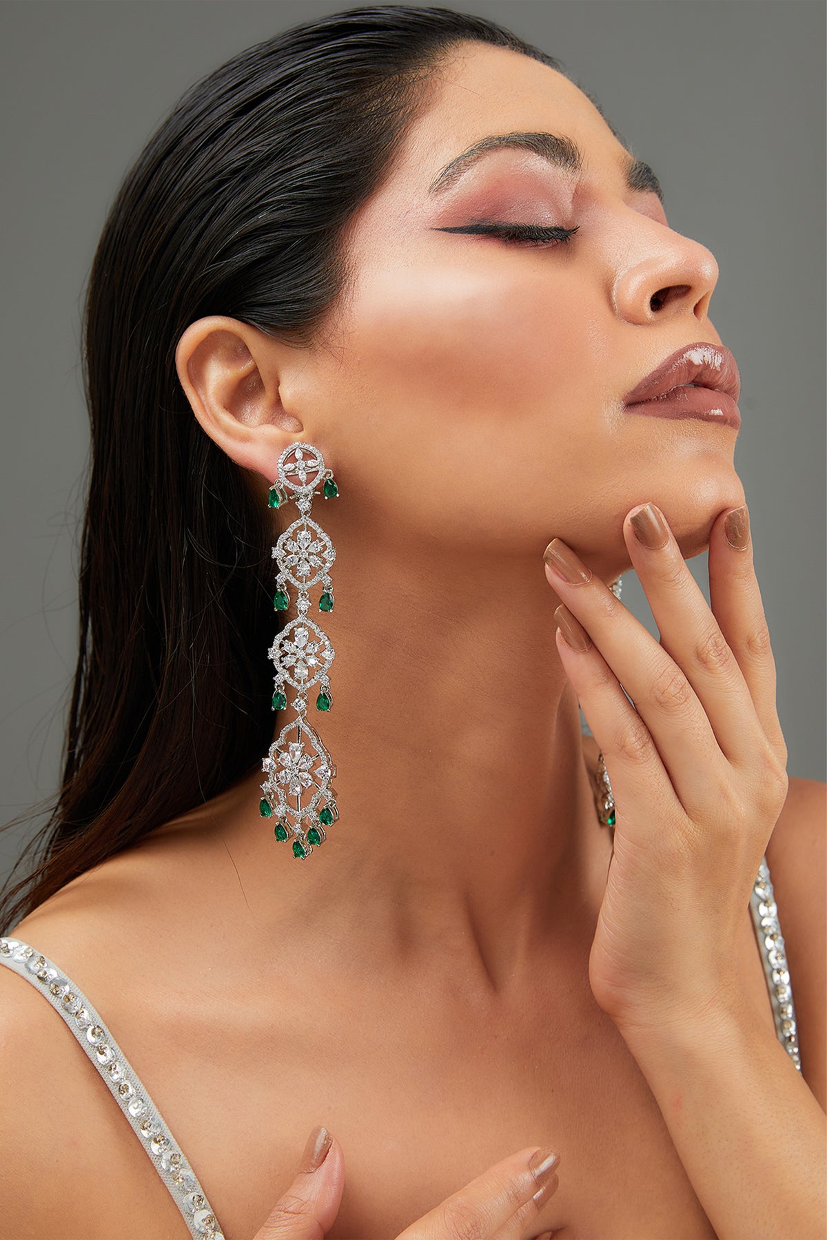 Featuring long diamond string danglers with white finish studded with small faux diamonds is a statement piece and looks ravishing with every outfit.
