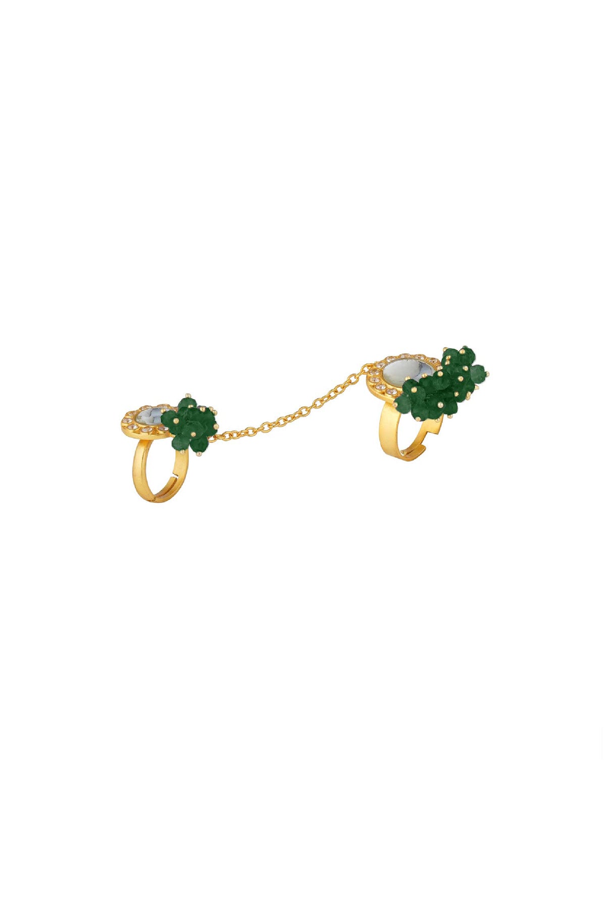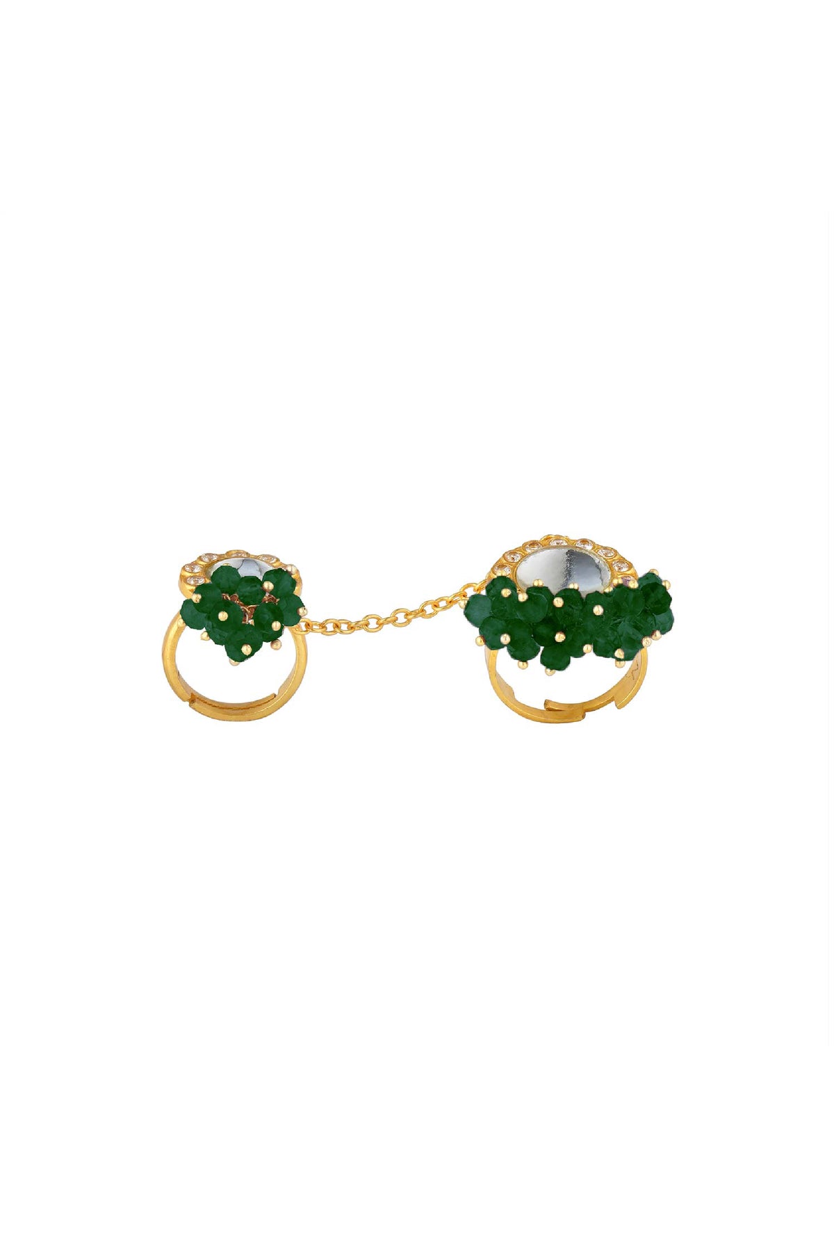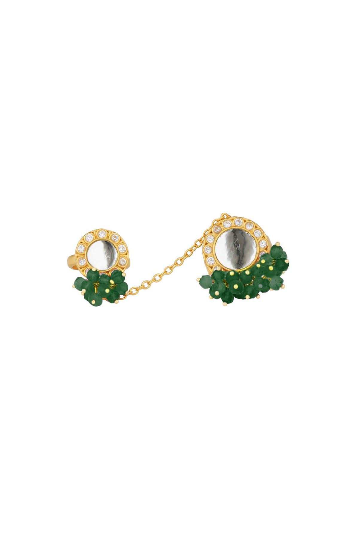 Dressy and elegant, this 22kt gold plated accessory is perfect for adorning and finishing your wedding party looks whether you are a bridemaid or a wedding guest. A combination of two rings which are connected with a delicate chain is an interesting combination to finish your wedding worthy looks. The rings radiate the subtle sheen of mirror polki work and are enhanced with green strawberry quartz beads.