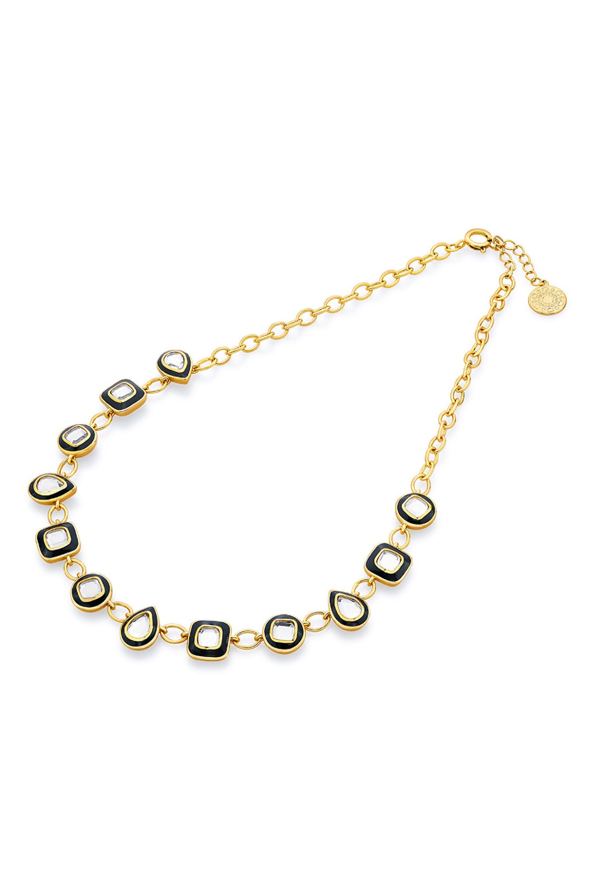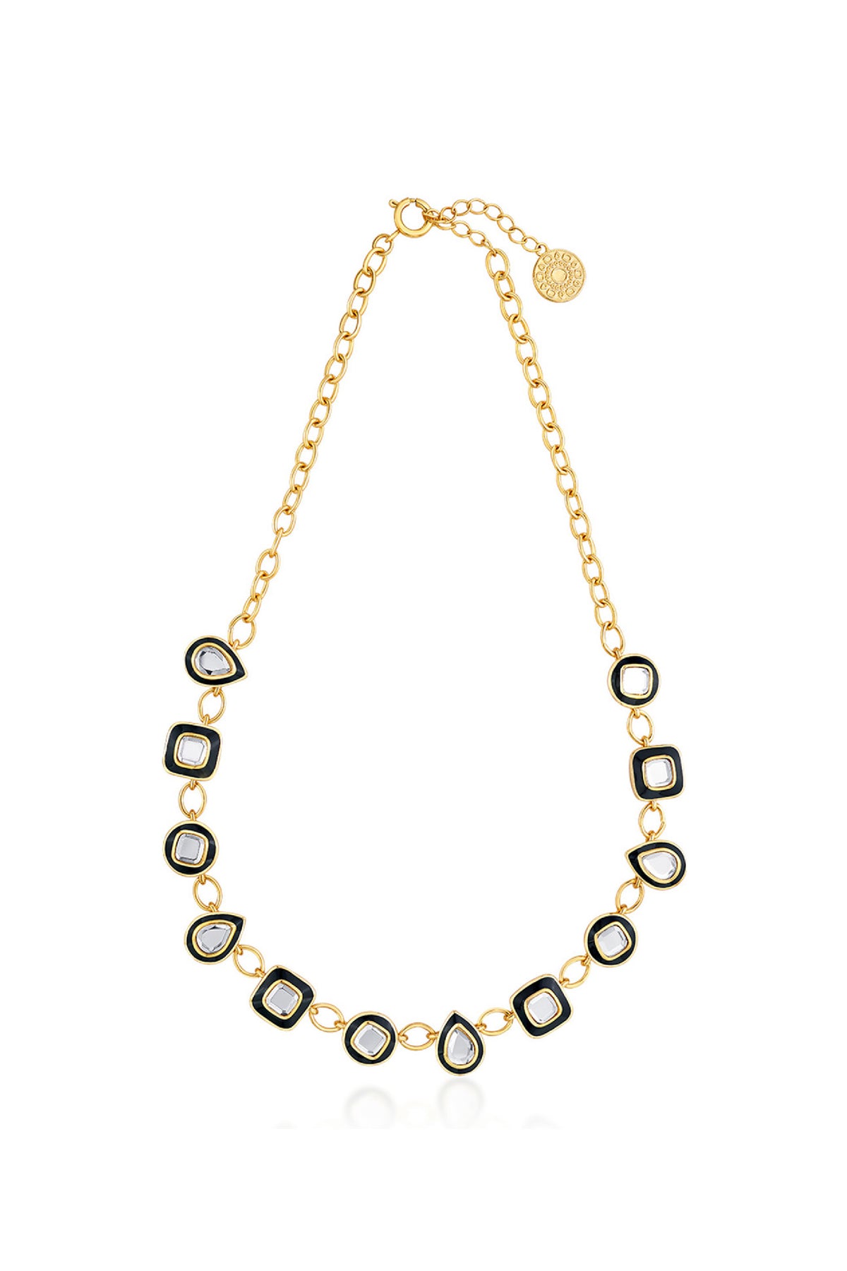 This sleek necklace is crafted with hand-cut mirrors accented with black enamel. For the minimalist at heart, this 18-karat gold-plated piece screams glamour and grace.