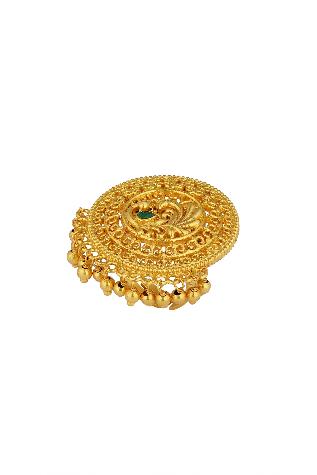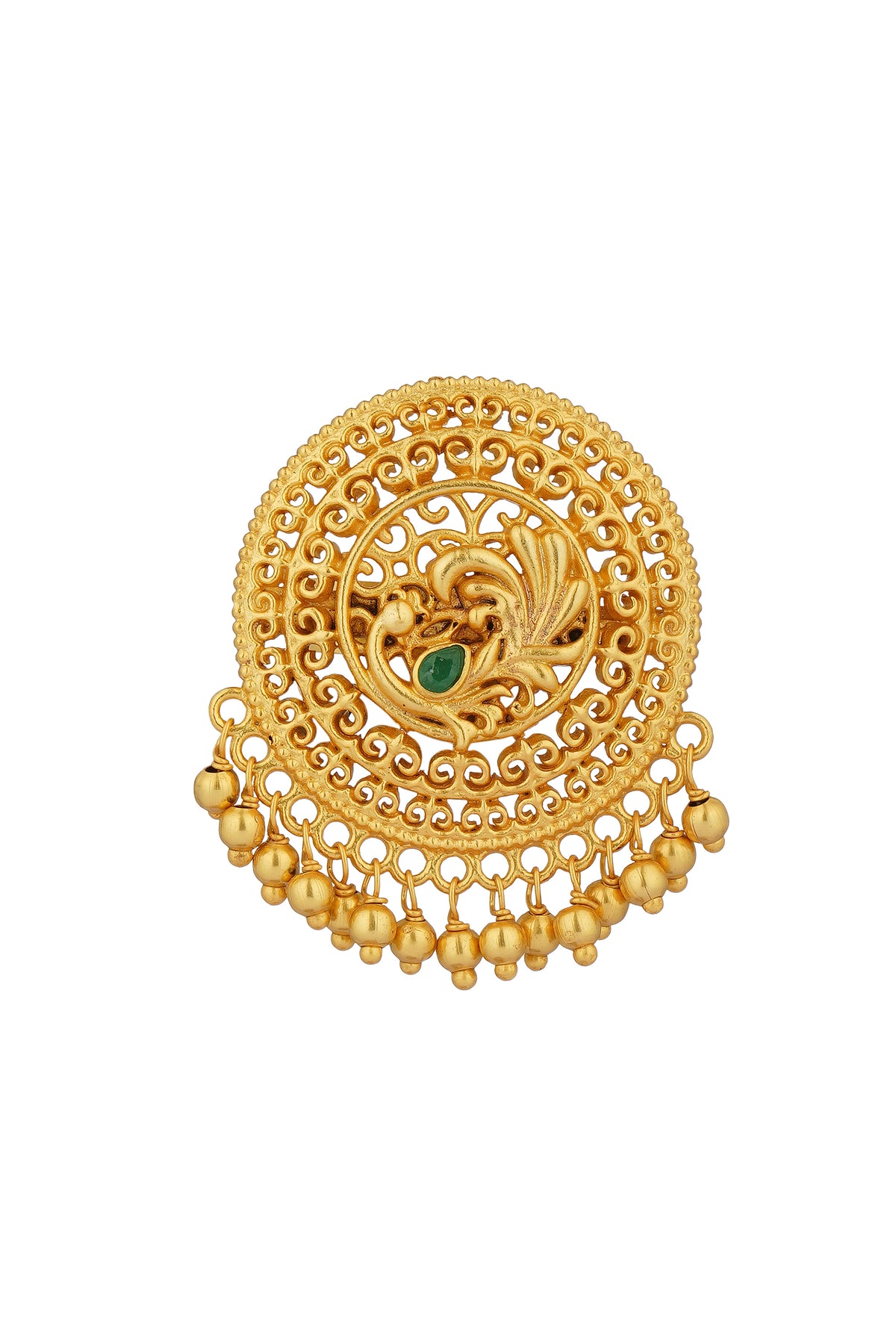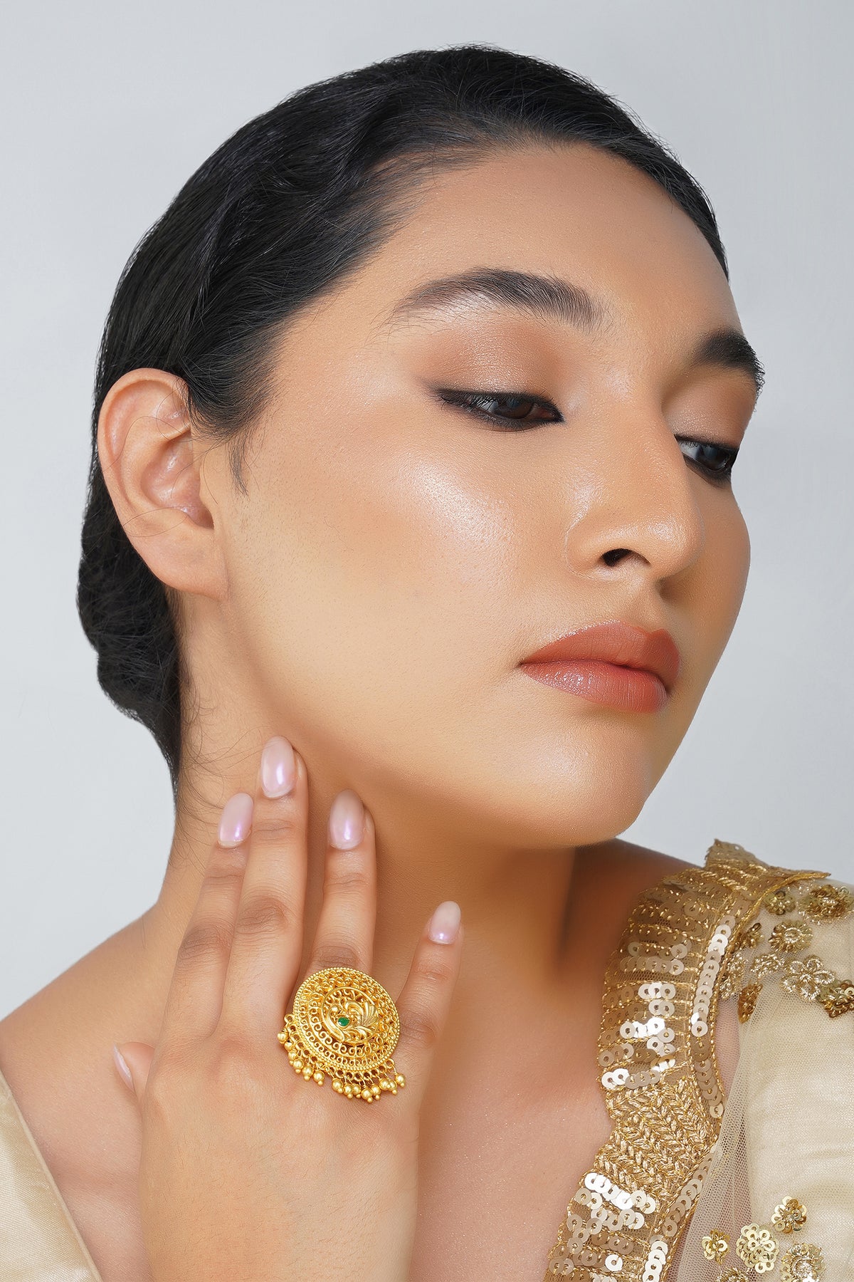 This is a very striking 22kt gold plated cocktail ring inspired by the antique temple jewelry crafting technique. The ring is an amalgamation of an embossed peacock motif and delicate filigree motifs. The depiction of the bird in temple jewelry is significant one - as not only is the bird an artistic choice but also reflects spiritual, devotional and ceremonial association. The ring uses the metal embossing technique which is very typical of temple jewelry which enables the detailed designs and depth to the jewelry.Ā Adding to the detailing of the beautifully crafted piece, is the use of chatham emeralds which not only add colour but enhances its glory.