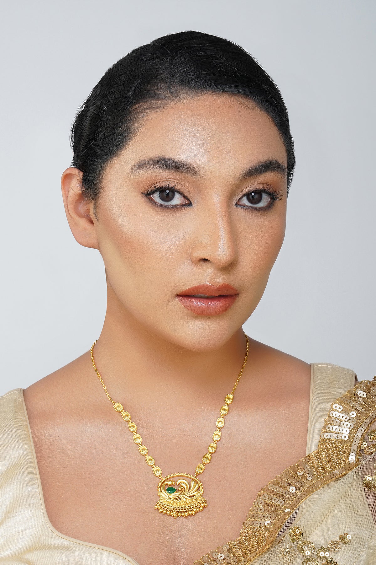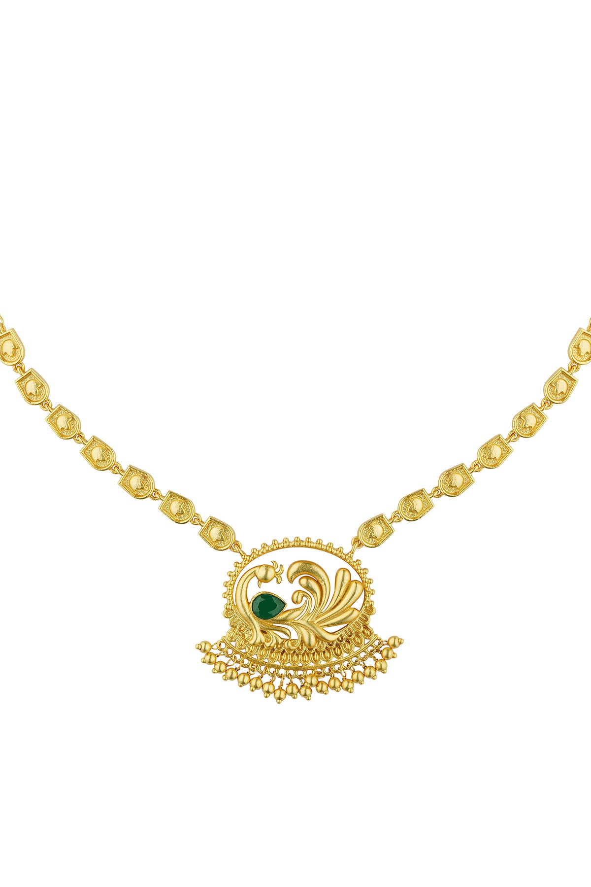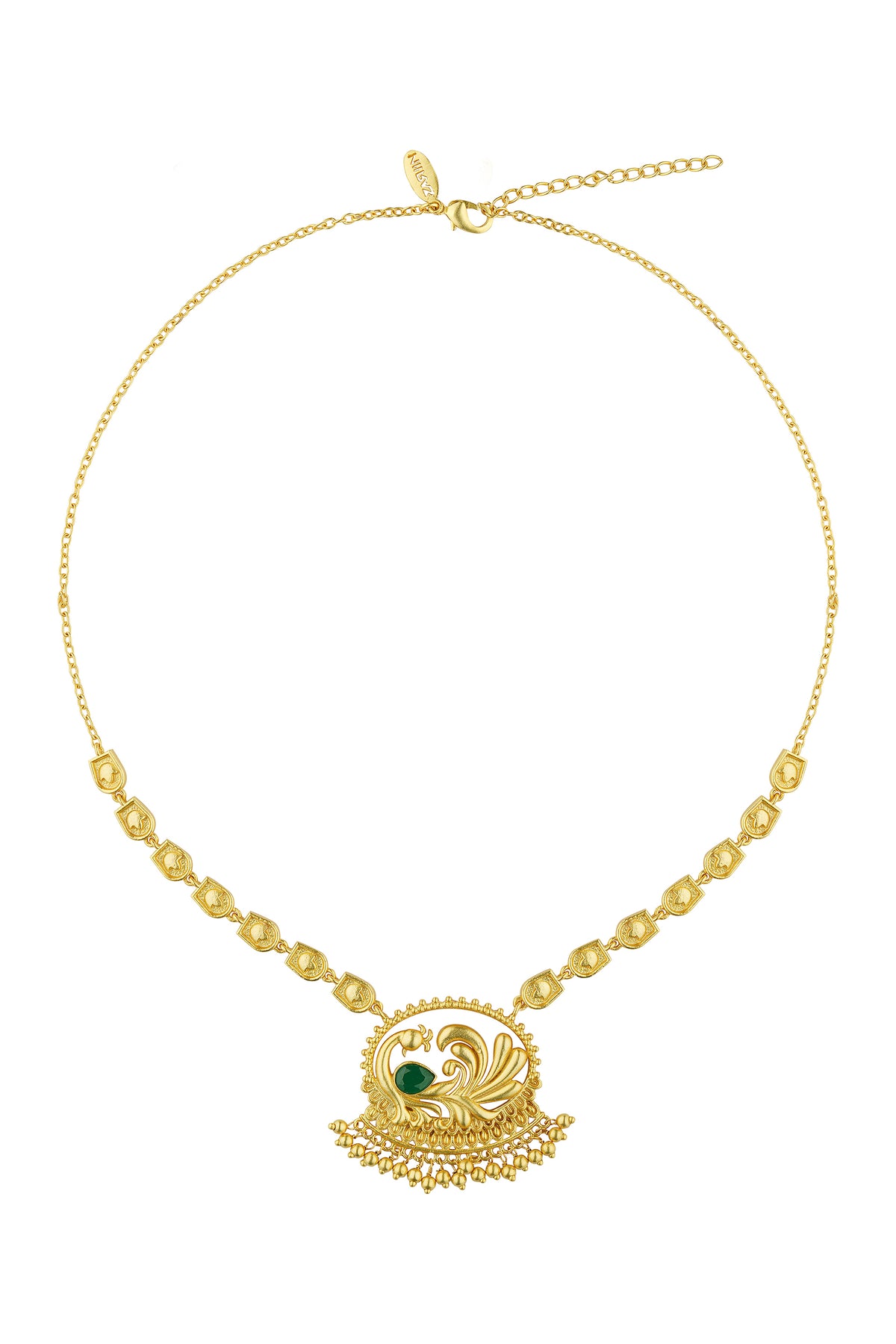 This is a lovely 22kt gold plated pendant necklace inspired by the traditional temple jewelry. Temple jewelry is known for its intricate detailing which is reflected beautifully in this necklace's peacock inspired motif on the pendant. The depiction of the bird in temple jewelry is significant one - as not only is the bird an artistic choice but also reflects spiritual, devotional and ceremonial association. The necklace uses the metal embossing technique which is very typical of temple jewelry which enables the detailed designs and depth to the jewelry. Adding to the detailing of the beautifully crafted piece, is the use of chatham emeralds which not only add color but enhances its glory.