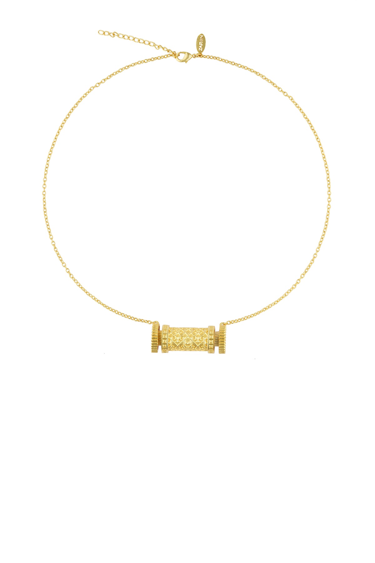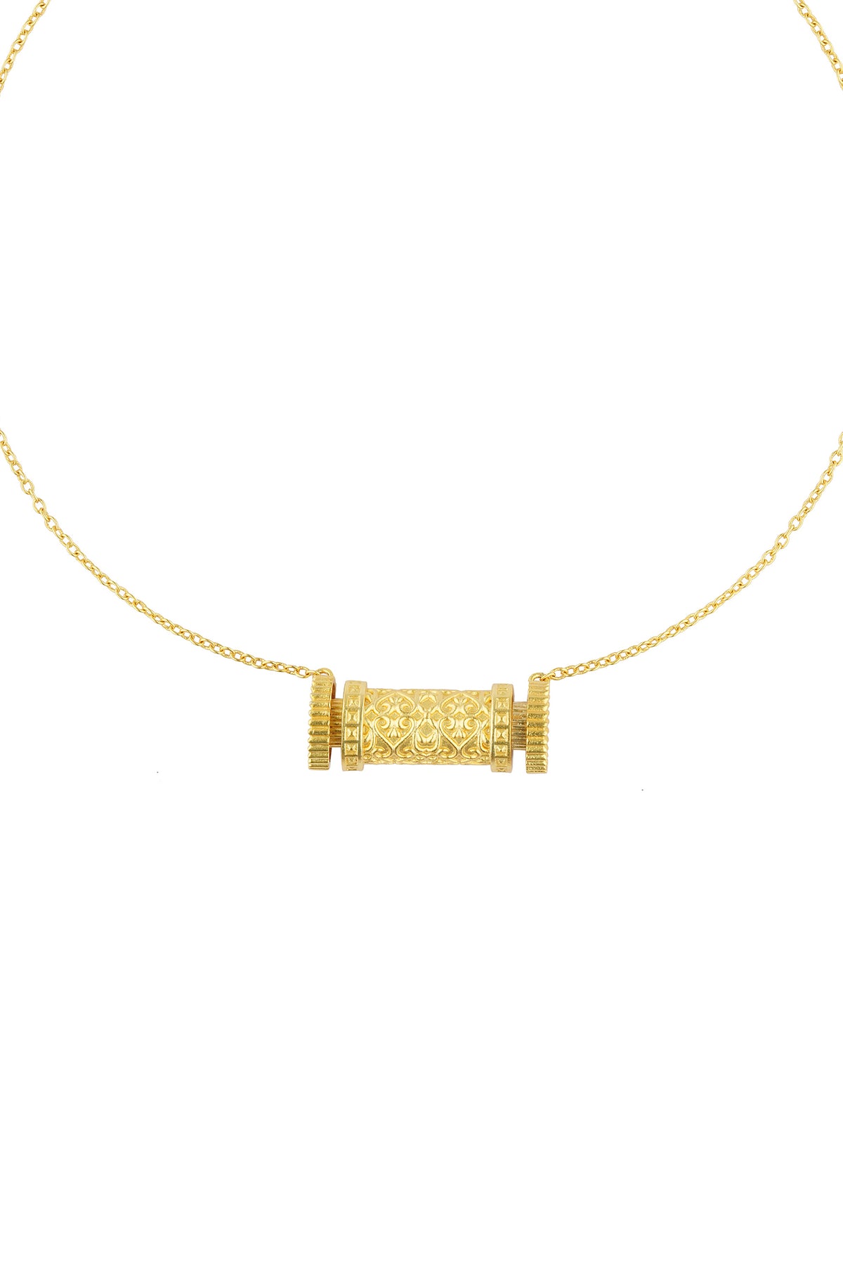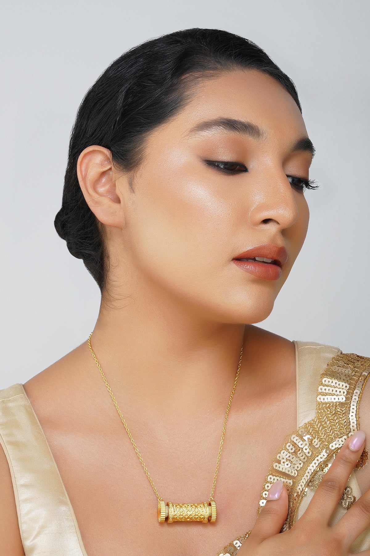 This is a stylish 22kt gold plated pendant necklace inspired by the traditional tamil thali pendant in cylindrical shape. The pendant is intricately detailed with metal embossing technique which lends texture and depth to it and is a reflection of the exquisite artistry of temple jewelry. Elegant and impactful, the pendant necklace amalgamates heritage jewelry and contemporary fashion. The pendant is studded with chatham rubies for added splendour. Wear this necklace with a sleep minimal dress or a stylish saree to look effortlessly accessorized on any occasion.Ā
