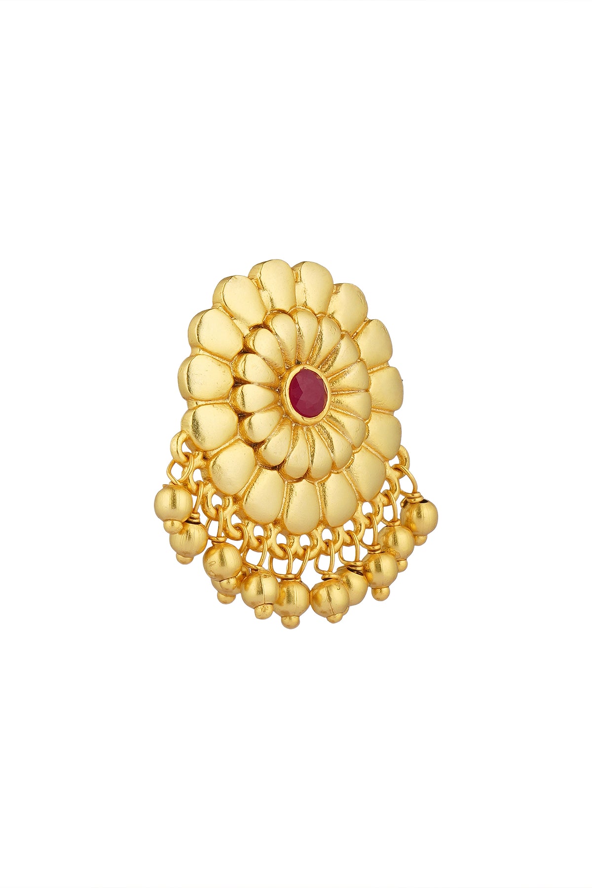 These are 22kt gold plated stud earrings with an embossed floral motif inspired by the traditional temple jewellery which makes the earrings detailed beautifully and lightweight - a typical feature of temple jewellery. The earrings are dressed with small elegant beaded drops. Use the earrings to finish a look and these can also be paired with a matching necklace or bangles. The earrings are centered with chatham rubies to enhance its elegance.