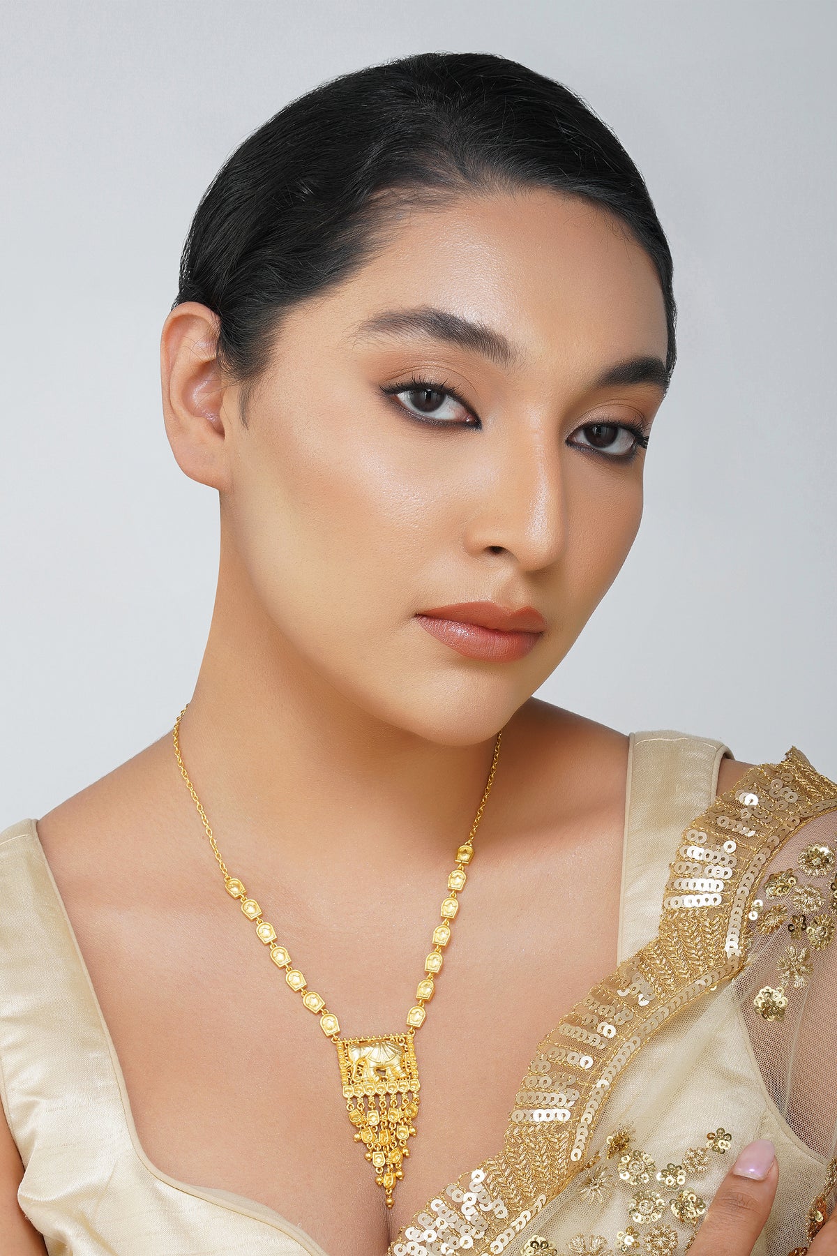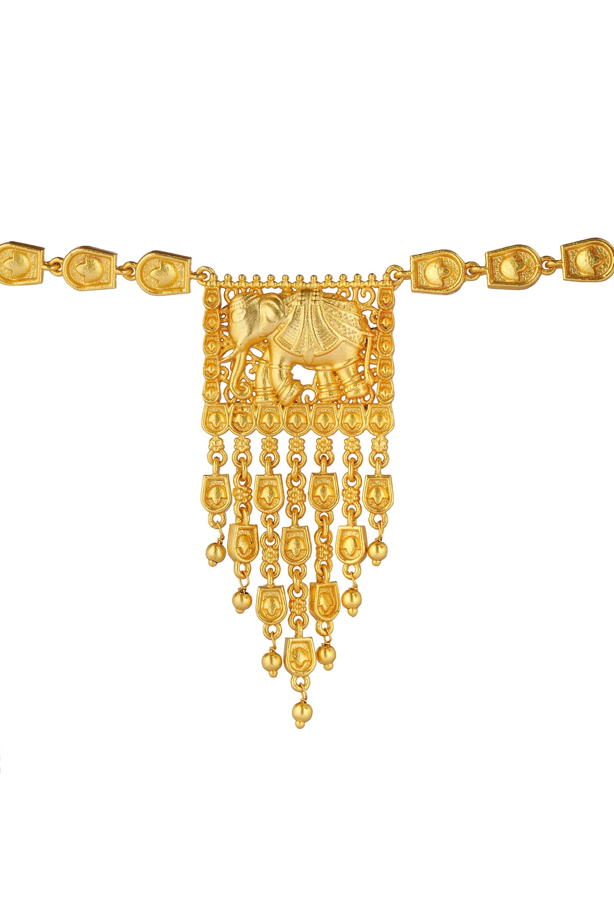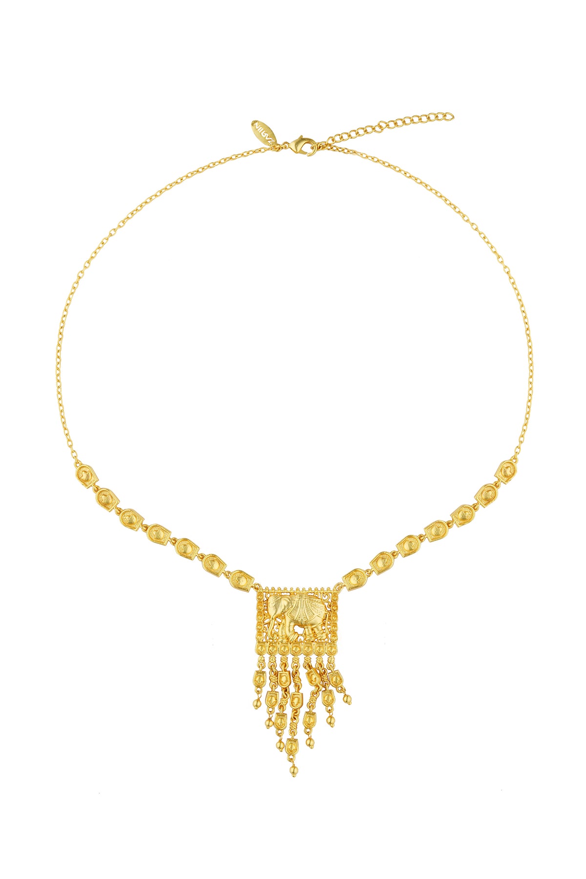 This is a refined 22kt gold plated pendant necklace inspired by the classic indian temple jewellery. The striking necklace features beautifully embossed motifs of the majestic elephant and much revered lotus buds. Both the symbols are cherished in the indian subcontinent for wisdom, prosperity, spirituality and divine beauty. Crafted skillfully using metal embossing technique, the necklace is well detailed and celebrates texture which is typical of the antique temple jewellery. Pair the piece with a classic saree or a chic blouse and crisp trousers for a contemporary twist.Ā