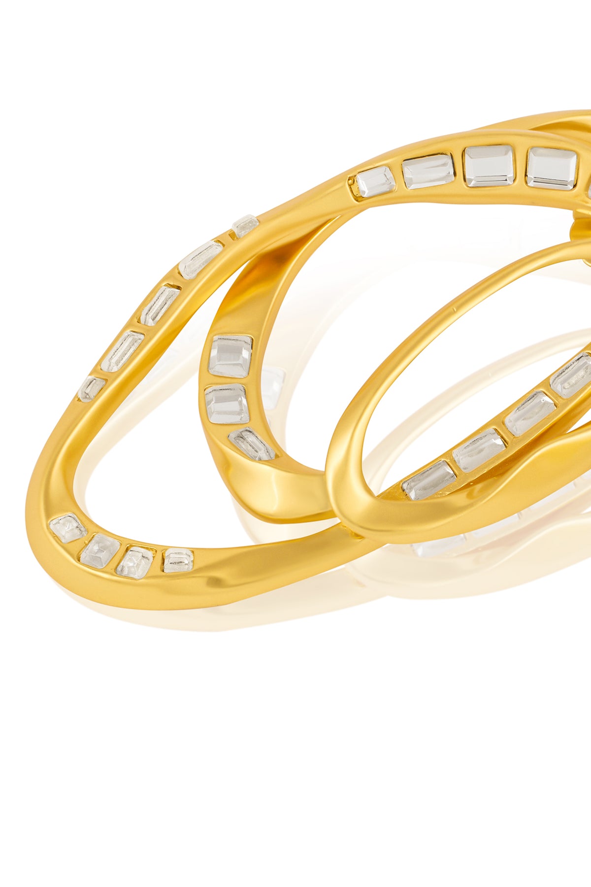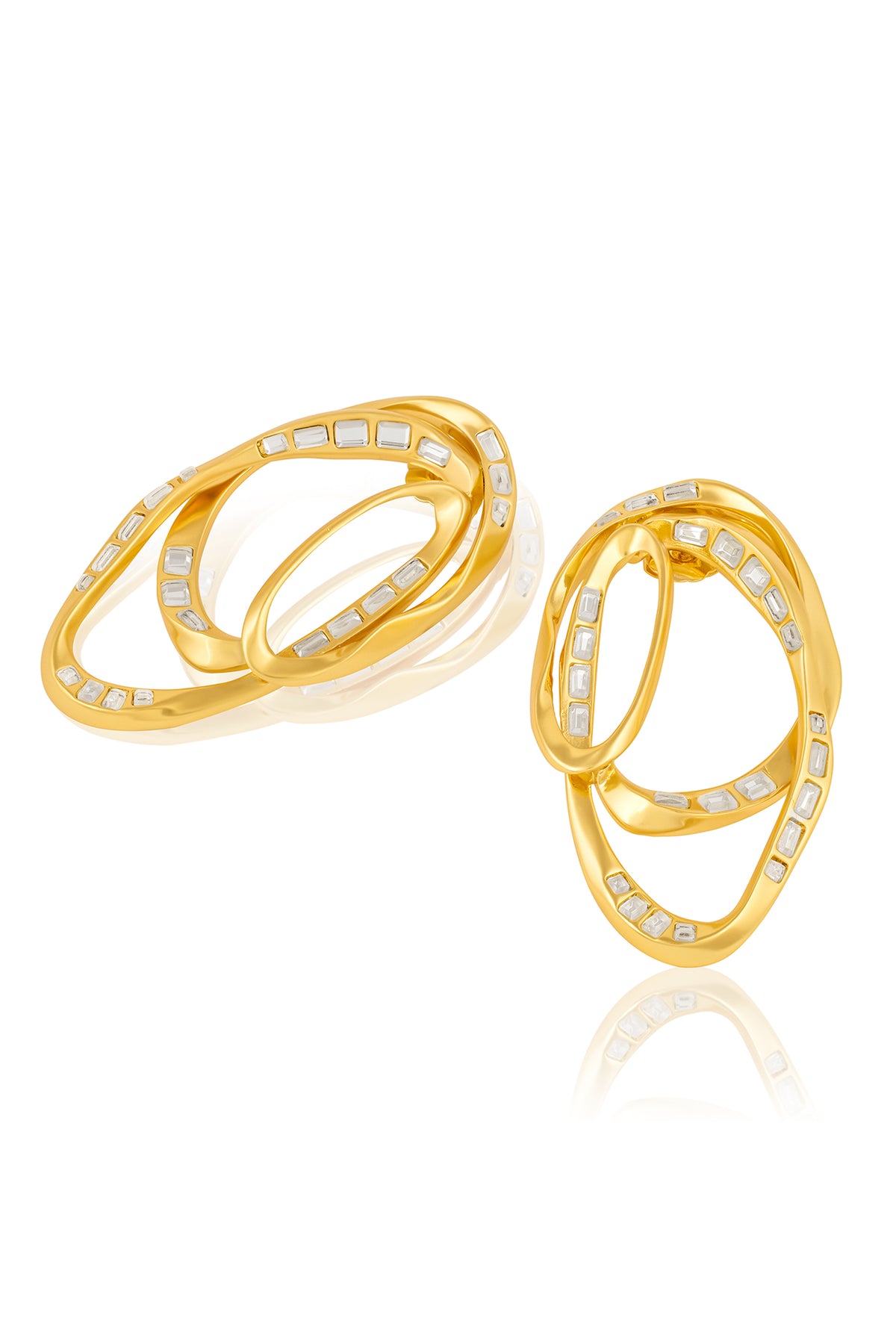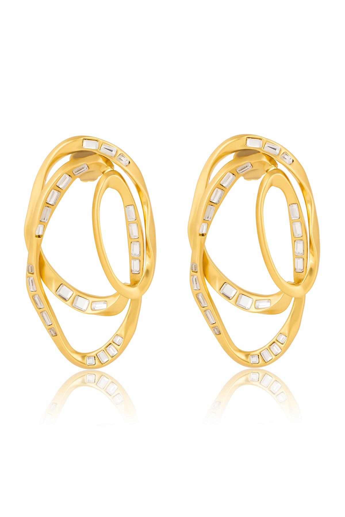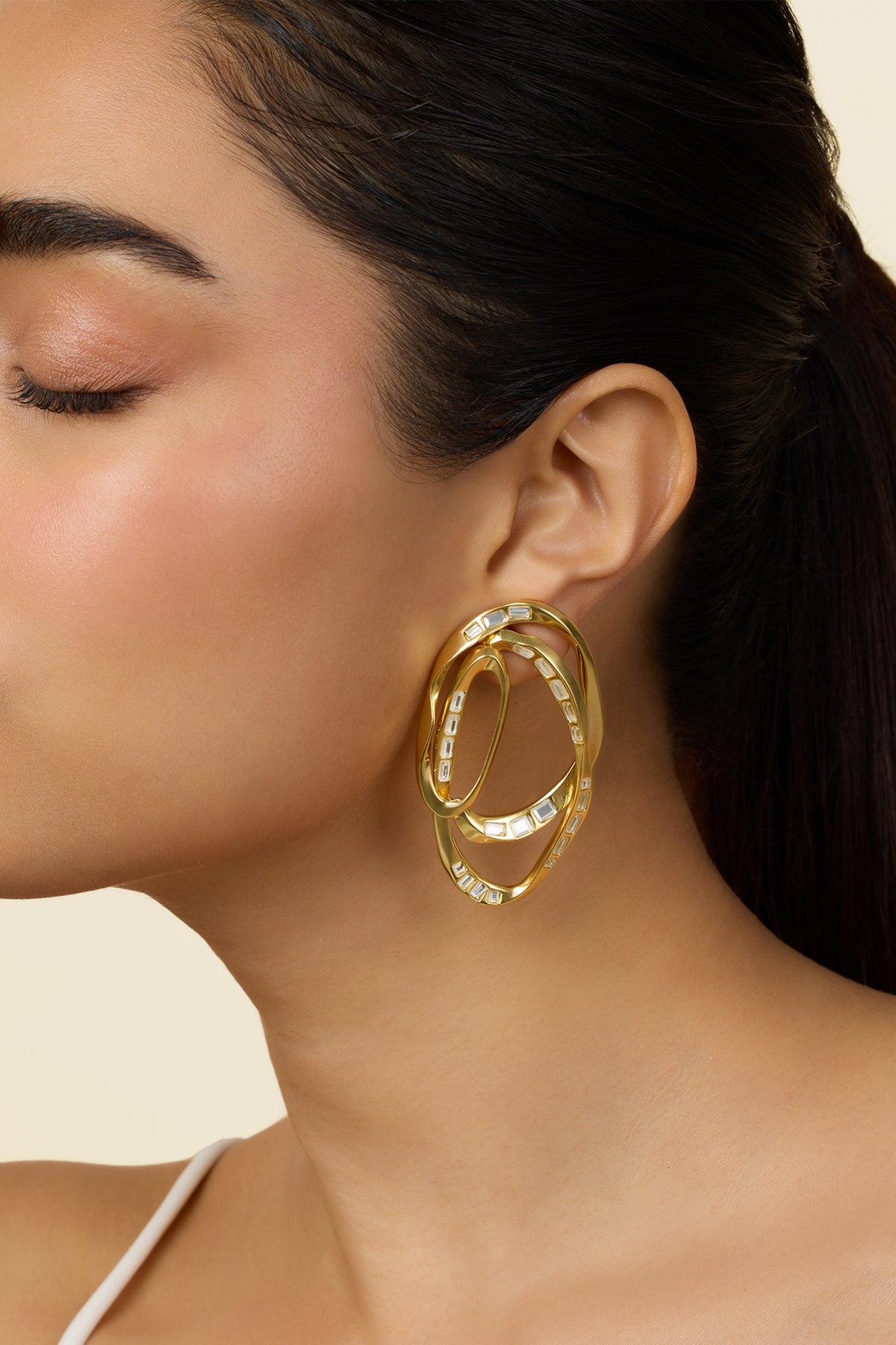These vintage-inspired triple the joy earrings are crafted in brass and plated with 18k gold. They feature exquisite mirror work and can be styled with everything from heirloom sarees to cocktail dresses for every celebration.