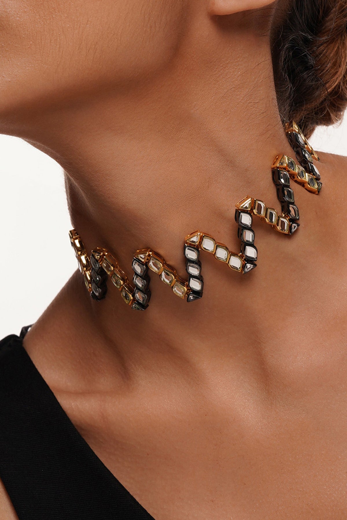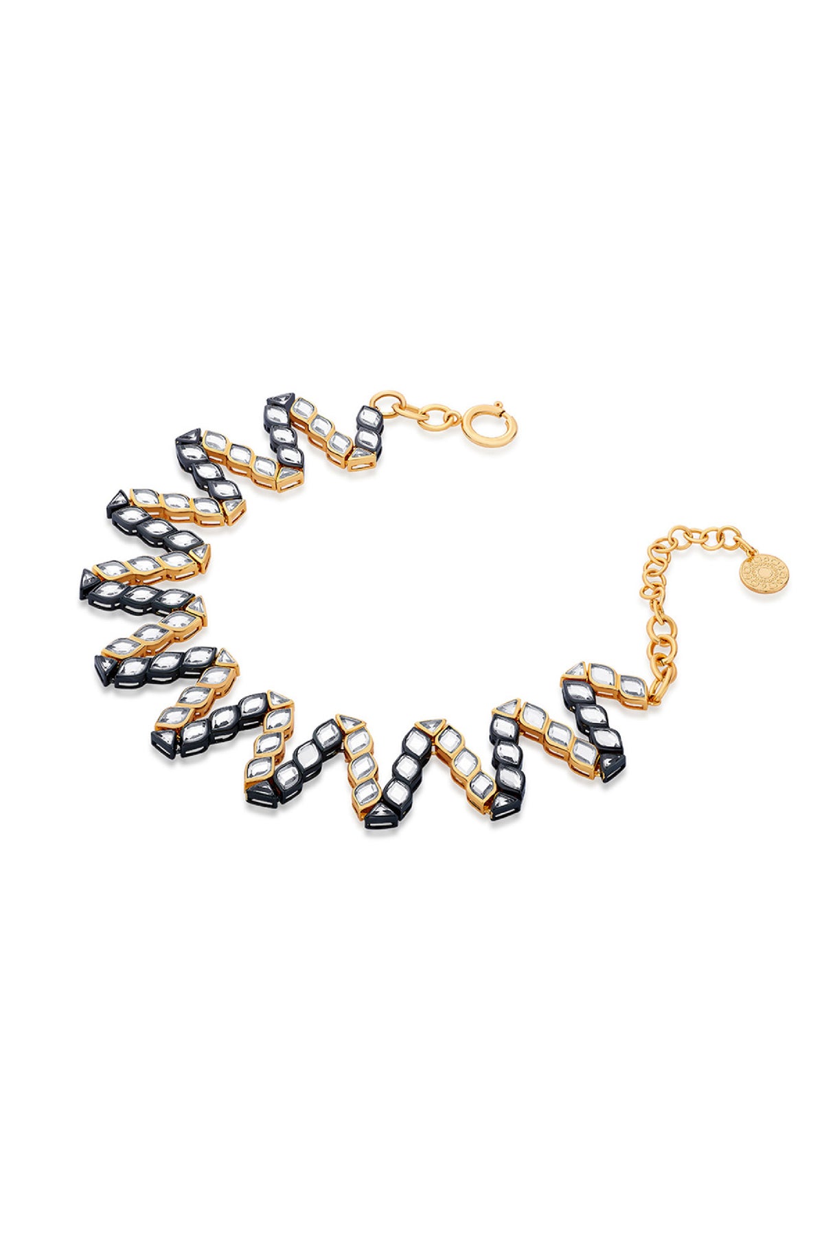 Many of our pieces from modern maharani are both modern and timeless. This elegant choker is decorated with shimmering mirrors alongside two-tone plating in black and 18-karat gold. Wear yours with an all-black outfit.