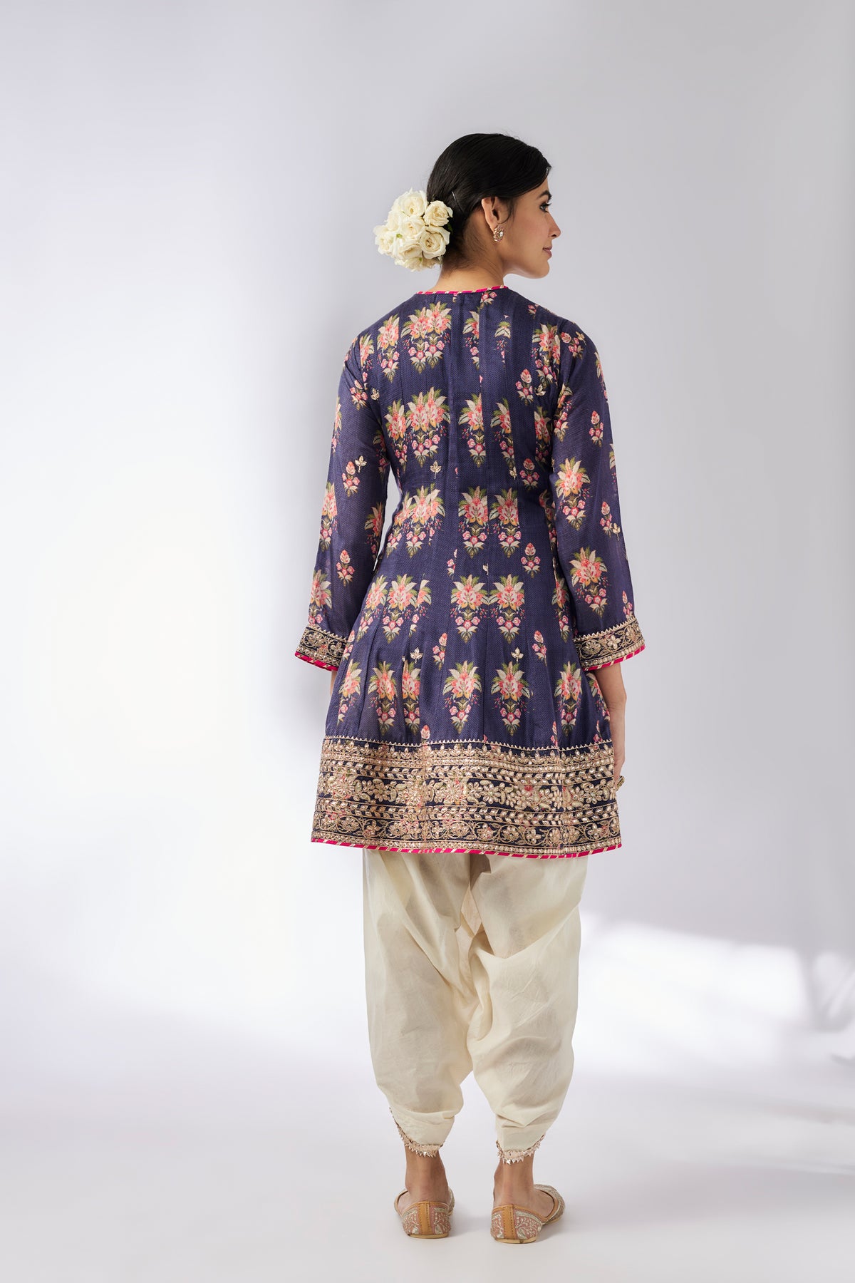 This pretty ensemble in floral jaal , combines gota and dori buttis with an intricate border embroidery. The short Kurta with a dhoti embroidered in sequins and gold thread, adds a feminine grace.