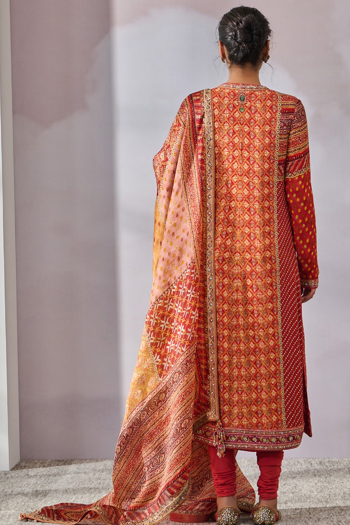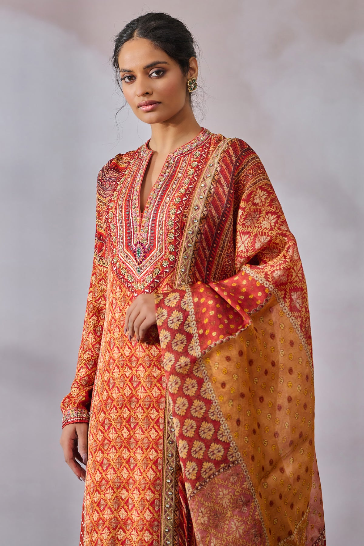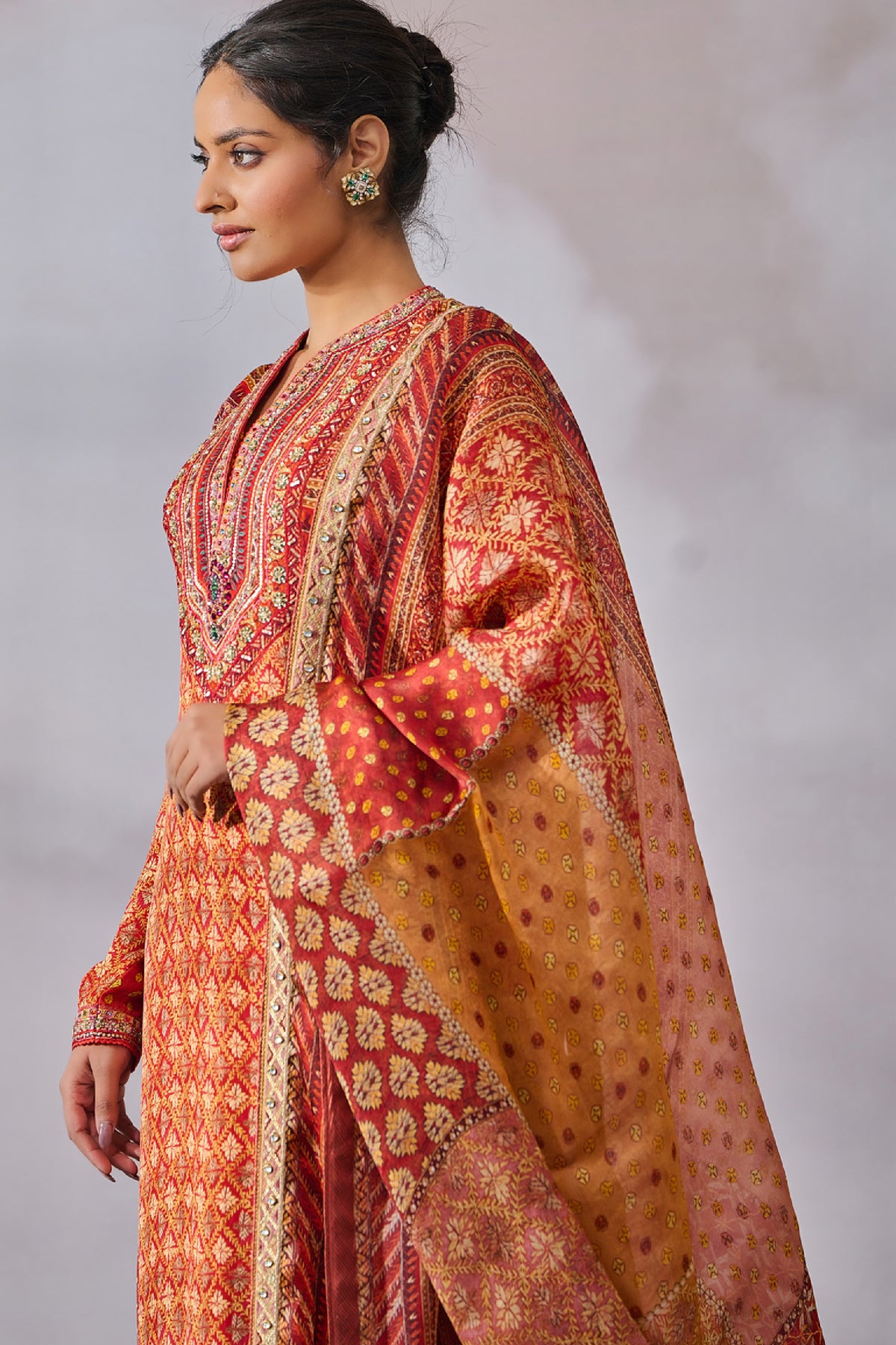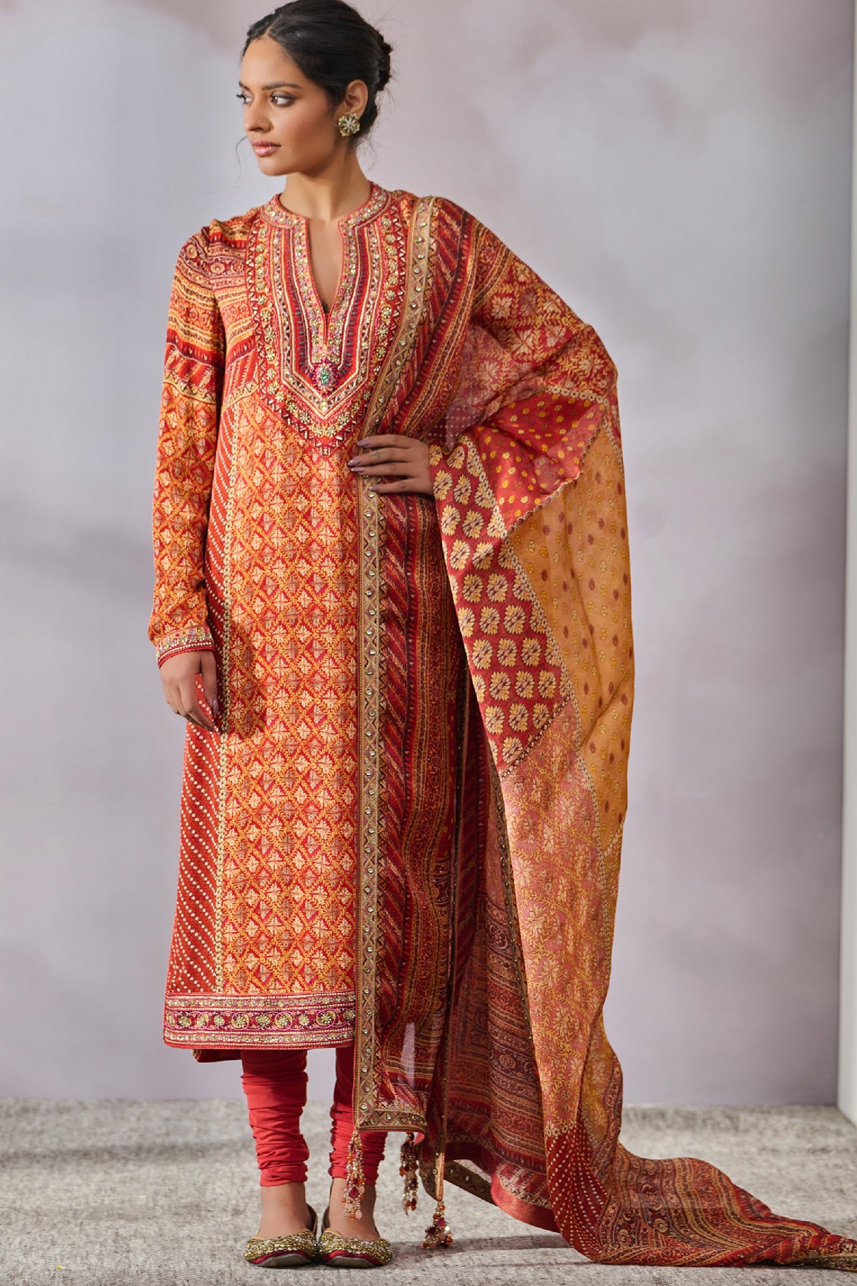 Classic kurta with hand embroidery on a phulkari inspired print is paired with a churidar and dupatta.