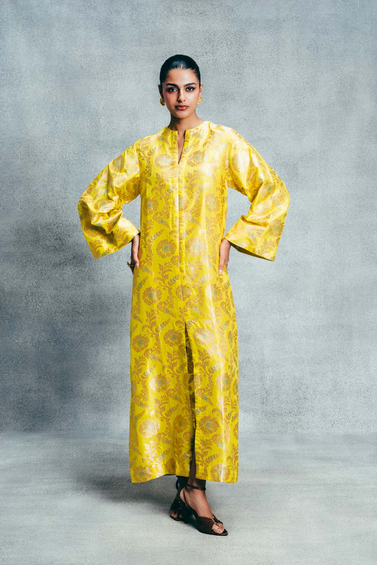 Crafted using the finest silks, ekaya introduces one of its boldest new expressions yet, the banarasi kaftan. This canary yellow kaftan is handwoven in kadhwa banarasi technqiue and crafted in satin-silk. Cut in a fluid, global silhouette, it features bell sleeves and a deep front slit. Designed for styling, this kaftan adapts to how you wear it, from day to evening, across settings and moods. It's made for the global woman with an indian soul.