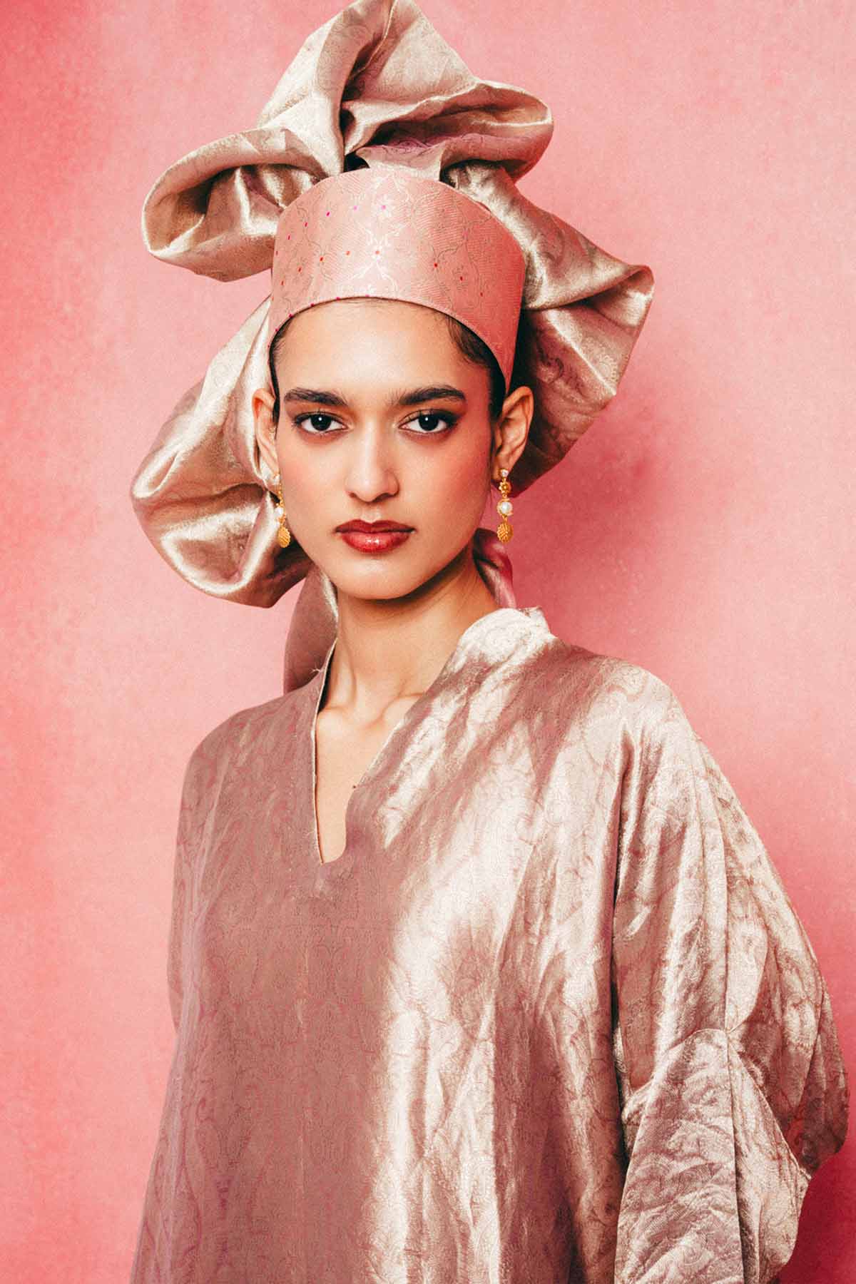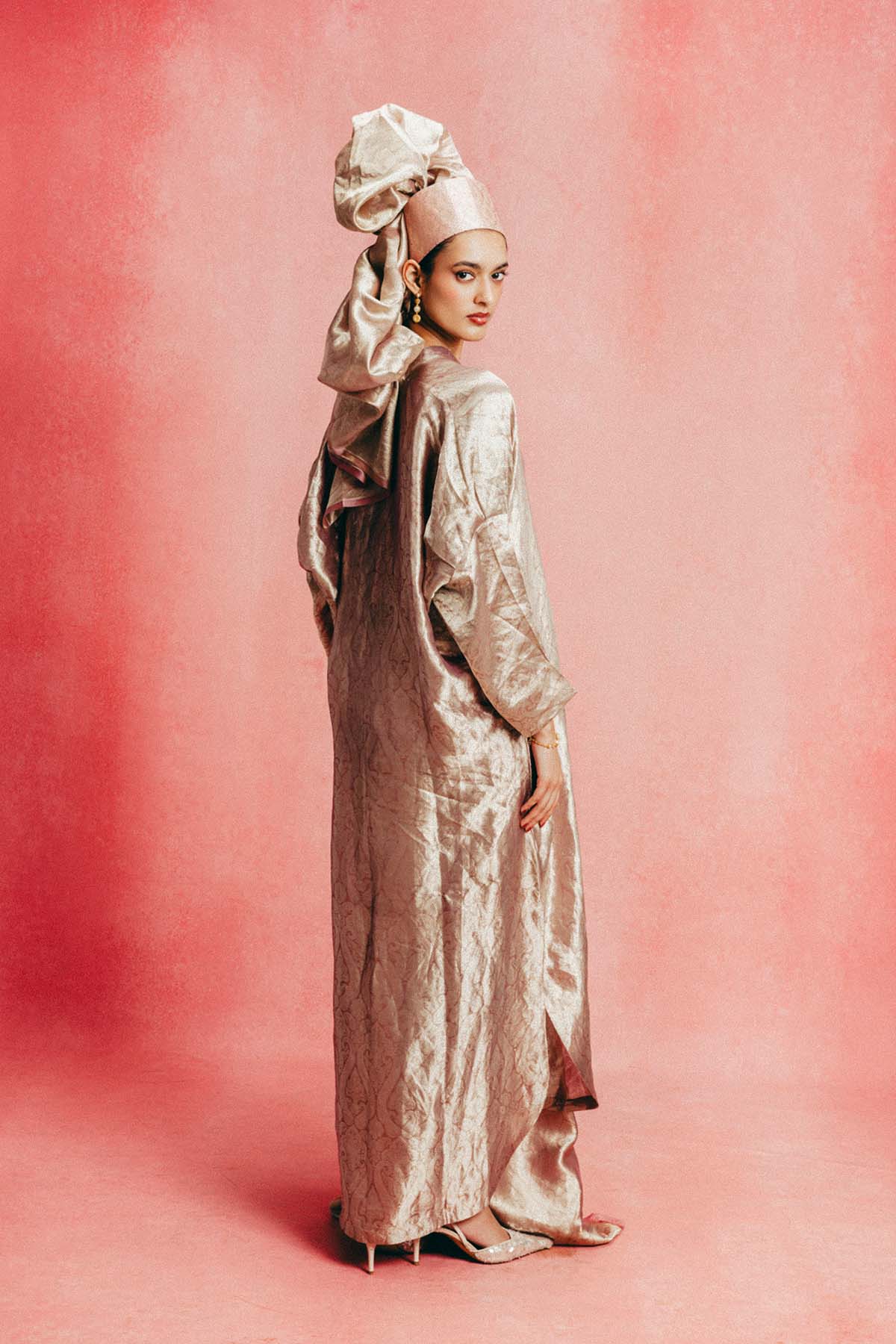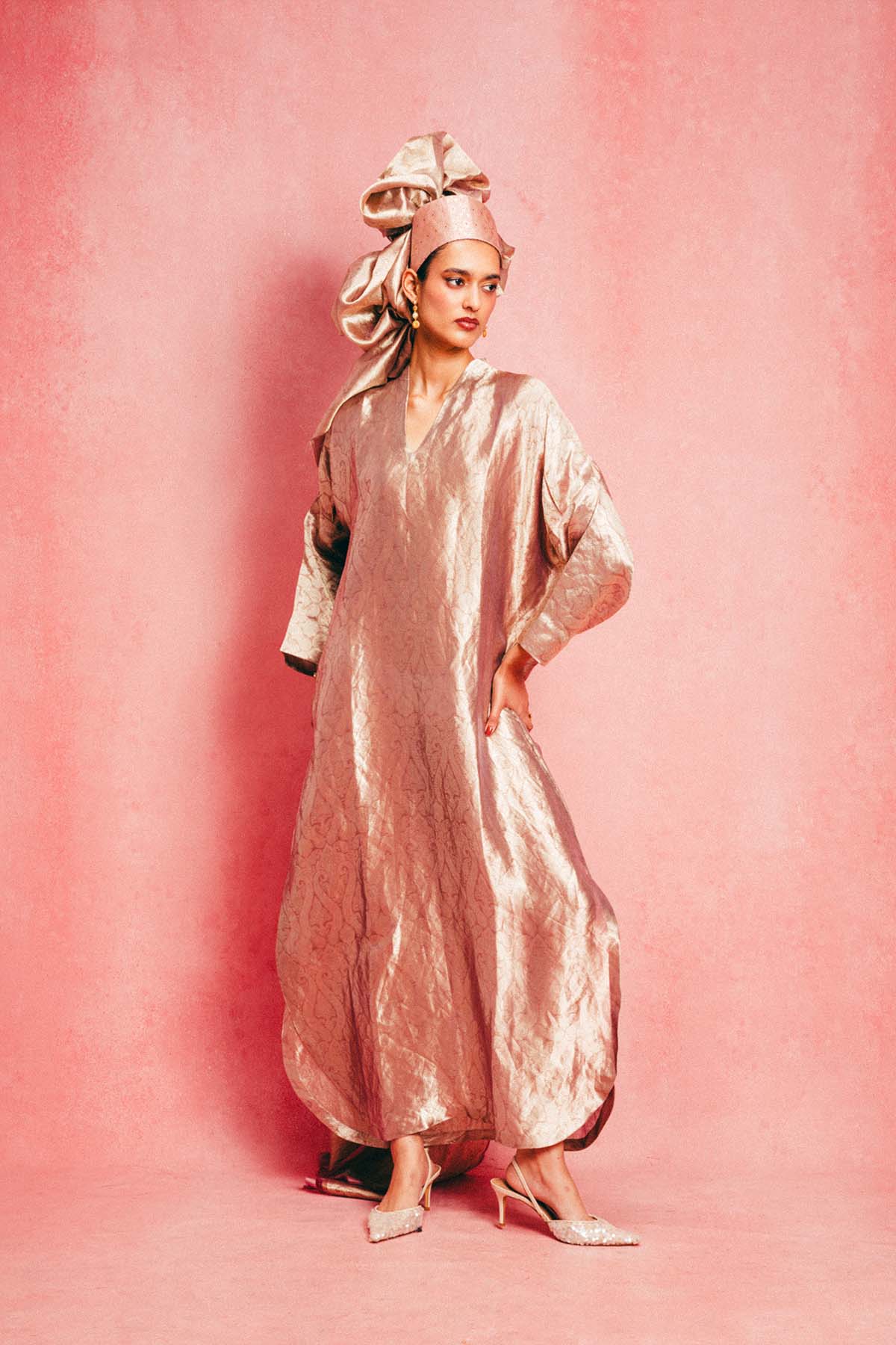 Crafted using the finest silks, ekaya introduces one of its boldest new expressions yet, the banarasi kaftan. This dusty rose kaftan is handwoven in banarasi emboss technique and crafted in tissue-silk. Cut in a fluid, global silhouette, it features a v-neckline and side slits that feels elevated. Designed for styling, this kaftan adapts to how you wear it, from day to evening, across settings and moods. It's made for the global woman with an indian soul.