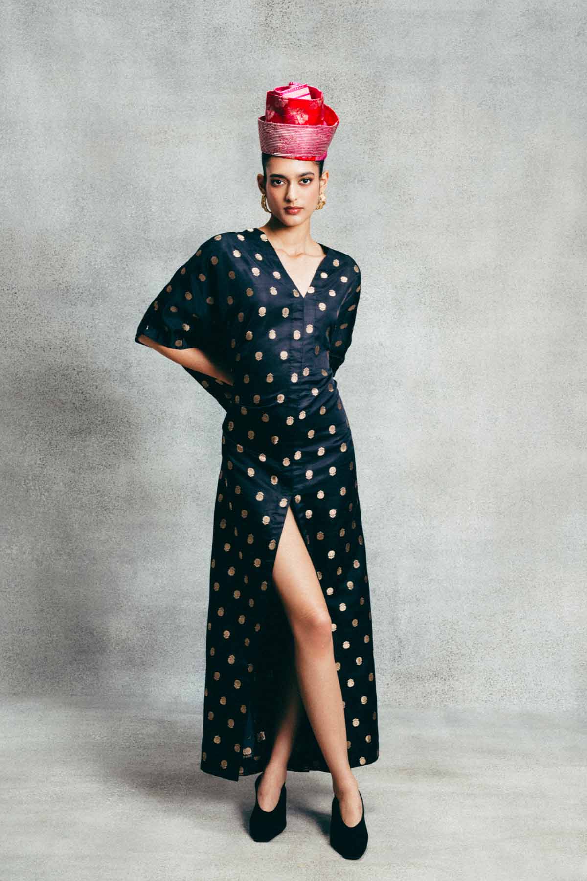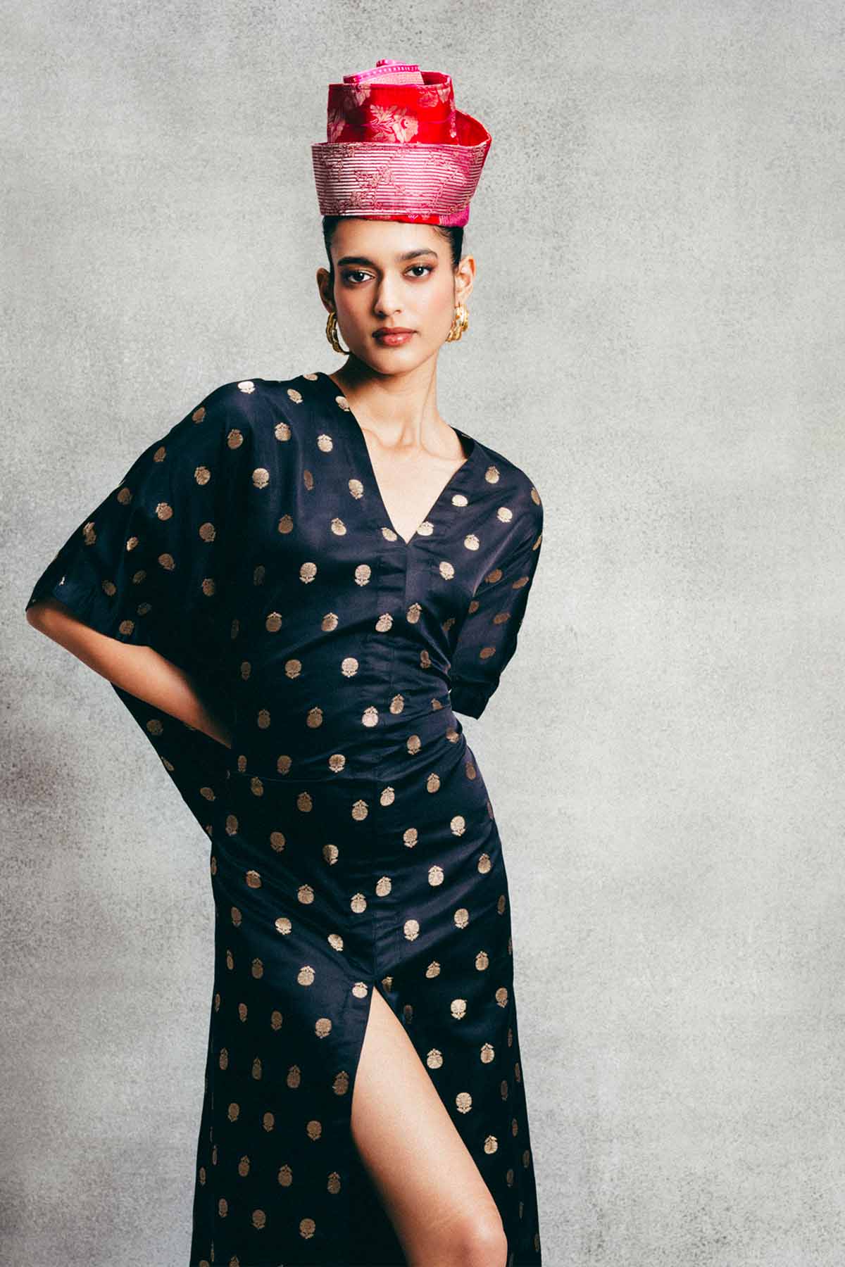 Crafted using the finest silks, ekaya introduces one of its boldest new expressions yet, the banarasi kaftan.This ebony kaftan is handwoven in cutwork banarasi technique and crafted in satin-silk. Cut in a fluid global silhouette, it features a deep v-neckline, kimono sleeves, and deep front slit.Designed for styling, this kaftan adapts to how you wear it, from day to evening, across settings and moods. It's made for the global woman with an indian soul.