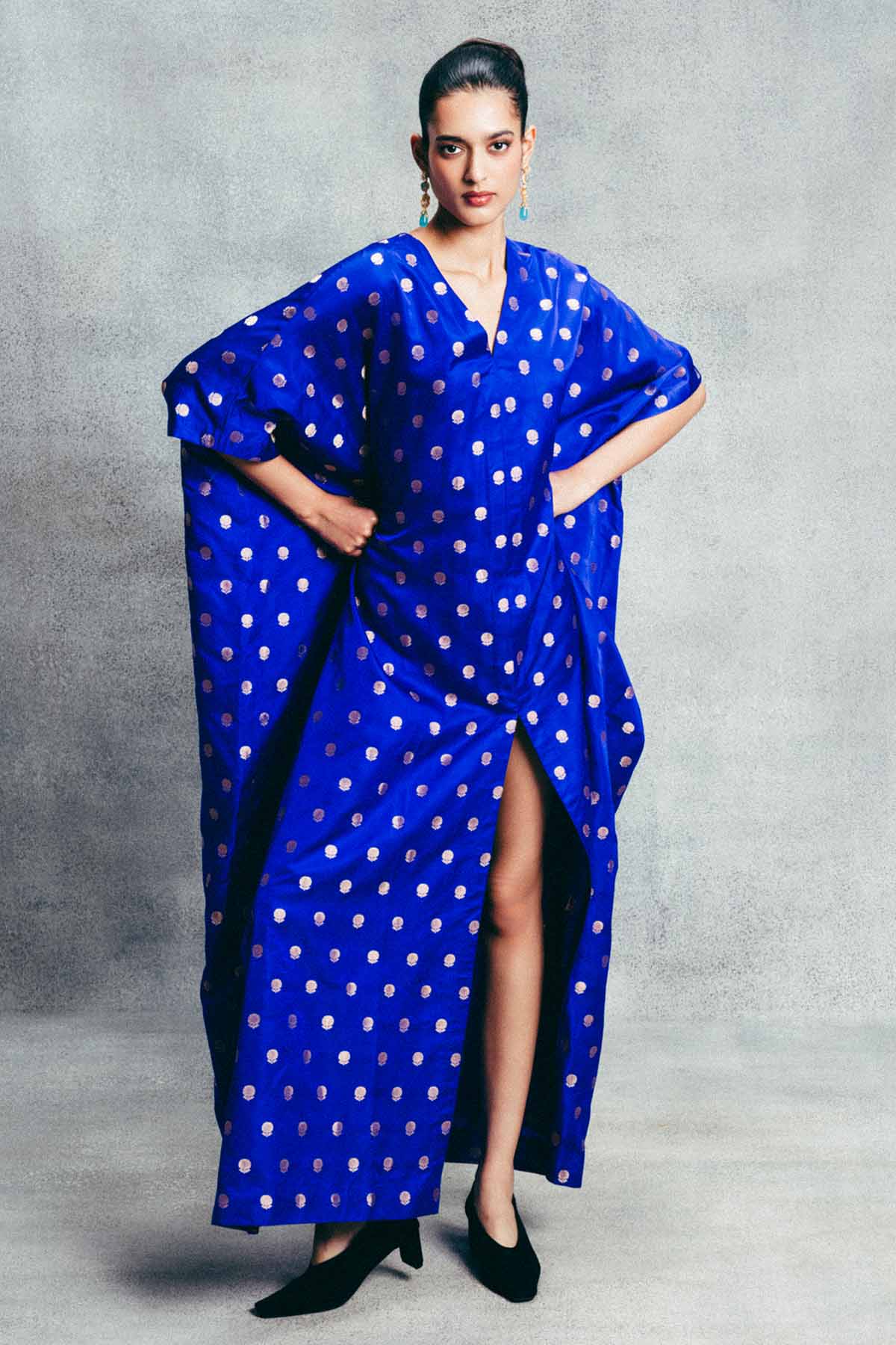 Crafted using the finest silks, ekaya introduces one of its boldest new expressions yet, the banarasi kaftan. This elcetric blue kaftan is handwoven in cutwork banarasi technique and crafted in satin-silk. Cut in a fluid global silhouette, it features a v-neckline, kimono sleeves and deep front slit. Designed for styling, this kaftan adapts to how you wear it, from day to evening, across settings and moods. It's made for the global woman with an indian soul.