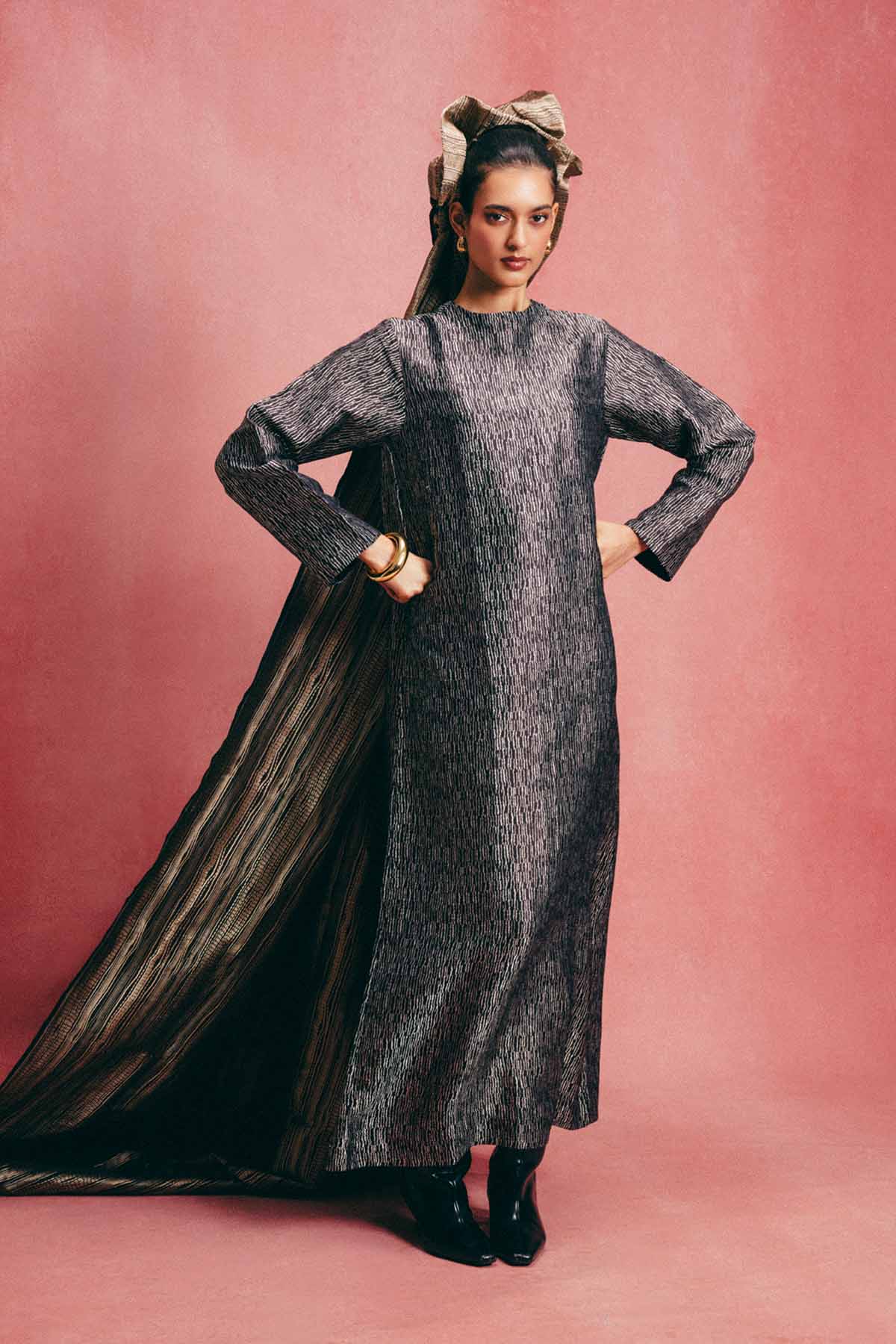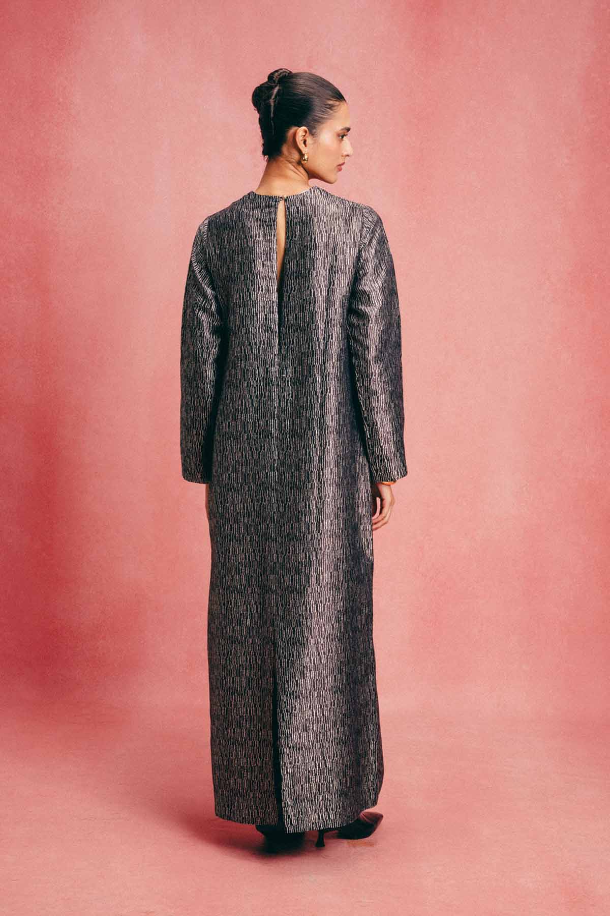 Crafted using the finest silks, ekaya introduces one of its boldest new expressions yet, the banarasi kaftan. This jet black kaftan is handwoven in banarasi emboss technqiue and crafted in pure silk. Cut in a fluid, global silhouette, it features side slits that feel both effortless and elevated. Designed for styling, this kaftan adapts to how you wear it, from day to evening, across settings and moods. It's made for the global woman with an indian soul.