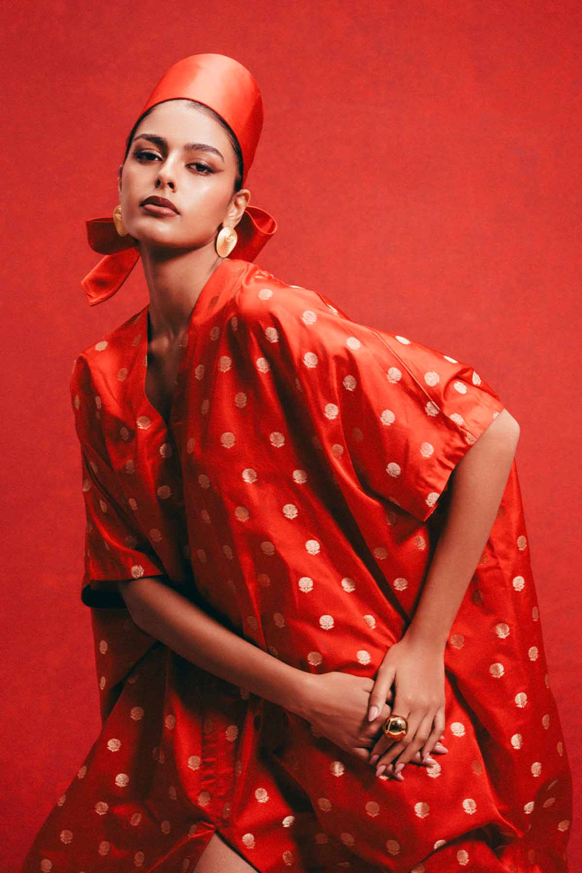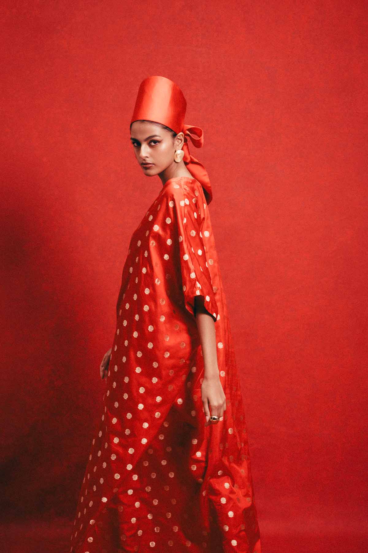 Crafted using the finest silks, ekaya introduces one of its boldest new expressions yet, the banarasi kaftan. This red kaftan is handwoven in cutwork banarasi technique and crafted in satin-silk. Cut in a fluid global silhouette, it features a v-neckline, kimono sleeves and deep front slit. Designed for styling, this kaftan adapts to how you wear it, from day to evening, across settings and moods. It's made for the global woman with an indian soul.