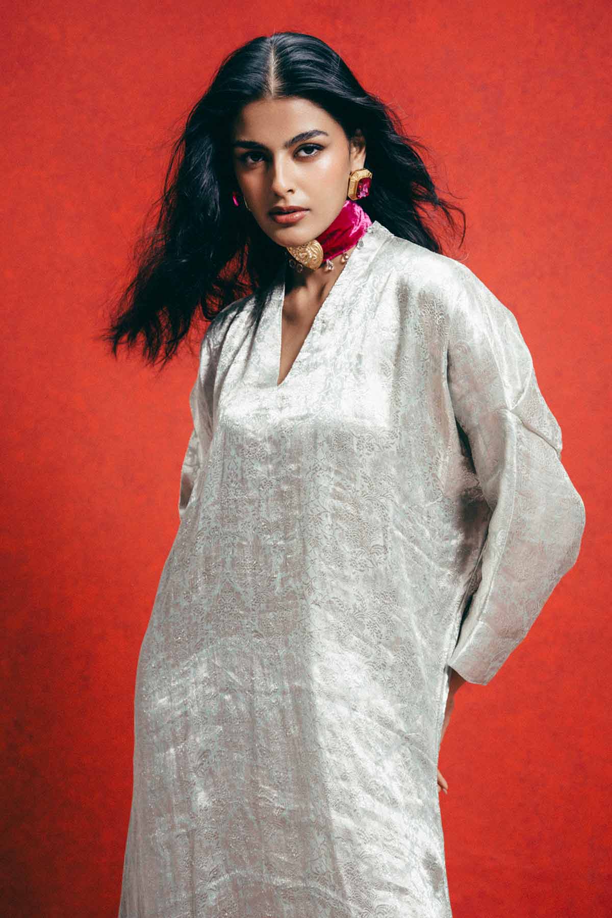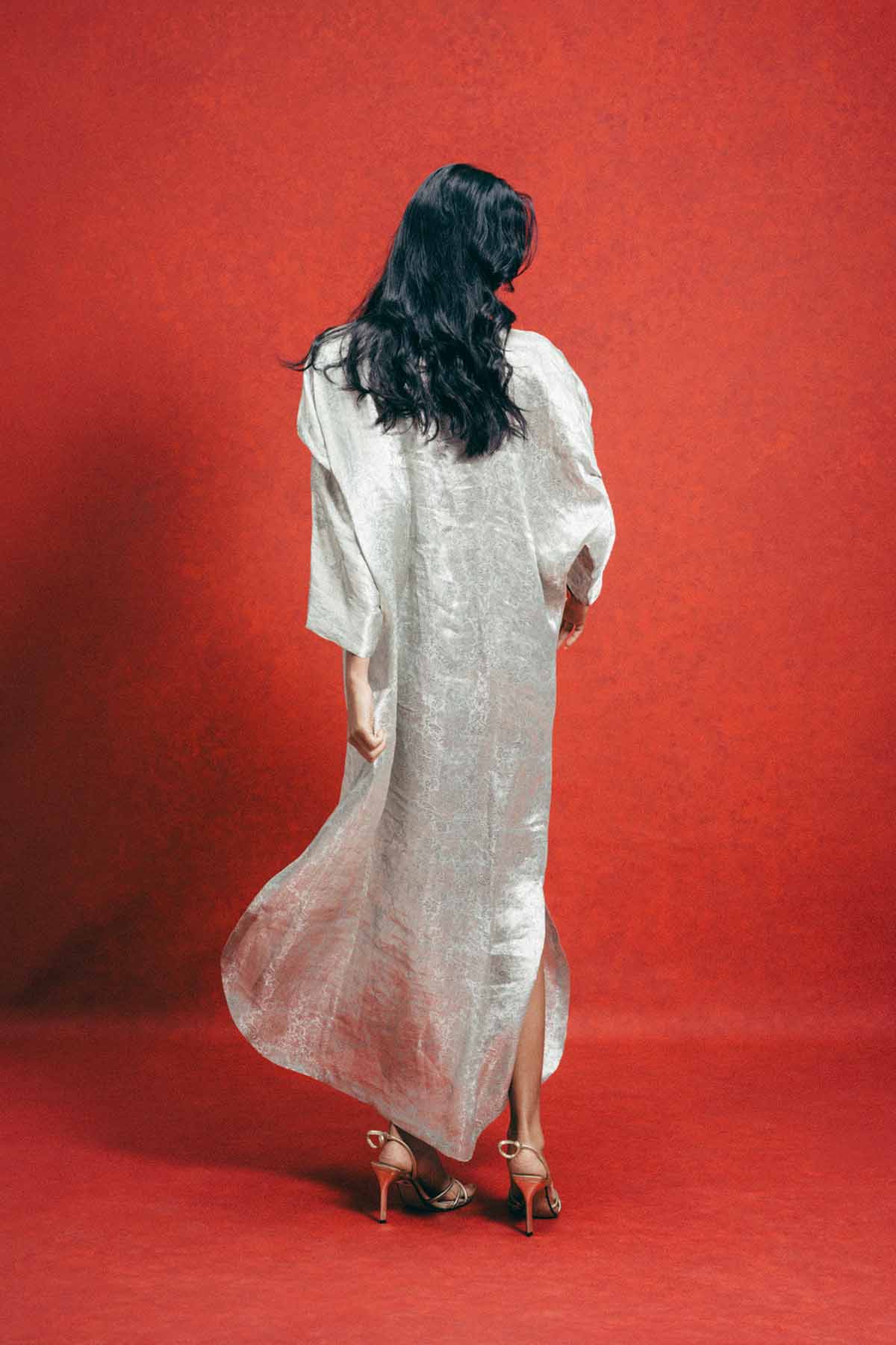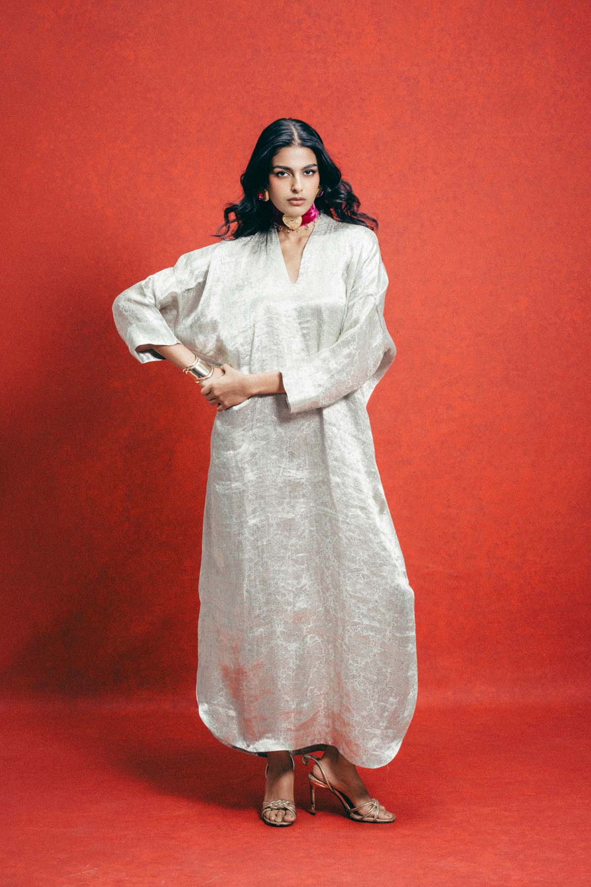 Crafted using the finest silks, ekaya introduces one of its boldest new expressions yet, the banarasi kaftan. This sea-green kaftan is handwoven in banarasi emboss technqiue and crafted in tissue-silk. Cut in a fluid, global silhouette, it features a v-neckline and side slits that feels elevated.Designed for styling, this kaftan adapts to how you wear it, from day to evening, across settings and moods. It's made for the global woman with an indian soul.