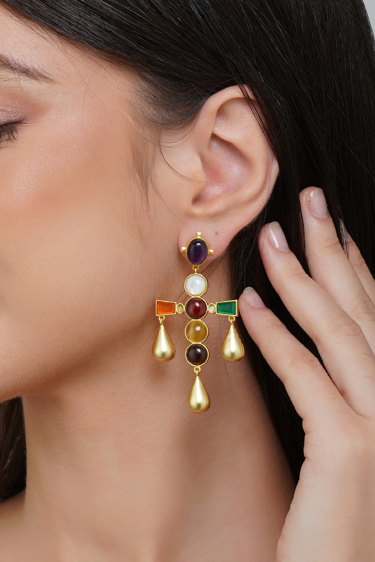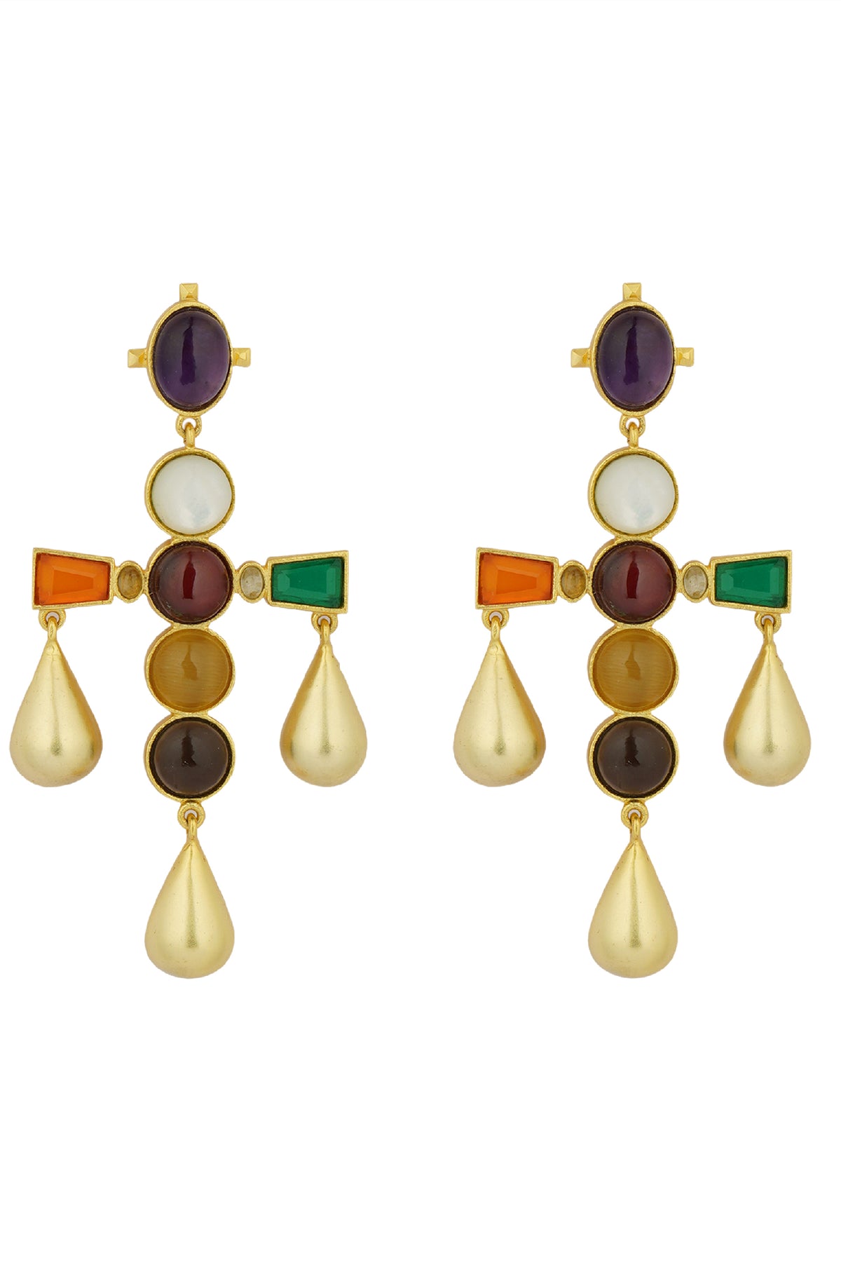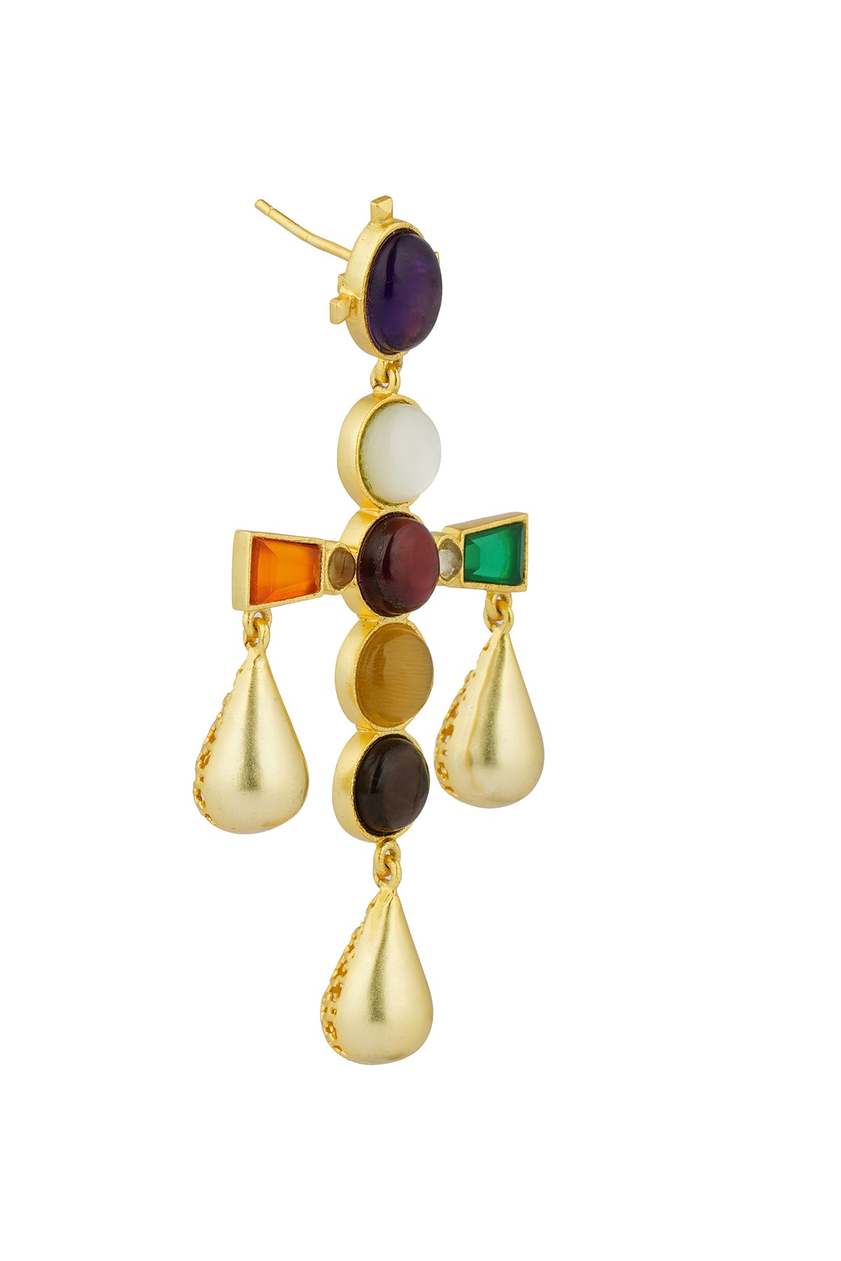 Necklace length 12 inches + right extension 4.5 in22kt gold plated earrings set with navratna gemstones. The 9 cosmic gemstones include cabochons of amethyst, mother of pearl, garnet, glass cat's eye, smoky quartz, crystal quartz and baguettes of green onyx and carnelian. The earrings are finished with metal drops. An age old concept inspired by the navratna presented in a stylish wearable form of jewelry that can be used to add flair to your everyday outfits or for perfect finishing touches to occasion wear. ChesĀ left side extension 2.5 inches motif 0.5 inches