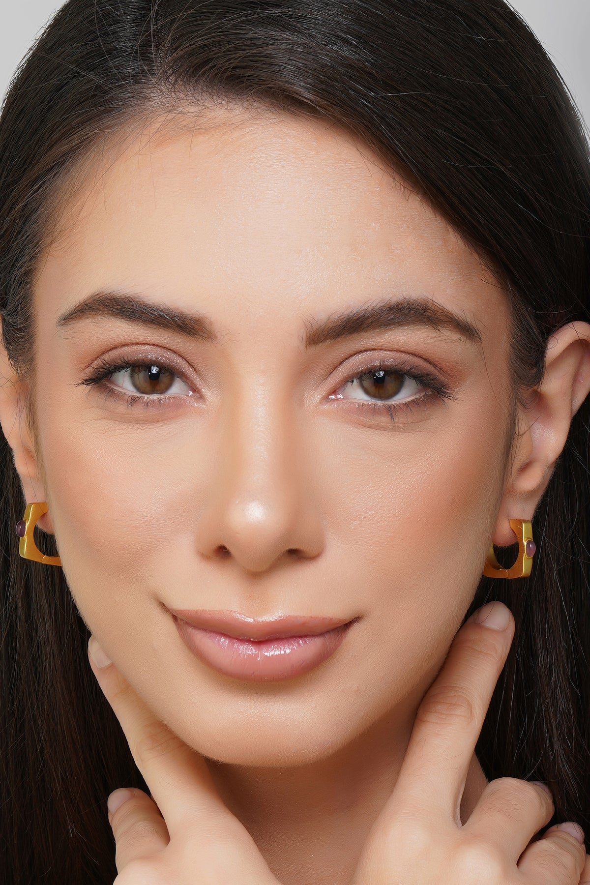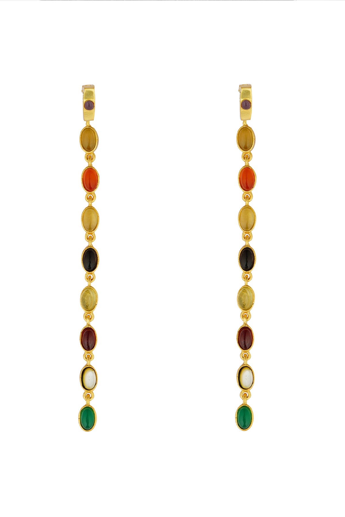 22kt gold plated hoop earrings studded with amethyst and optional stone studded drops. The earrings can be worn two ways - with or without the drops. The earrings are inspired by the age old concept of navratna jewelry and presented in a contemporary style befitting the aesthetics of today. The drops of the earrings include glass cat's eye, carnelian, citrine, smoky quartz, crystal quartz, garnet, mother of pearl and green onyx. A practical pair that can be adapted according to the outfit or your mood.Ā