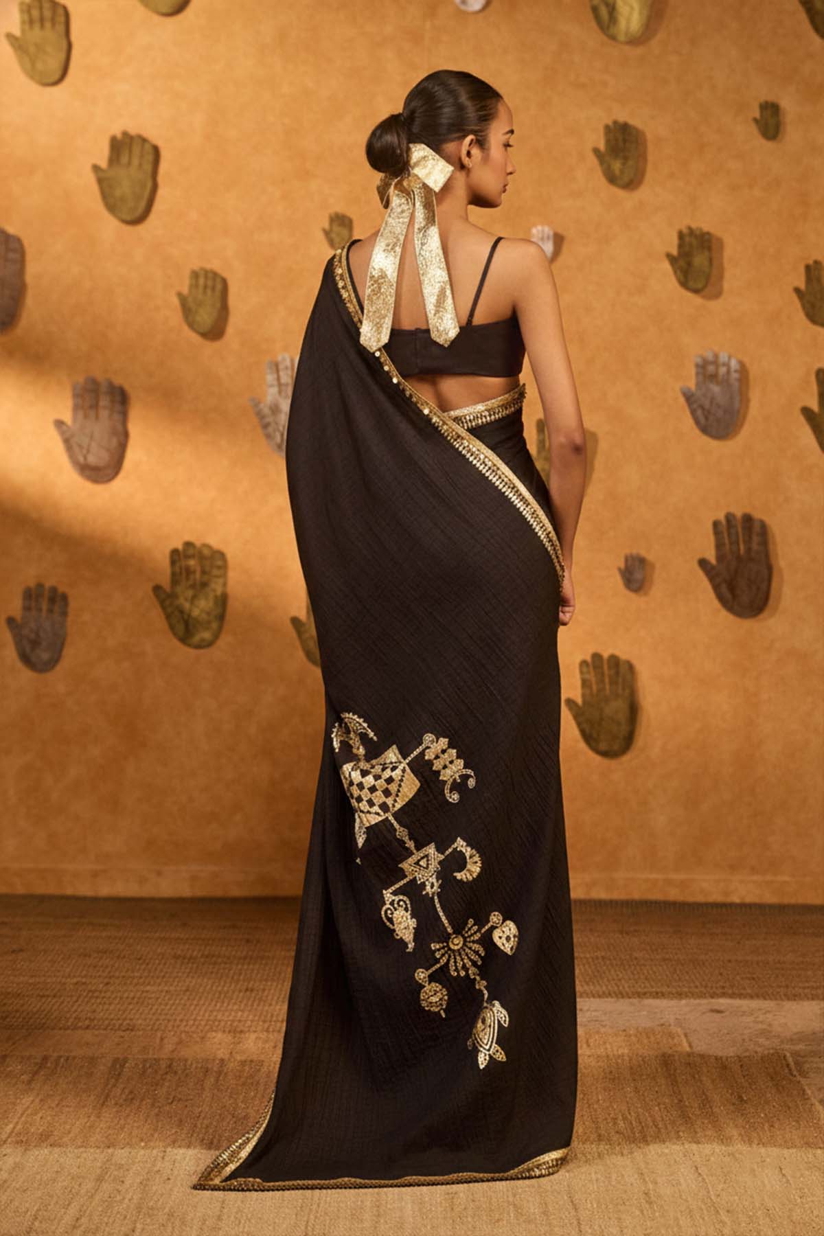 This black saree in opulent raw silk features a bold half-and-half layout, accentuated with intricate ombré foil print motifs in gold. The pallu is crafted in crushed silk with statement regal patterns, adding rich texture and drama to the silhouette. It is paired with a striking gota blouse, designed in a structured, sleeveless cut with a sweetheart neckline—perfect for festive evenings with a modern edge.