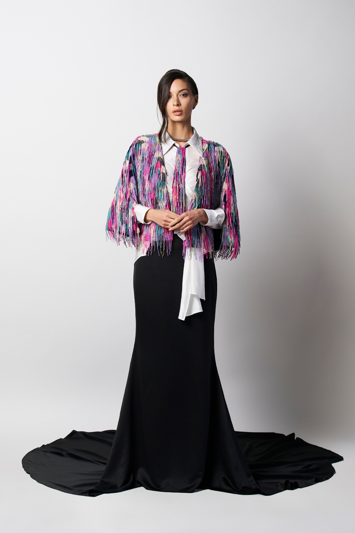 The bead fringe cape is a hand crafted statement cape that is beautifully embroidered with colorful beads, creating the look of vibrant fringes. You can wear it over your saris or draped skirts for an added touch of sparkle and drama.