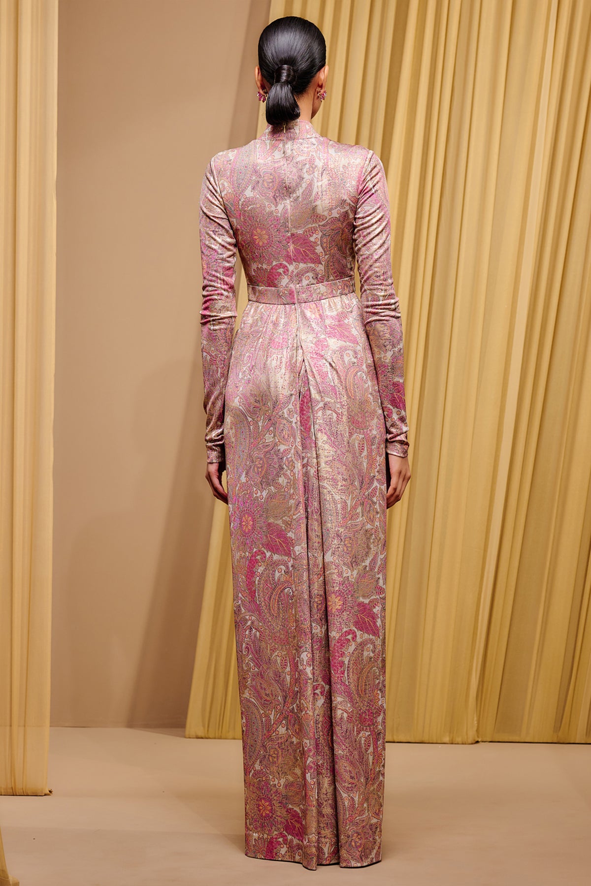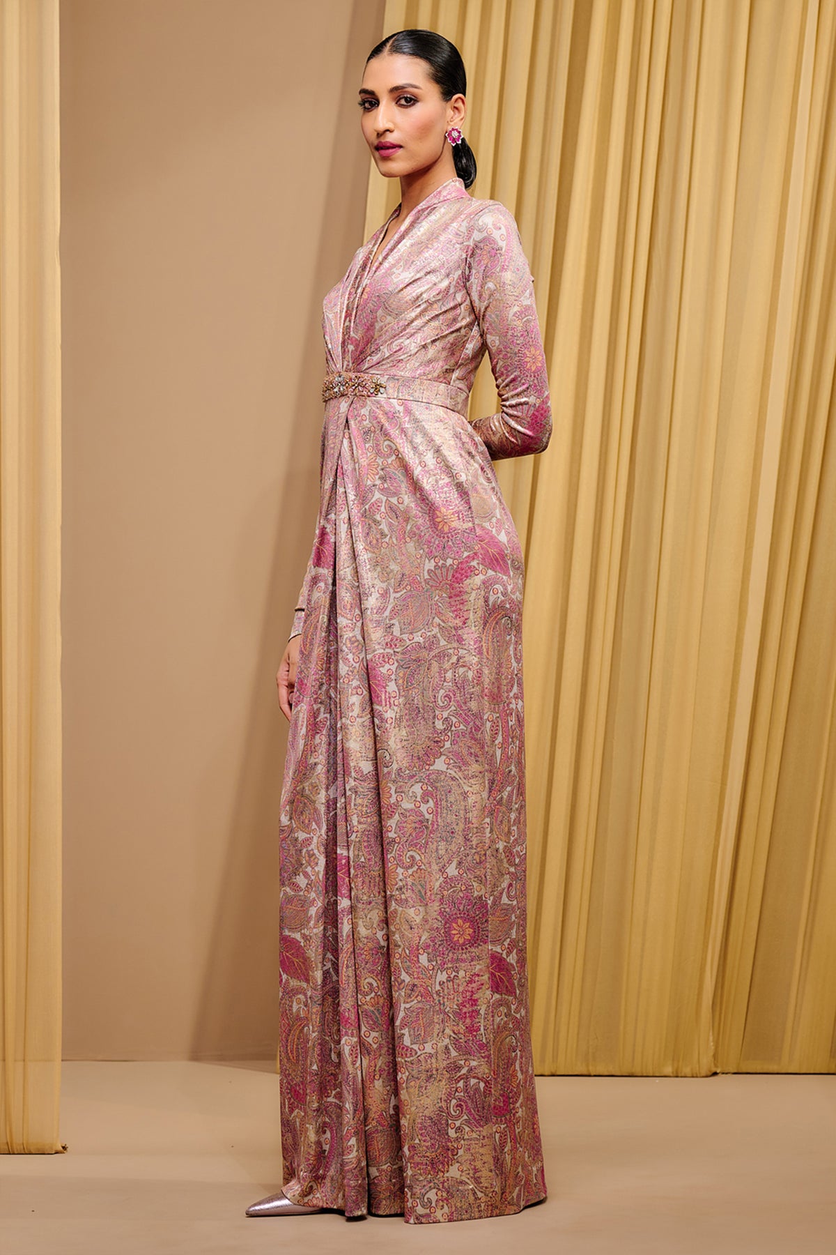 Classic jumpsuit in printed foil jersey, with crystal-embellished waist detailing