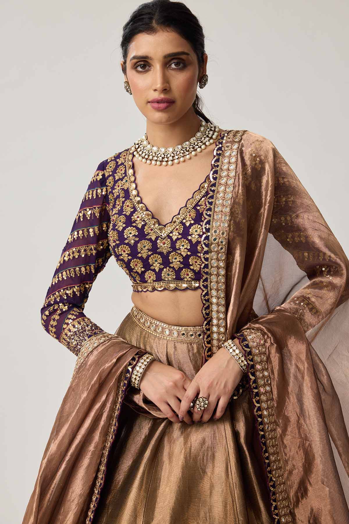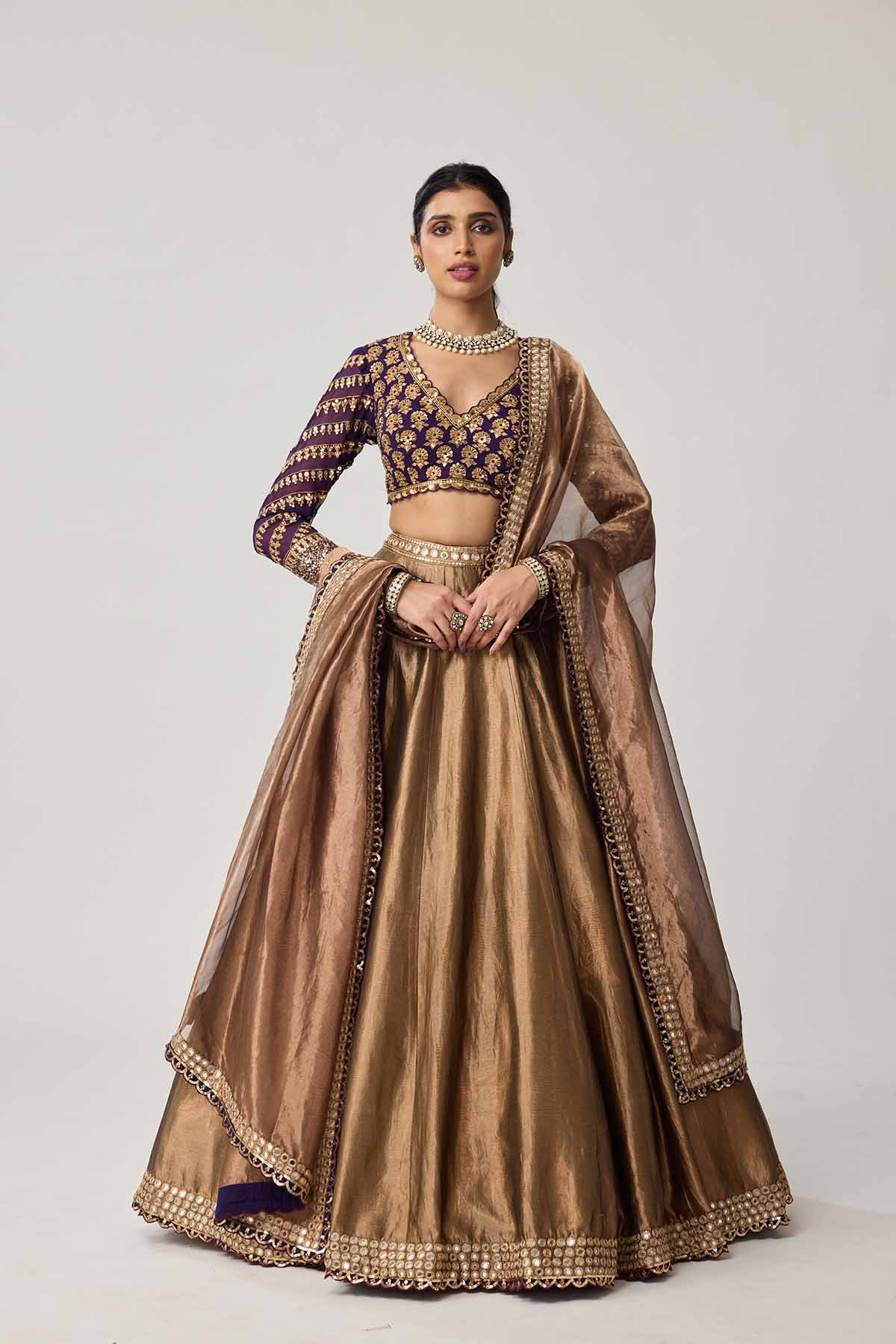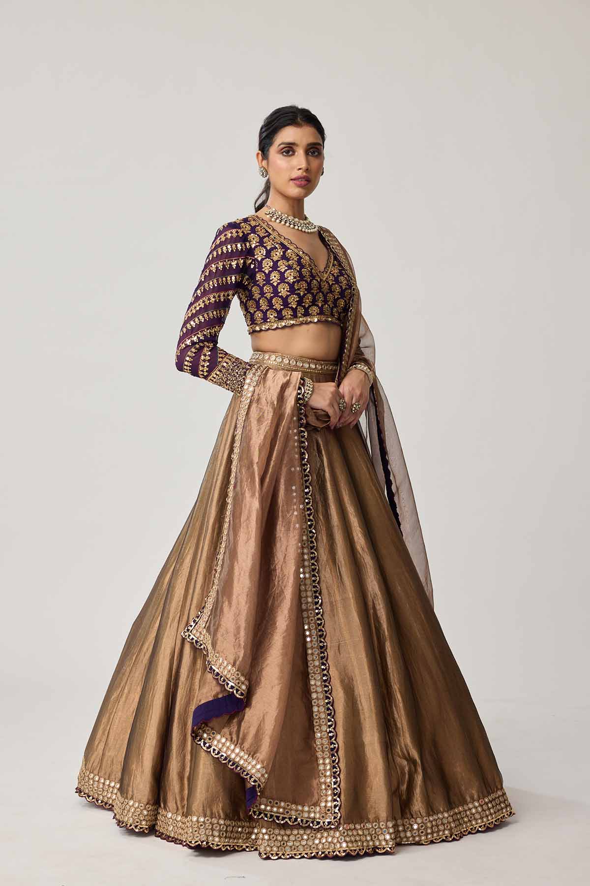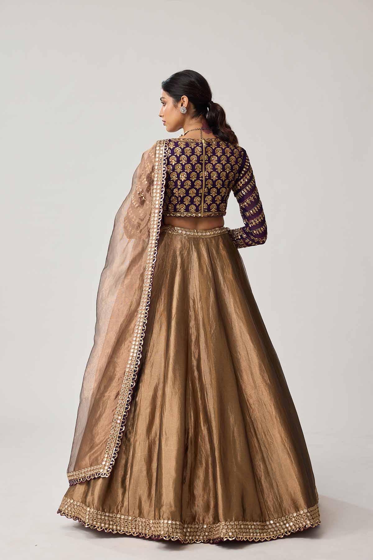 Copper shimmer organza lehenga and dupatta clubbled with mughal motif embroidered blouse.