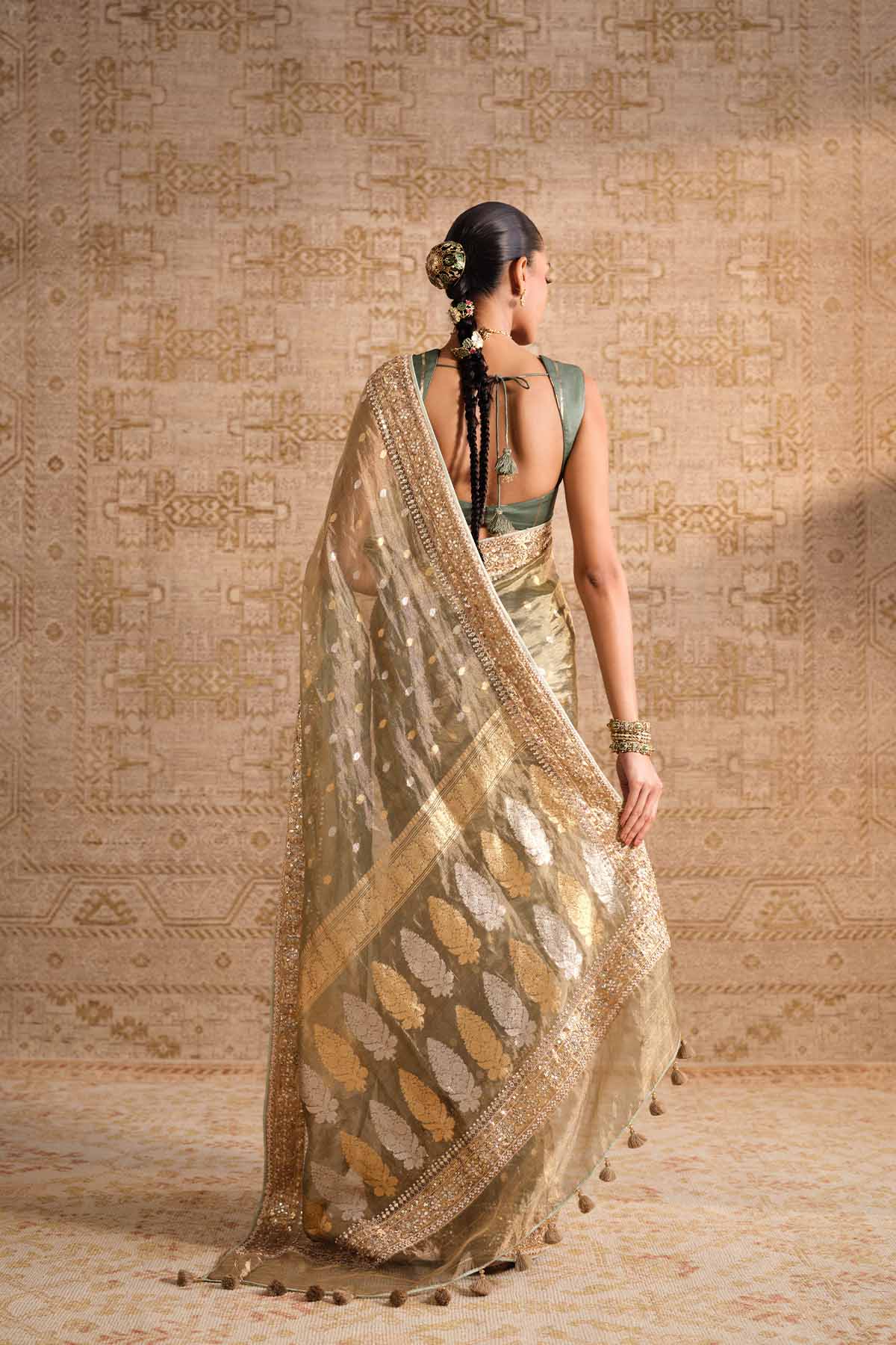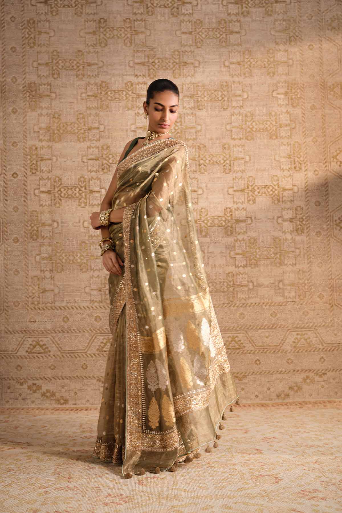 Elegant & diaphanous, our devya saree is handwoven by master artisans in benaras. Practiced & preserved across generations, the benarasi brocade is a centuries-old craft form & the epitome of heirloom indian crafts. This resplendent drape comes alive with motifs inspired by nature, is made from benarasi silk, and is elevated in our signature gota patti, cord, zardozi, pearl, beads & sequins.