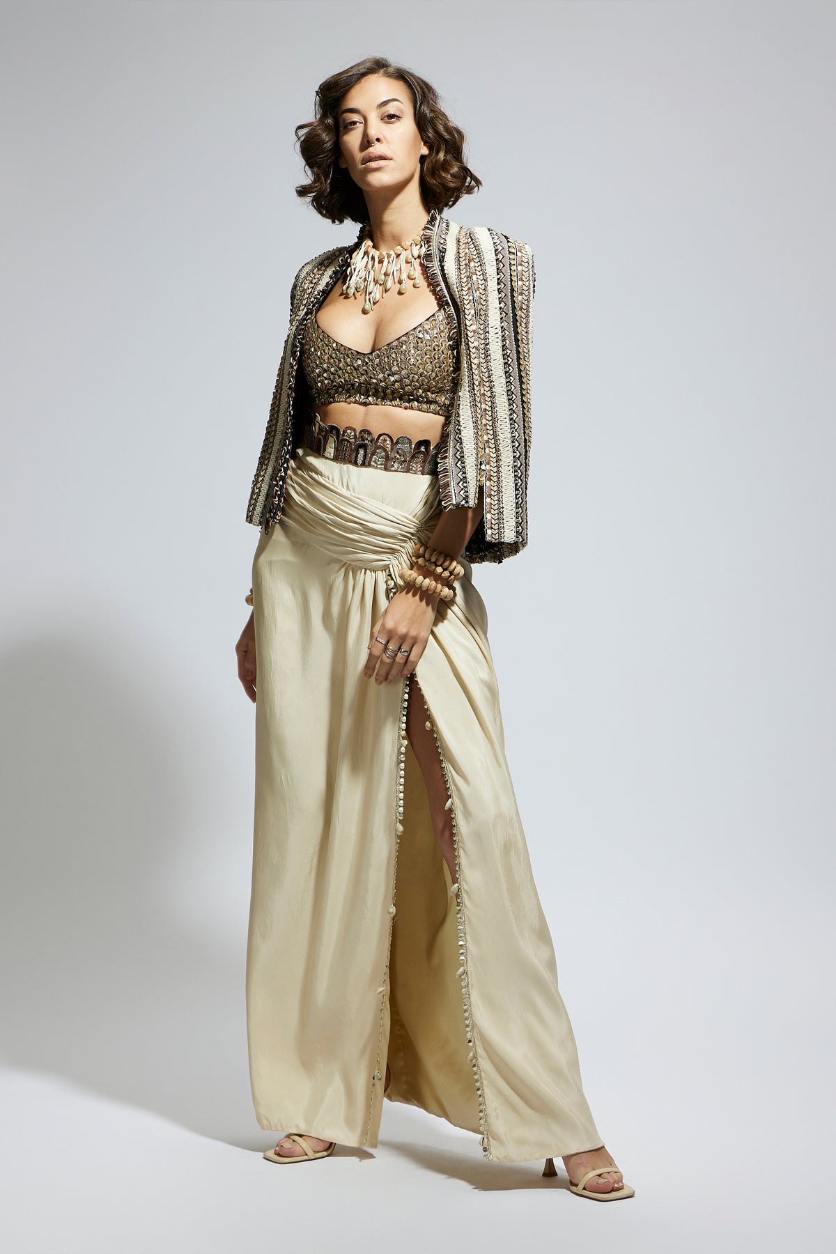 Embellished & textured cape jacket paired with metallic scallop bustier and ivory high slit skirt