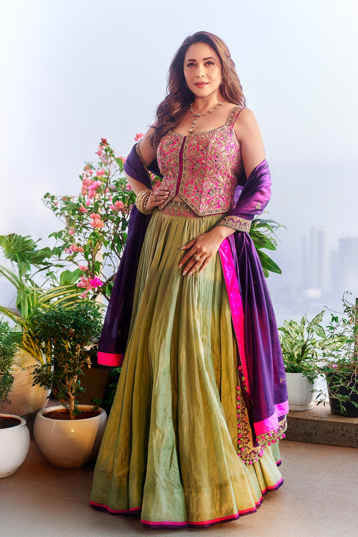 The gulabi gulaal waistcoat paired with a metallic tissue flared skirt featuring intricate marodi and salma work sounds exquisite! This combination offers a beautiful blend of traditional and contemporary styles. To complete the look, you might consider a light, airy dupatta that complements the colors and adds elegance.