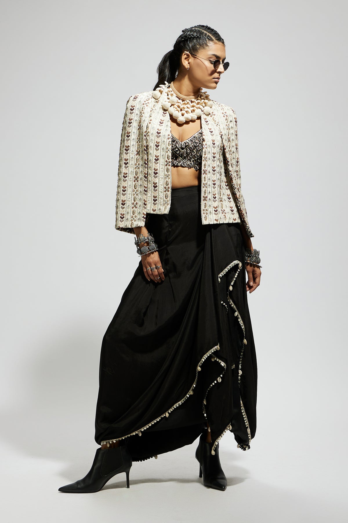 Ivory embellished cape jacket paired with textured bustier and drape skirt