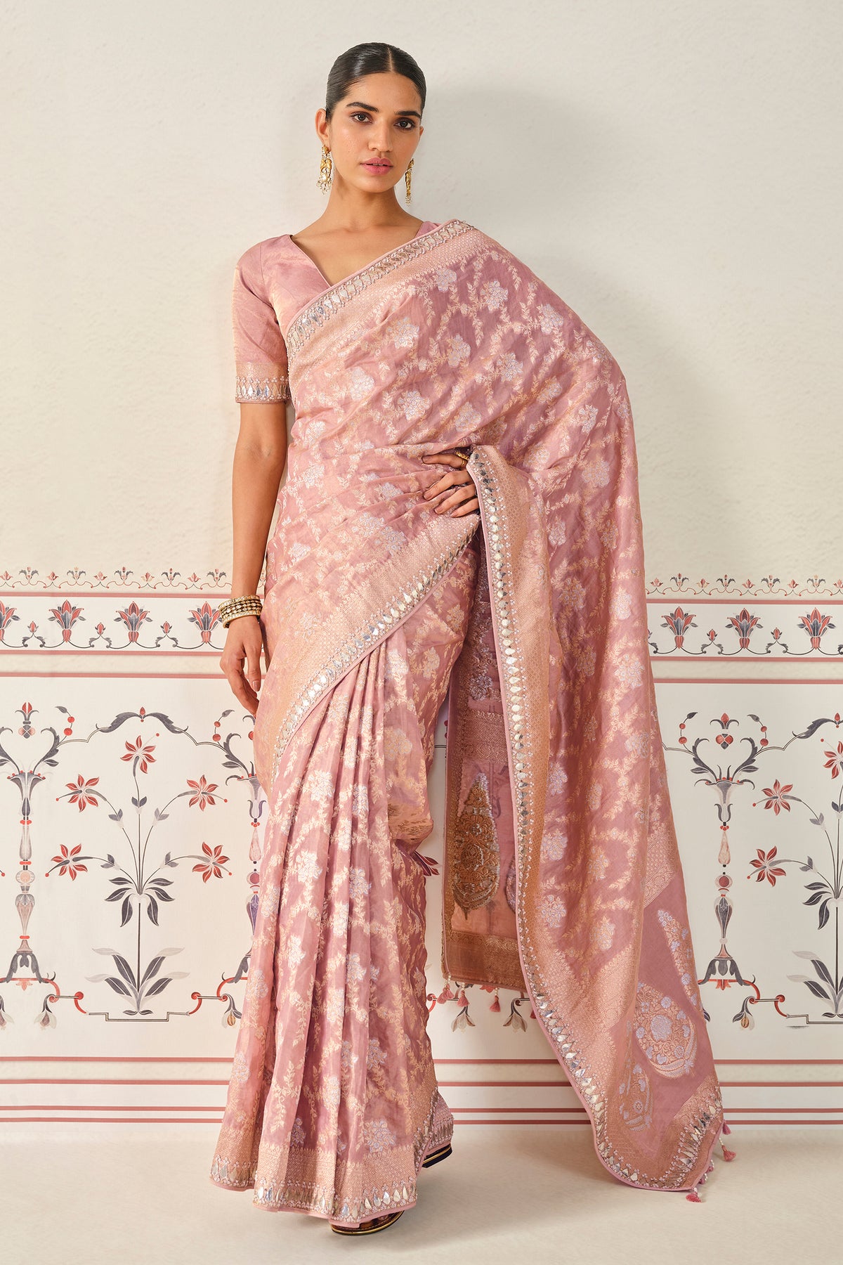 A subtly hued saree handwoven by the master artisans of benaras, this drape features resplendent nature-inspired motifs. An exquisite addition to your festive wardrobe, it is elevated in gota patti, zardozi, pearl embroidery, and sequins, making it perfect for every celebration.