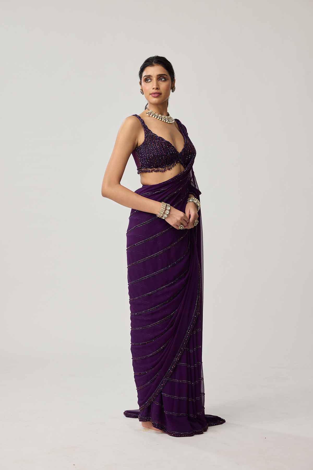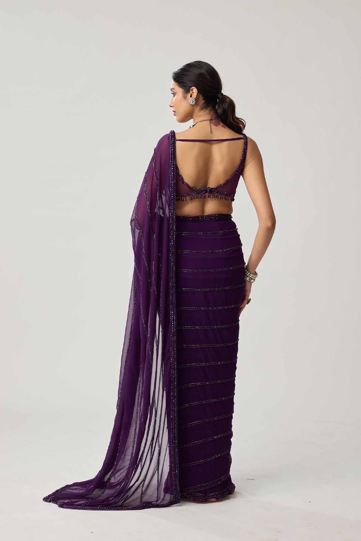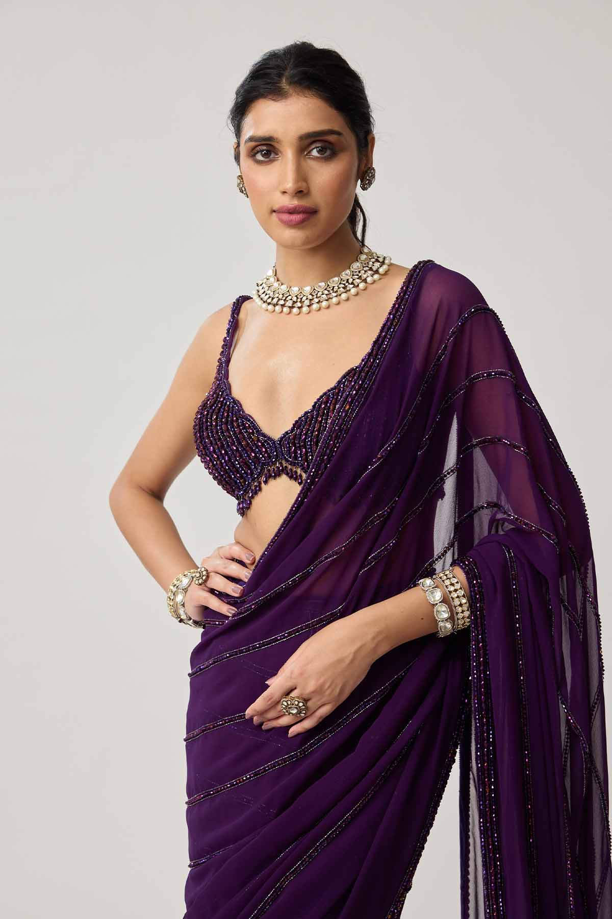 Royalty purple crystal embroidered georgette saree clubbed with crystal embroidered sleeveless blouse.