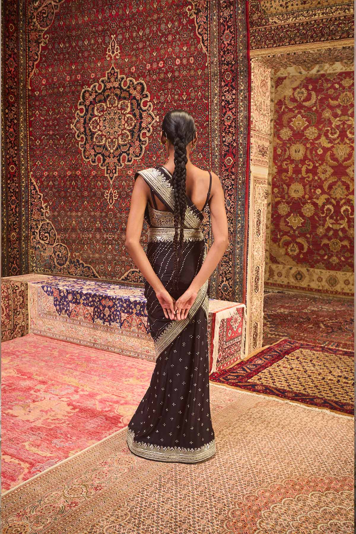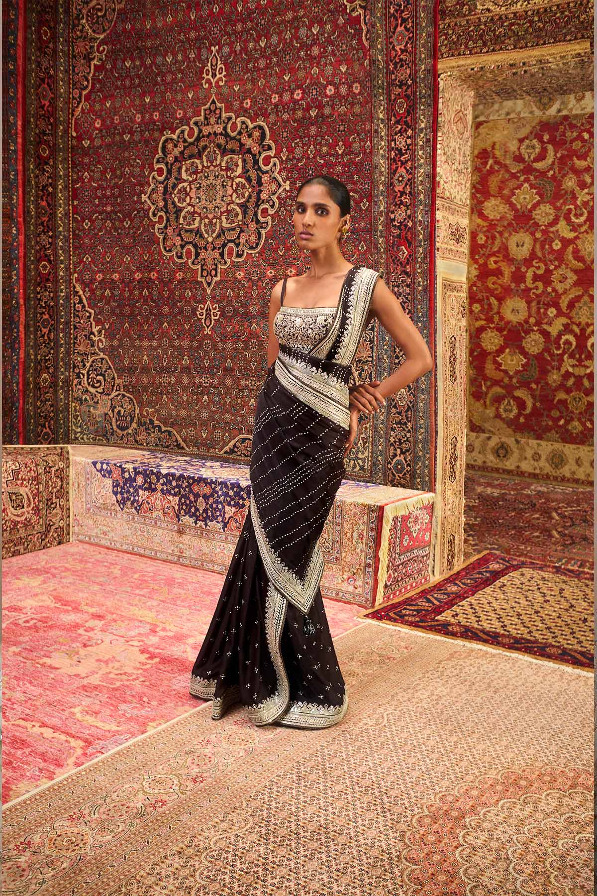 Our Shyamal Saree is inspired by the depths of overcast skies and features the craft of timeless Bandhani, handcrafted by women artisans. With its origins in Gujarat, this craft is created with practiced hands where each knot is tied with precision and then dyed to unveil beautiful patterns. Crafted as an heirloom piece to be passed on through generations, this saree is made from silk & is elevated in cord, zari, French knots, beads & sequins.