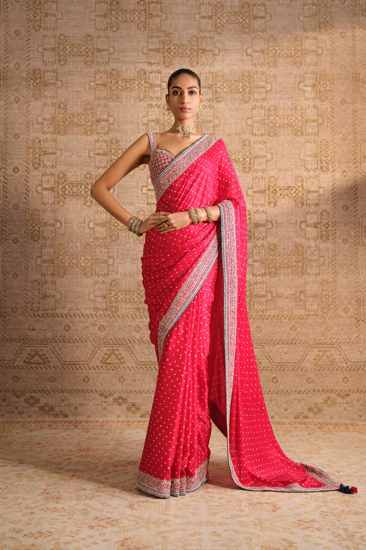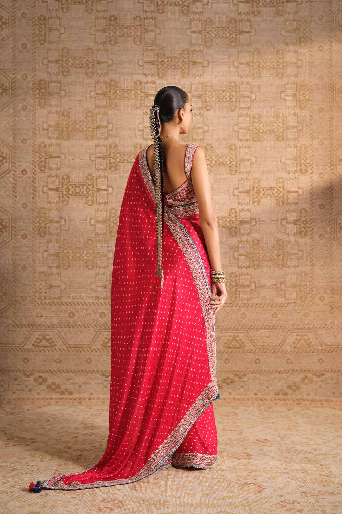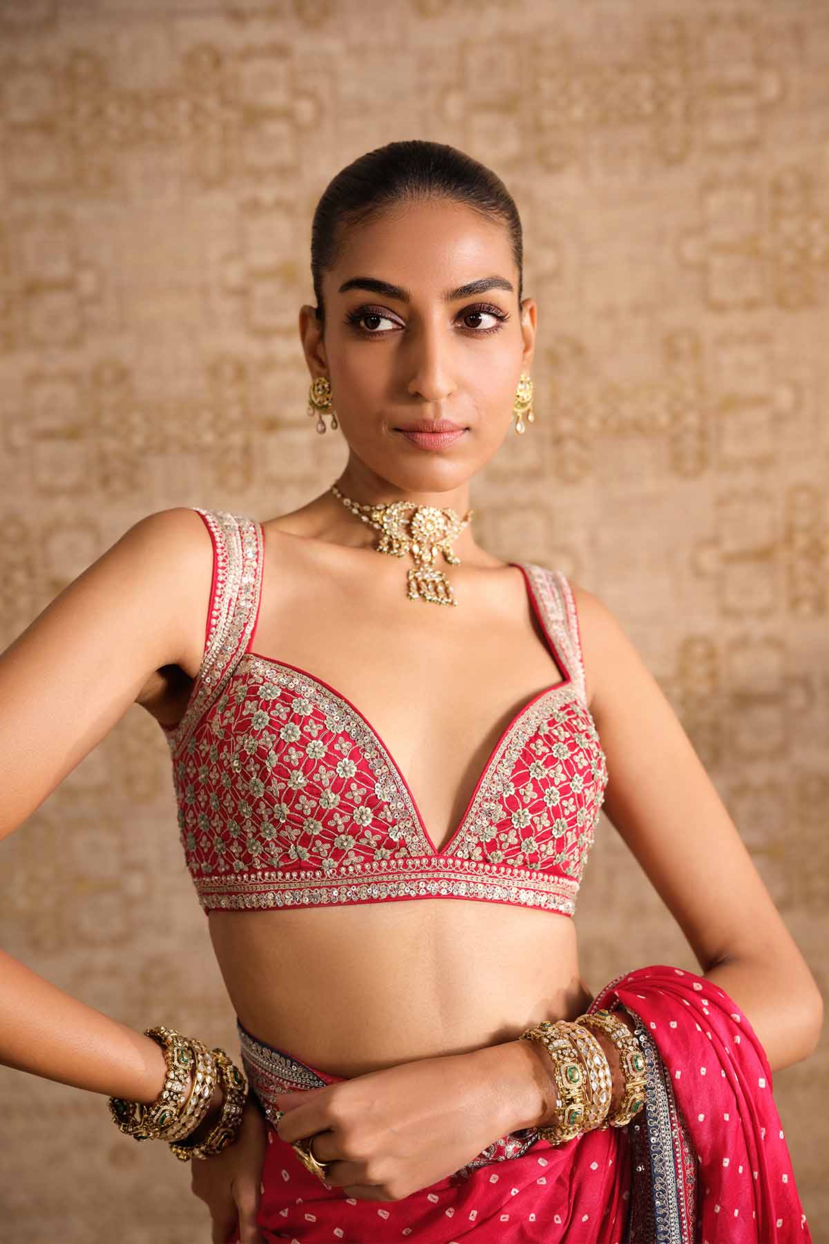 Crafted in a resplendent hue, synonymous with celebrations in India, our Sulohita Saree features the craft of timeless Bandhani, handcrafted by women artisans. With its origins in Gujarat, this craft is created with practiced hands where each knot is tied with precision and then dyed to unveil beautiful patterns. Crafted as an heirloom piece to be passed on through generations, this saree is made from silk & is elevated in cord, zari, French knots, beads & sequins.