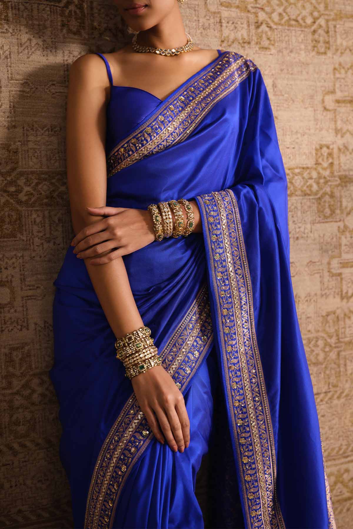 An archetype of elegance, Sumarni is handwoven by the master artisans in Benaras. Practiced & preserved across generations, the Benarasi brocade is a centuries-old craft form & the epitome of heirloom Indian crafts. Featuring a resplendent hue, this saree is made from Benarasi silk, and is elevated in our signature gota patti, cord, zardozi, pearls, beads & sequins.