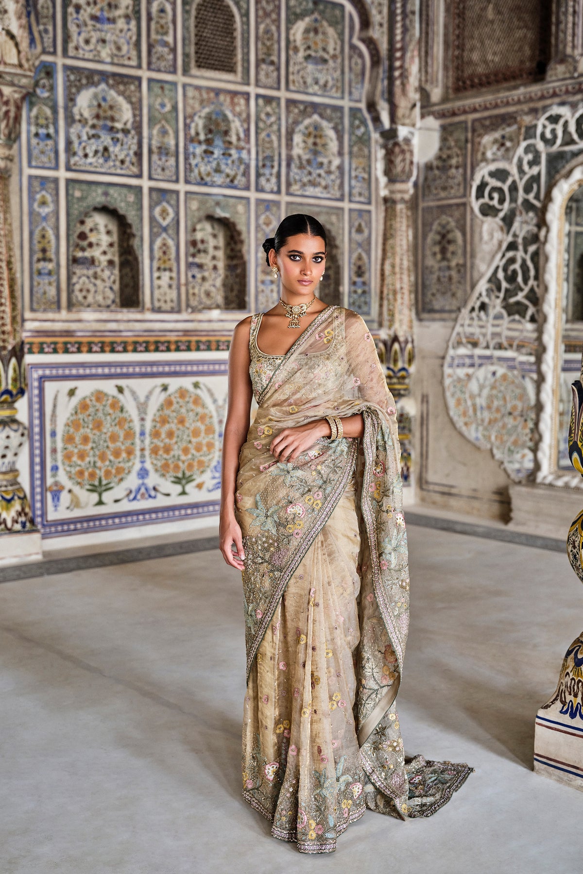 Embodying freedom and wonder, this stunning drape is for the bride whose soul seeks beyond. Featuring migrant tropical birds, this embroidered silk saree is a breathtaking tribute to nature with detailed zardozi craft, threadwork, and sequins.