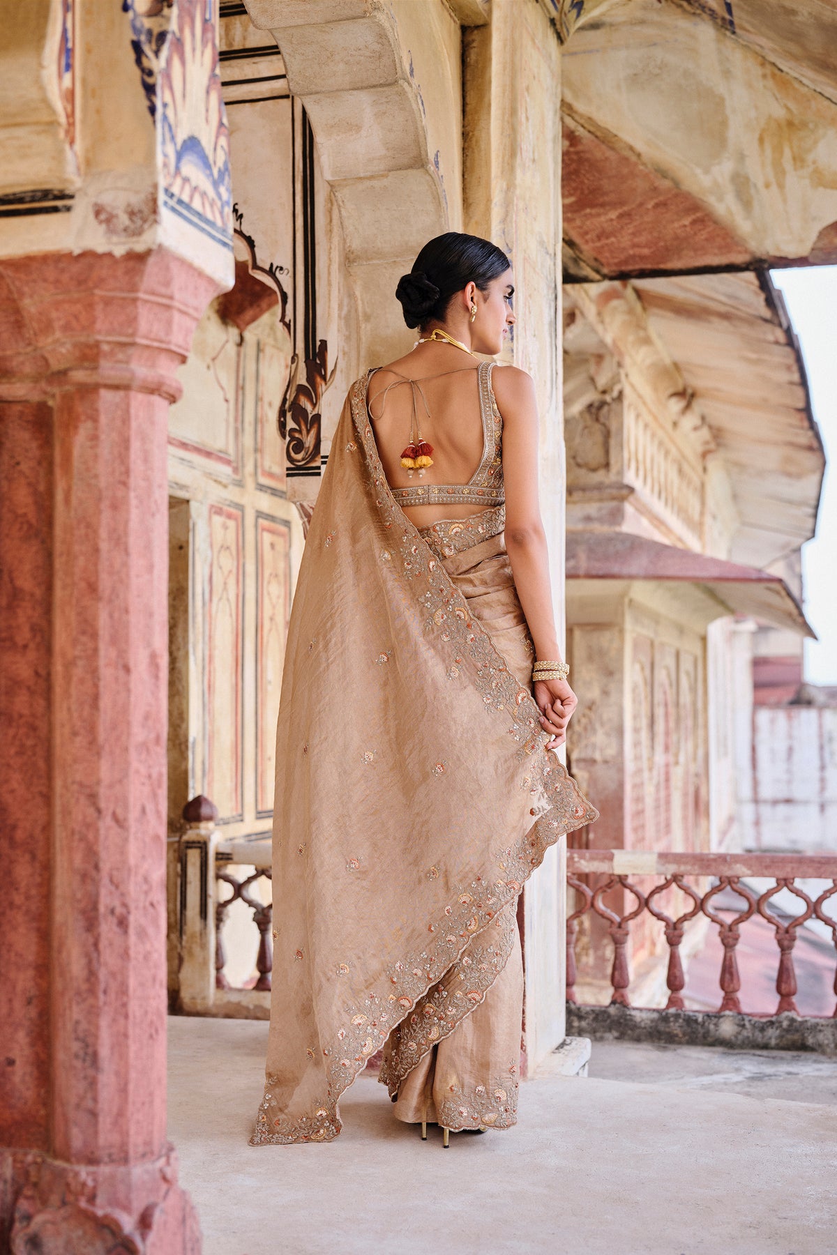 Designed to catch the light with its sheer texture, this elegant drape adds an incandescent glow to your look. Crafted in silk and featuring gota patti, zari and threadwork details.
