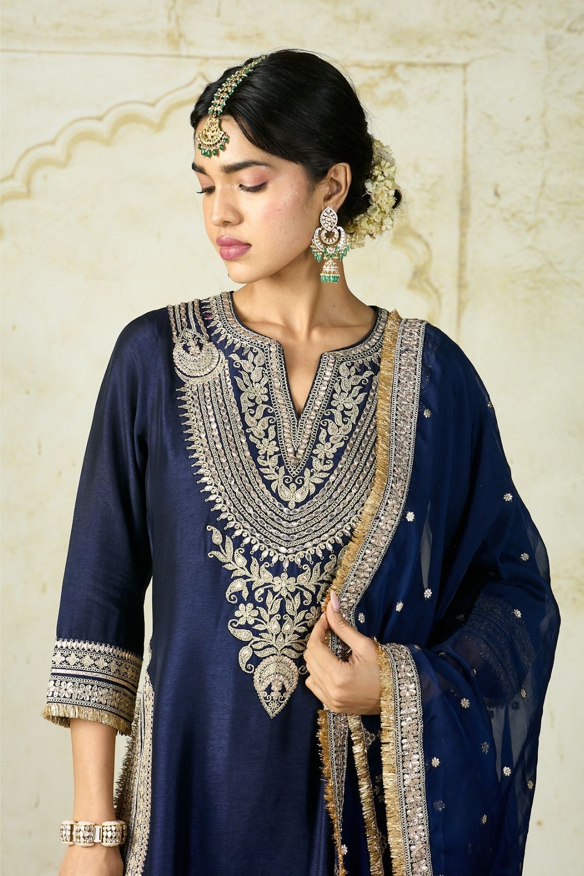 The straight-cut kurta is richly detailed with heavy embroidery along the neckline, sleeves, and hemline, creating a statement of timeless elegance. Paired with a flowy sharara adorned with intricate border, the ensemble exudes festive charm. The sheer dupatta, finished with delicate embroidery and a broad embellished edge.
