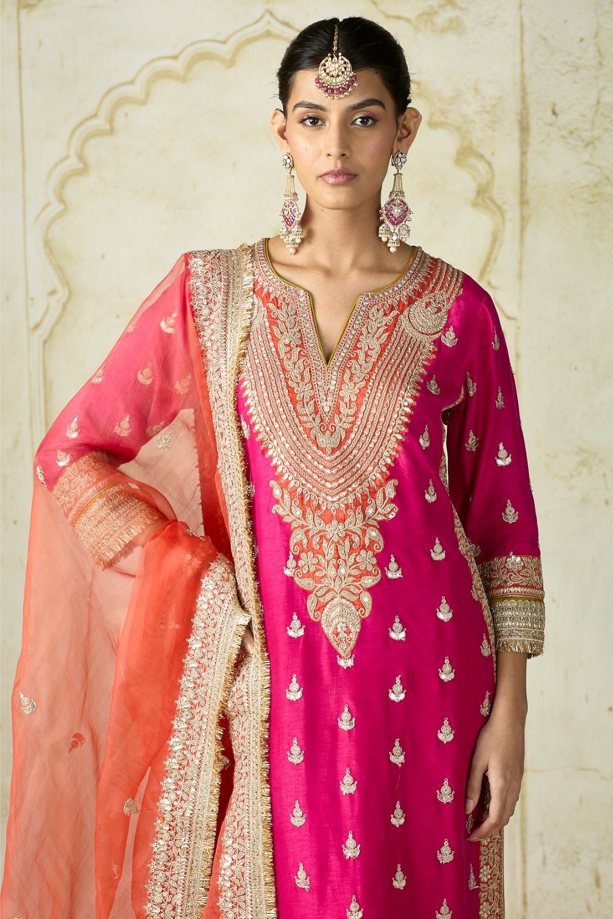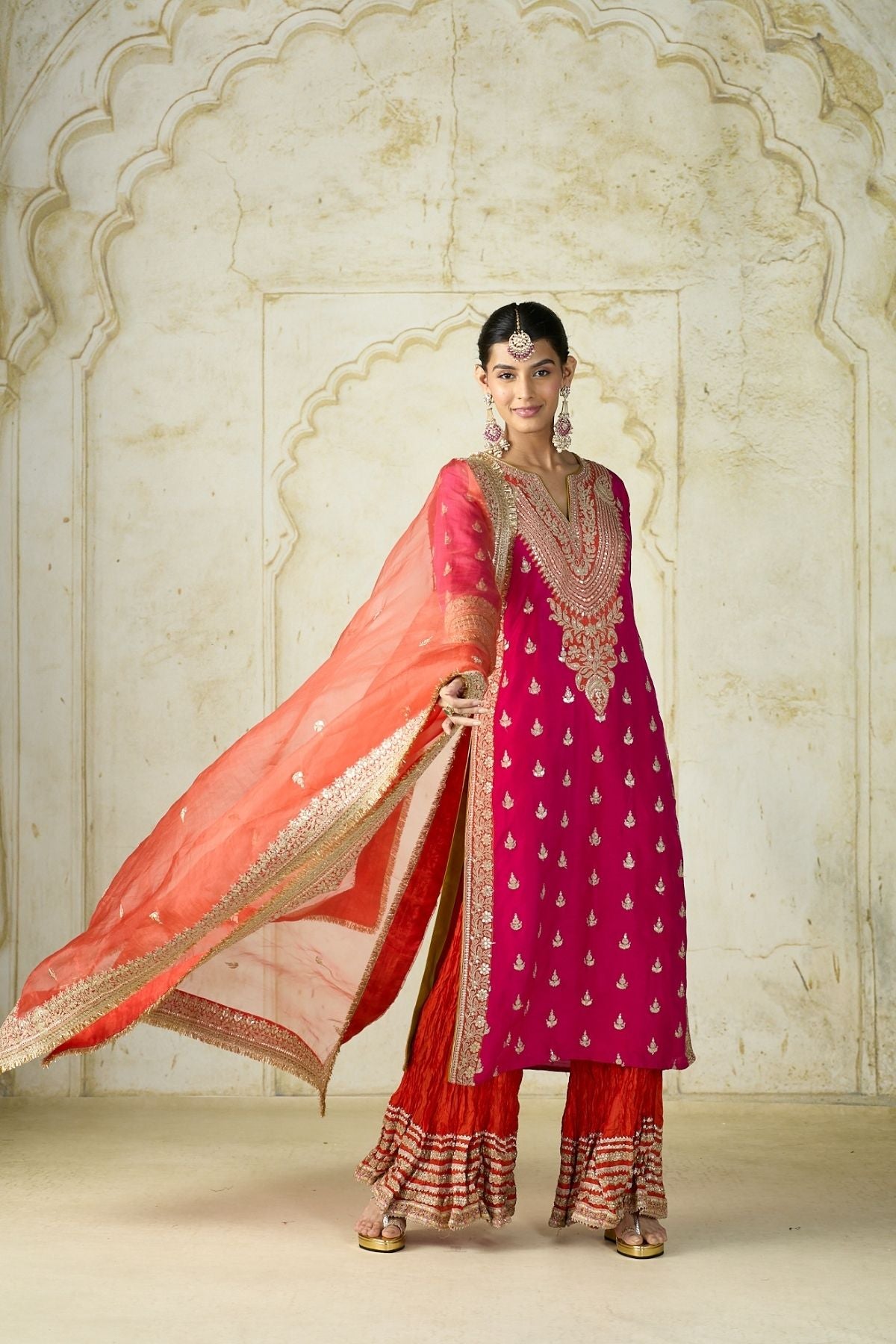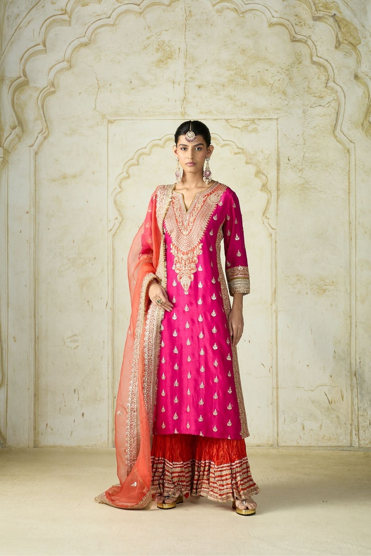 The straight-cut kurta features intricate work along the neckline and cuffs, with scattered motifs enhancing its regal appeal. Paired with a striking contrast crinkled sharara the ensemble balances bold color play with traditional charm. The sheer matching dupatta, finished with an embellished border and delicate motifs, completes the look with grace.