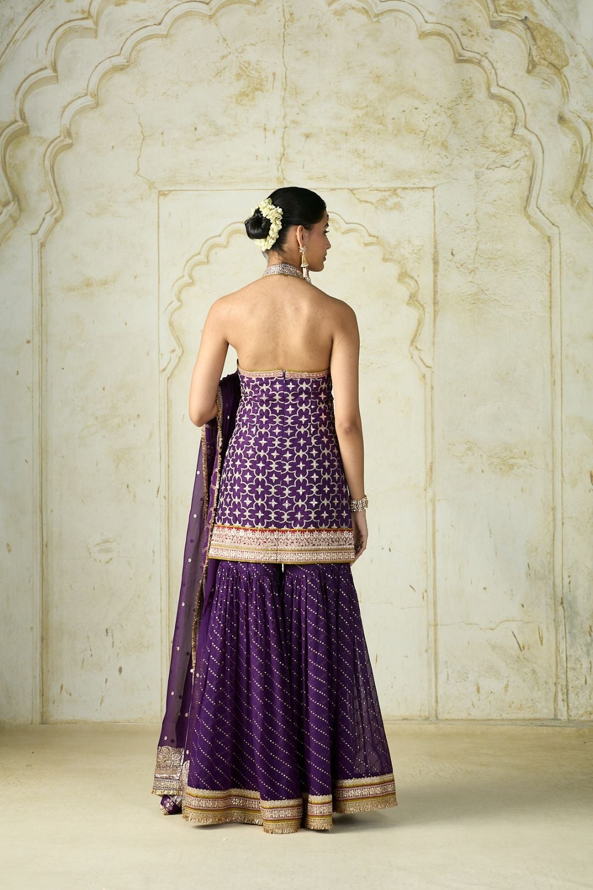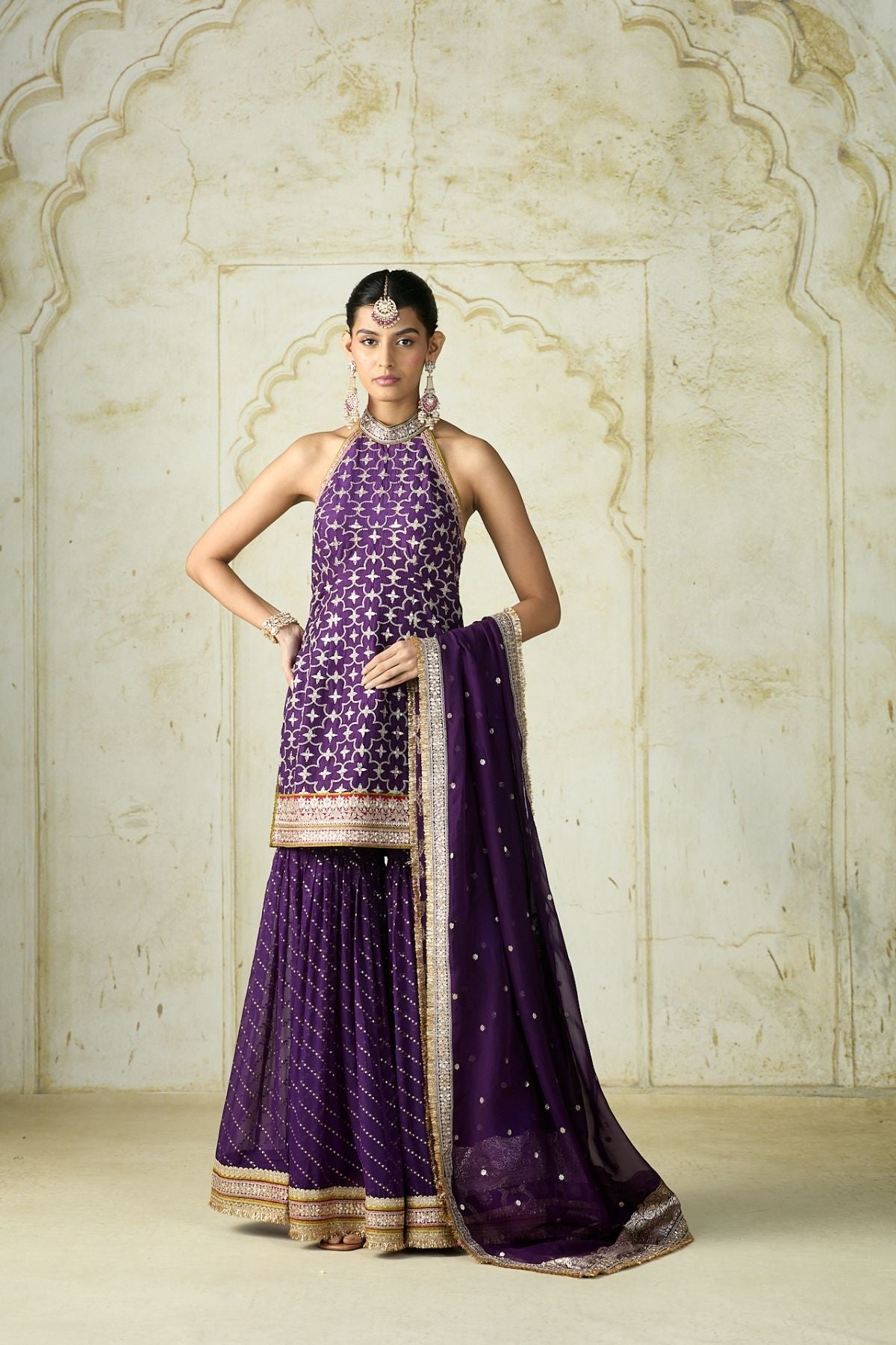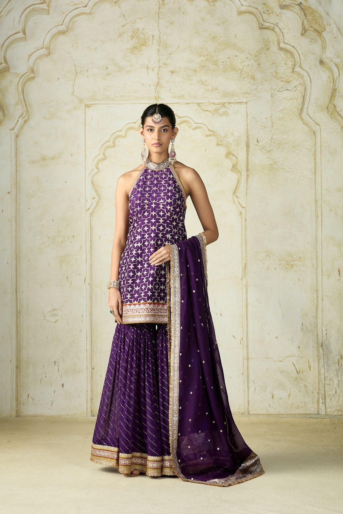 The halter kurta is adorned with intricate embroidery in a starry pattern, finished with an embellished hemline for a refined touch. Paired with a flared sharara in geometric lines and a broad embroidered border, the ensemble strikes a balance of grace and grandeur. The sheer dupatta, highlighted with scattered motifs and a rich border, completes the look.