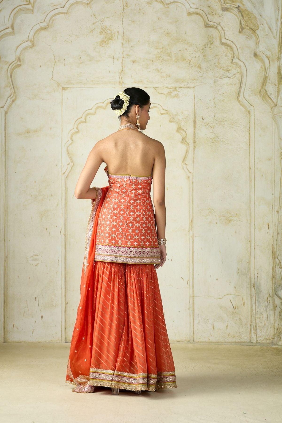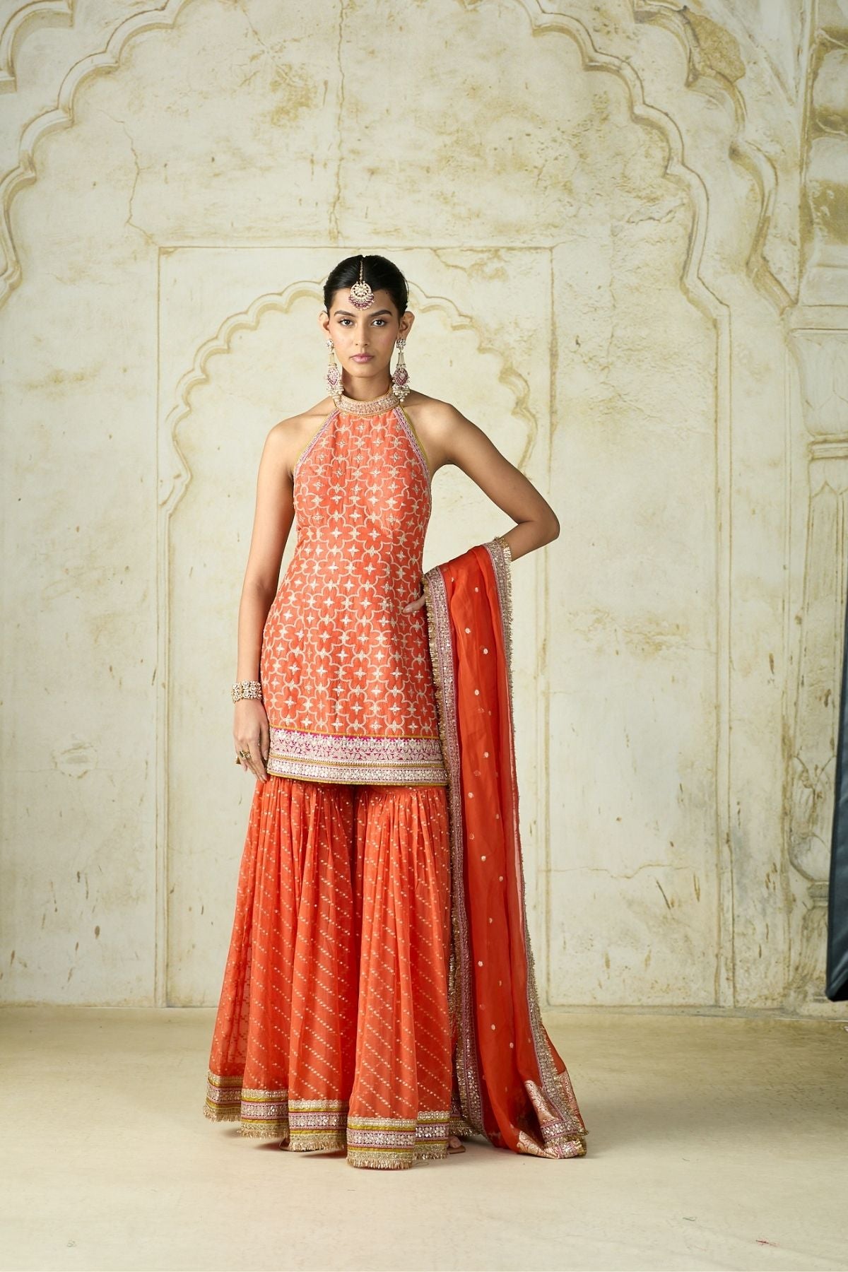 The halter kurta is adorned with intricate embroidery in a starry pattern, finished with an embellished hemline for a refined touch. Paired with a flared sharara in geometric lines and a broad embroidered border, the ensemble strikes a balance of grace and grandeur. The sheer dupatta, highlighted with scattered motifs and a rich border, completes the look.
