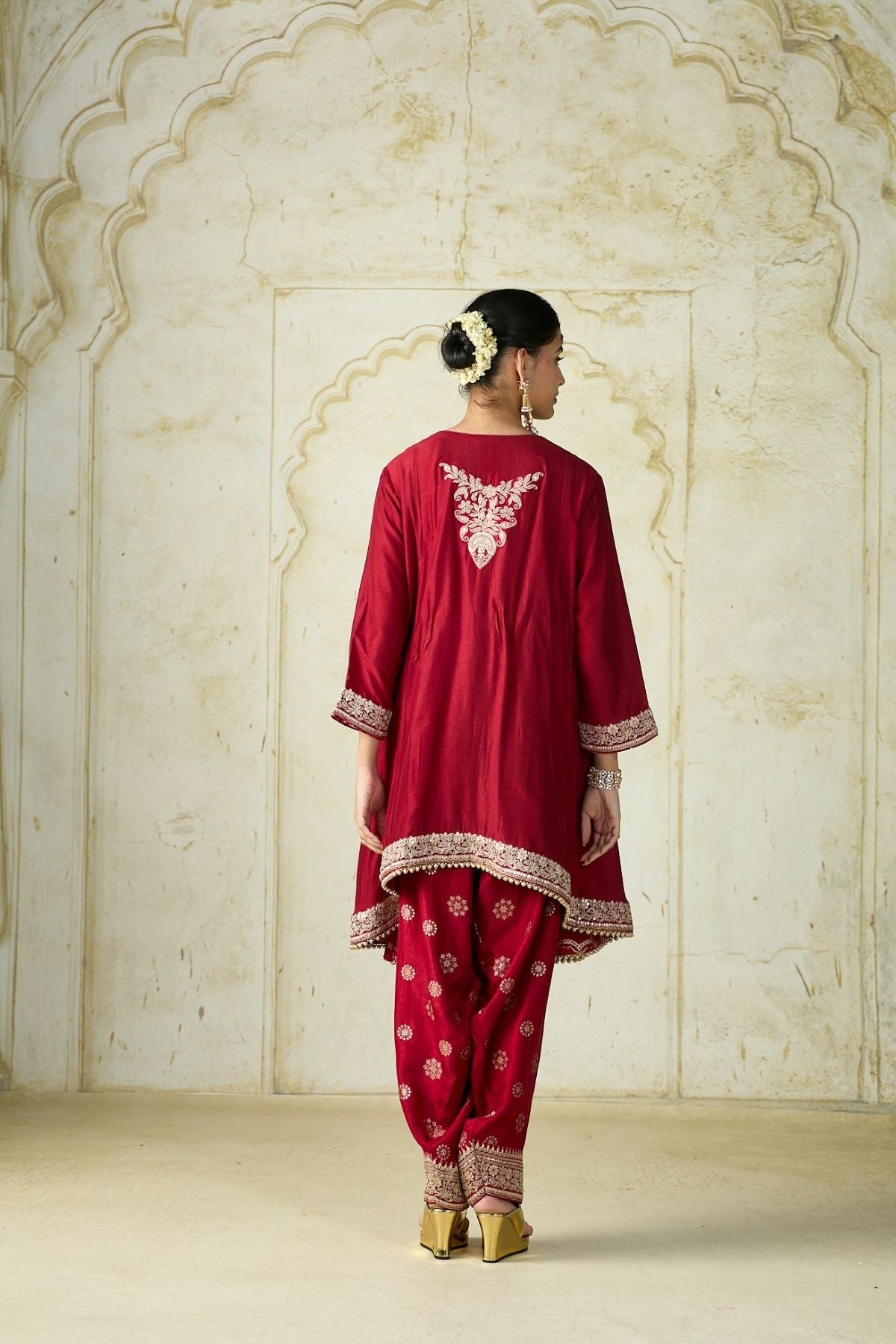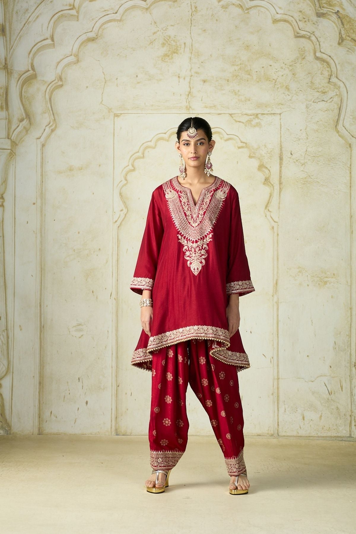 The asymmetrical kurta is adorned with intricate embroidery along the neckline, hem, and cuffs, adding a regal touch to the deep hue. Paired with a matching salwar featuring delicate motifs and a broad embroidered hemline, the ensemble captures the essence of traditional sophistication.