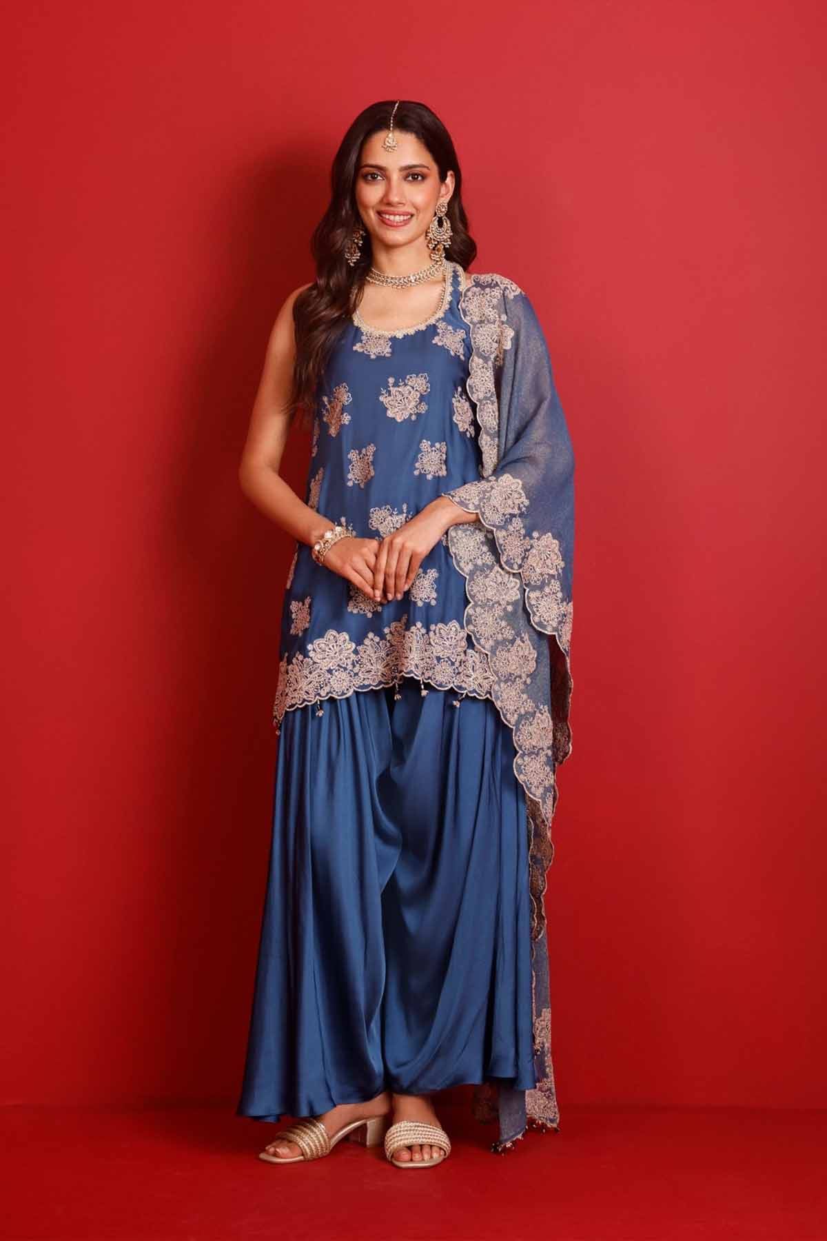 An elegant take on festive dressing — the pahi kurta set in navy redefines sophistication. The lustrous cupro satin kurta features intricate threadwork and an asymmetric silhouette that flatters every frame. Paired with fluid tissue draped pants and a glimmering lurex-insert dupatta, this set is made for intimate celebrations and evening soirées where comfort meets quiet glamour..