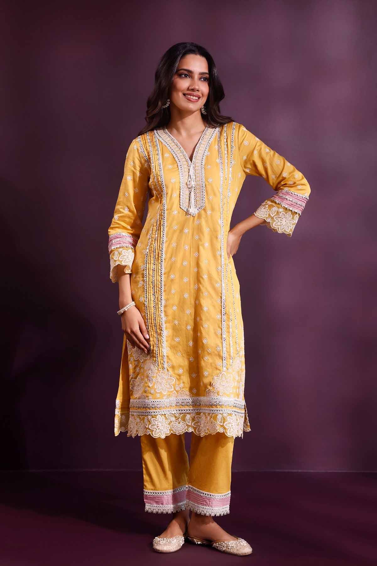 The pira kurta set in mustard radiates warmth and vibrance. Cut from fine pima satin, it features intricate lacework and embroidery that lend it a festive charm. Styled with matching pants this ensemble adds a soft romantic touch to celebratory dressing.
