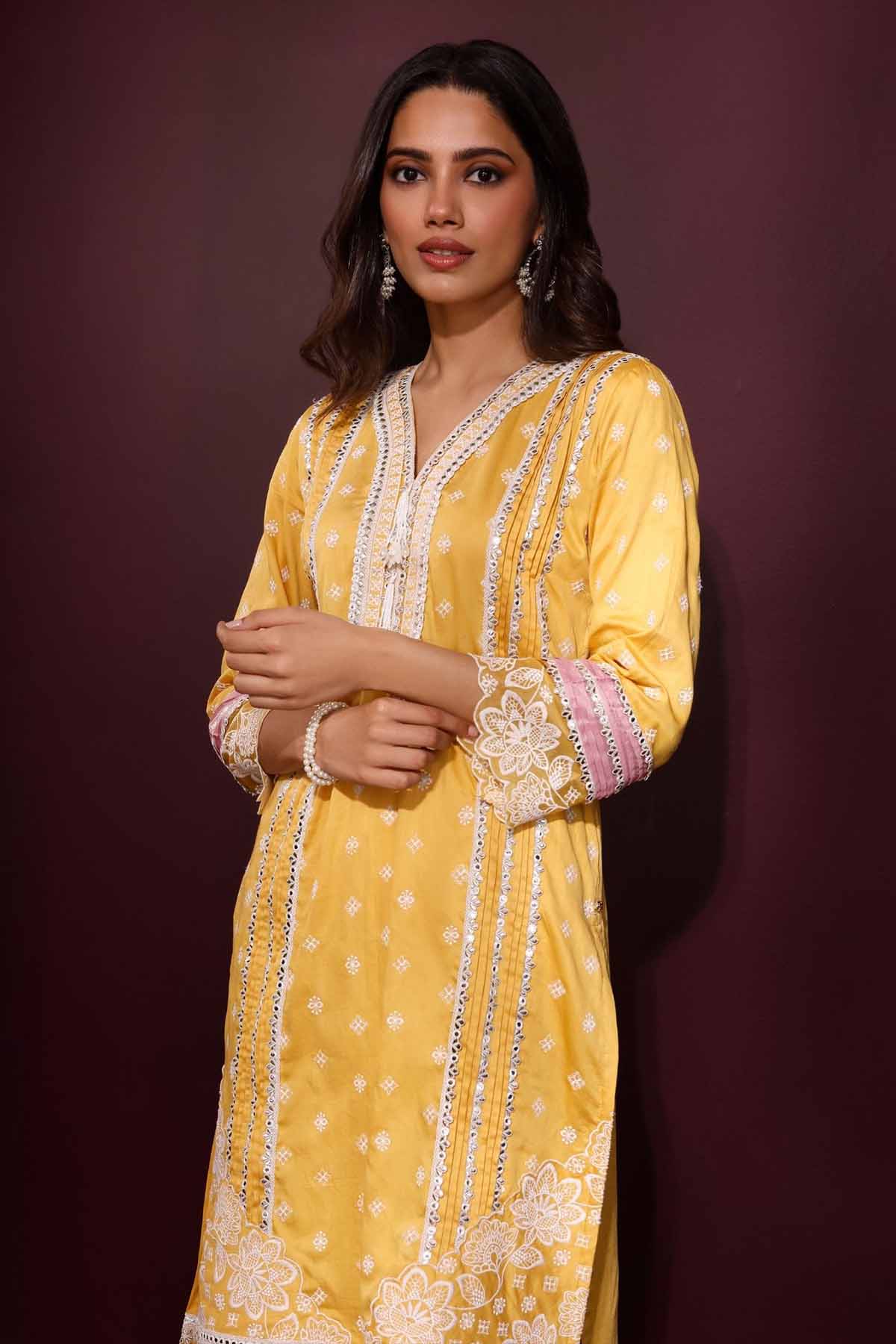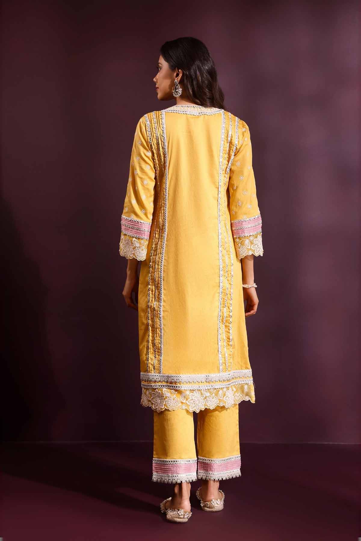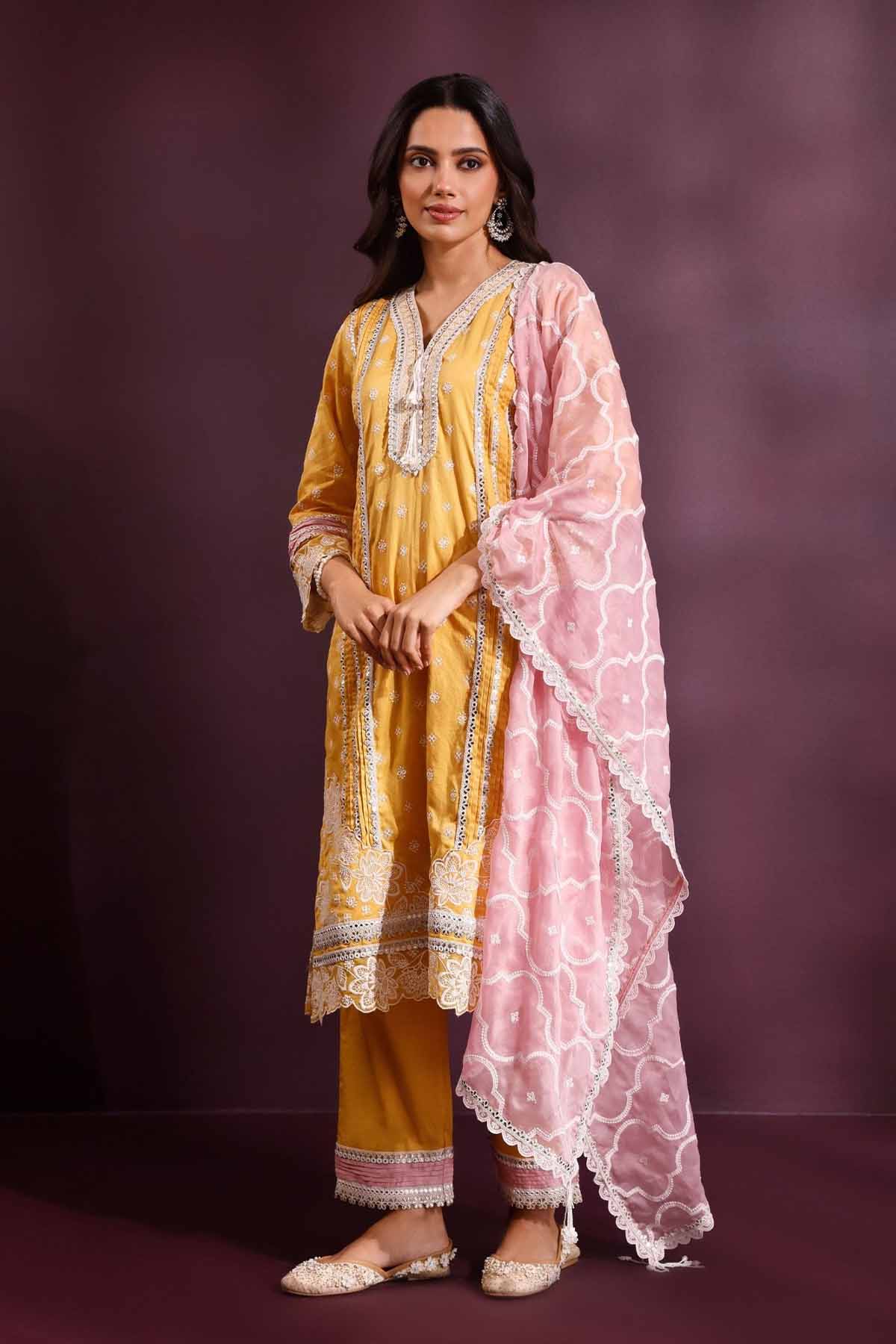 The pira kurta set in mustard radiates warmth and vibrance. Cut from fine pima satin, it features intricate lacework and embroidery that lend it a festive charm. Styled with matching pants and a pink organza dupatta detailed with lace borders, this ensemble adds a soft romantic touch to celebratory dressing.